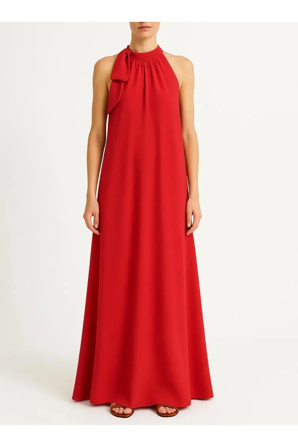Halter Yaka & Büzgü Detaylı Maxi Şık Dökümlü Krep Elbise