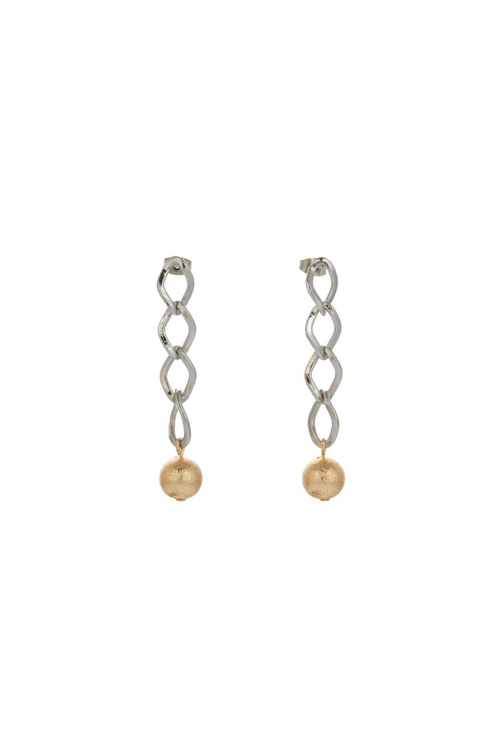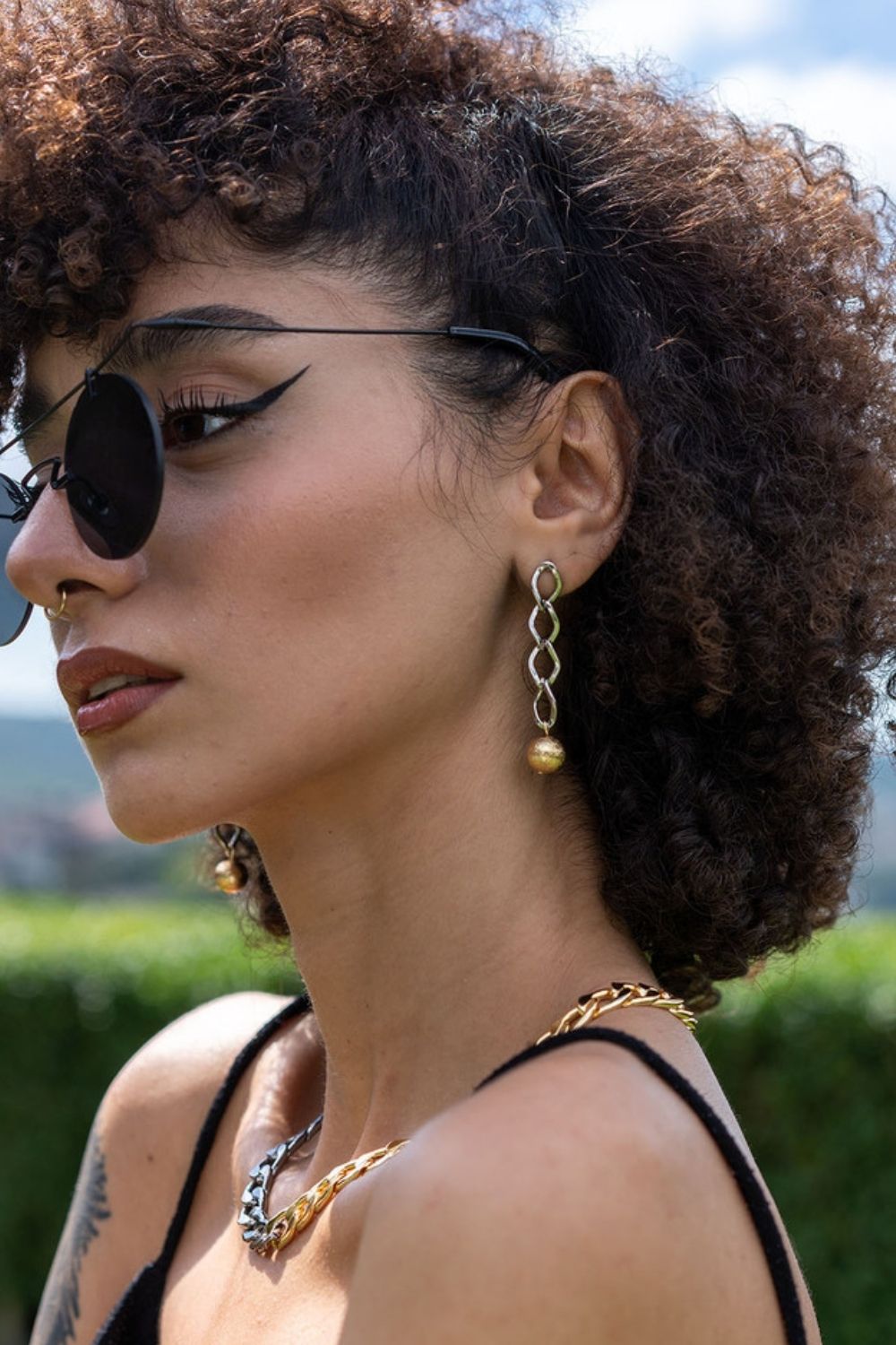 Dalga formundaki zinciri ve altın tonlu uç detayıyla Onda küpe, gümüş rengi (rhodium kaplama) ve sıcak altının zarif uyumunu taşır.