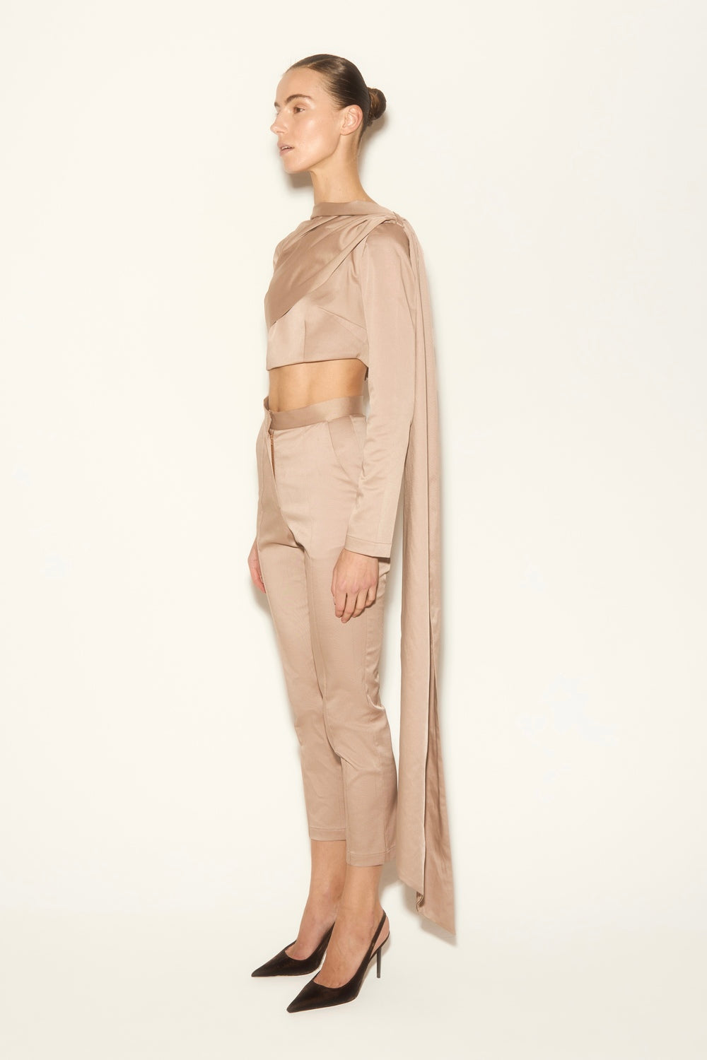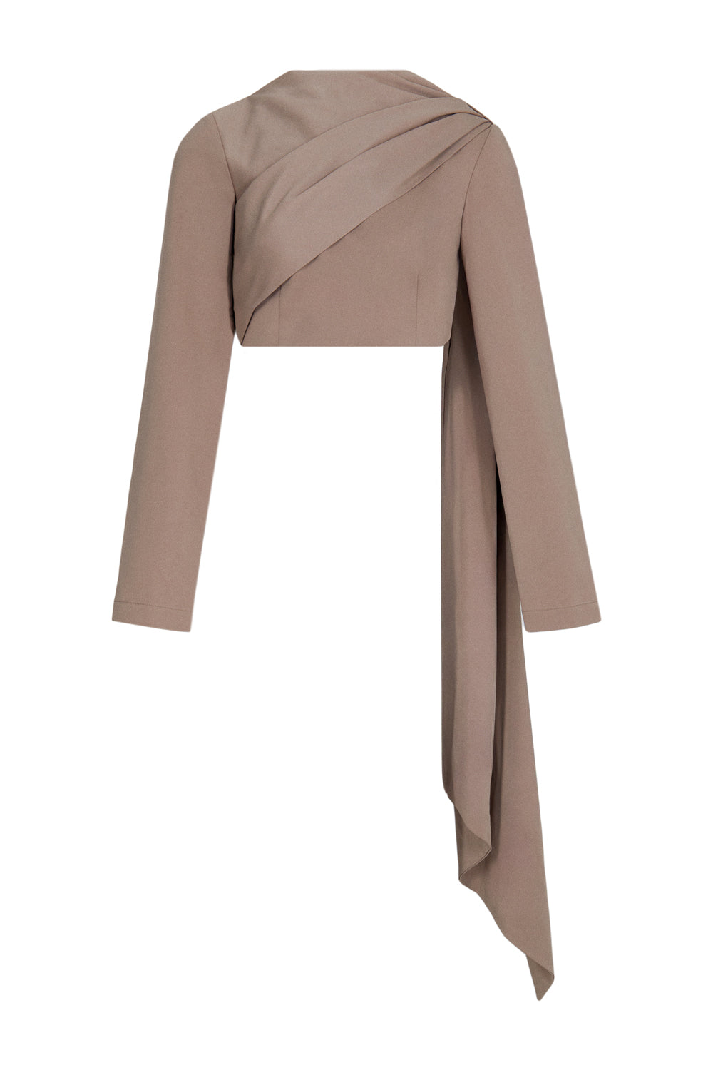 Vizon renk, tek omuzlu, drapeli, asimetrik kesim bluz