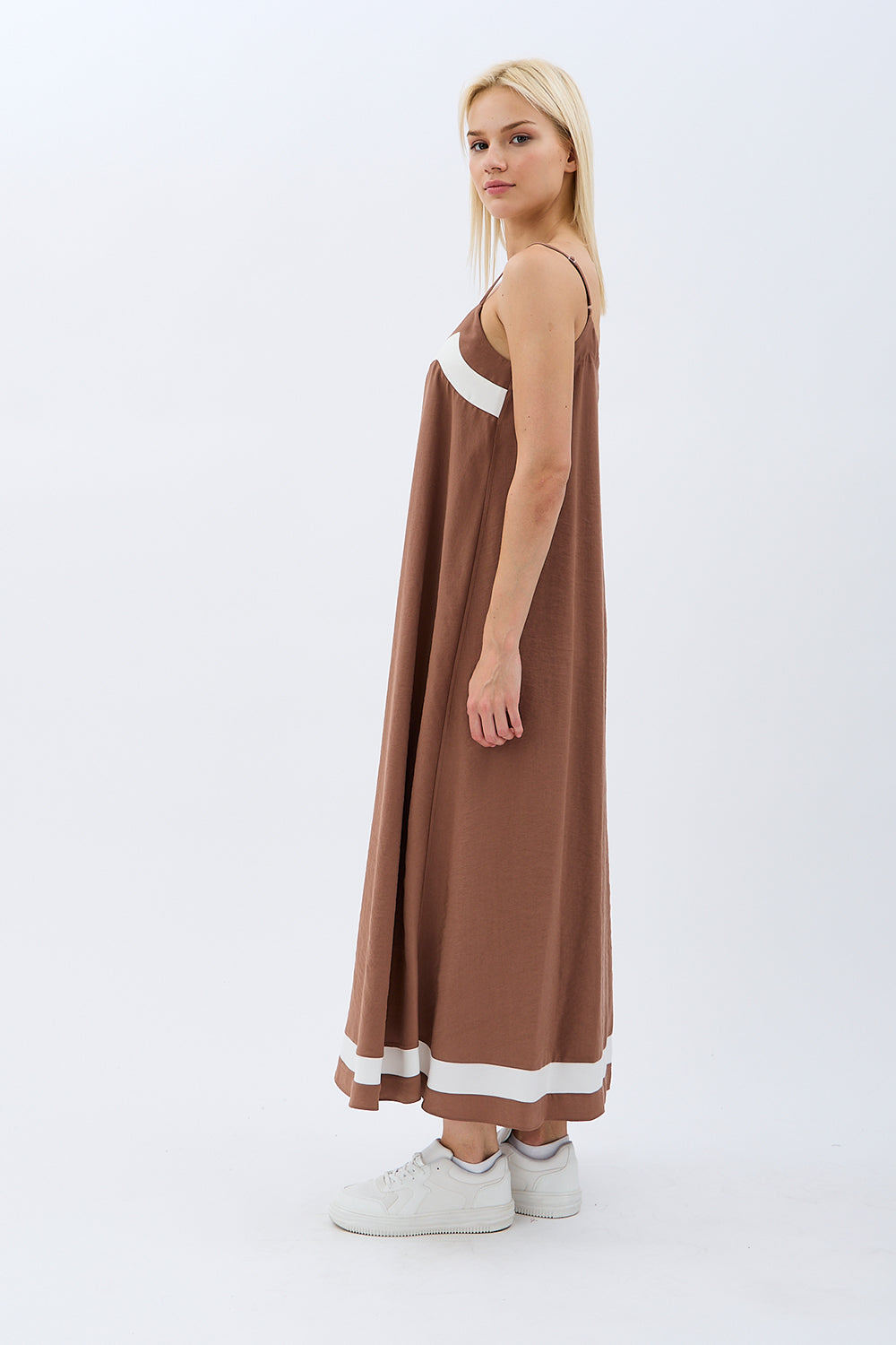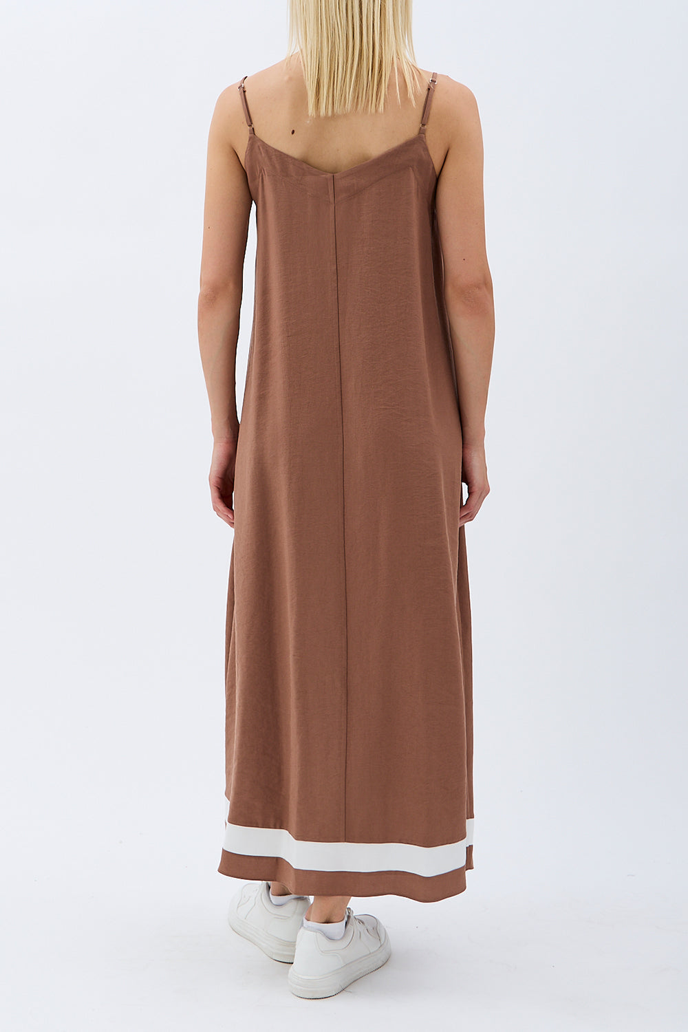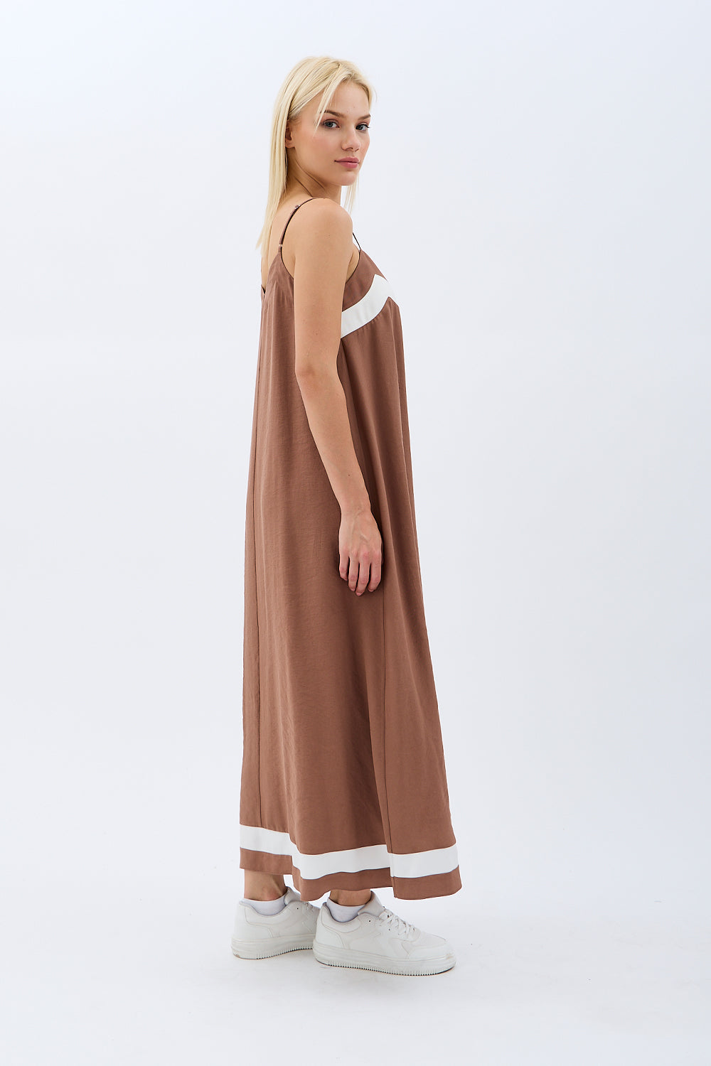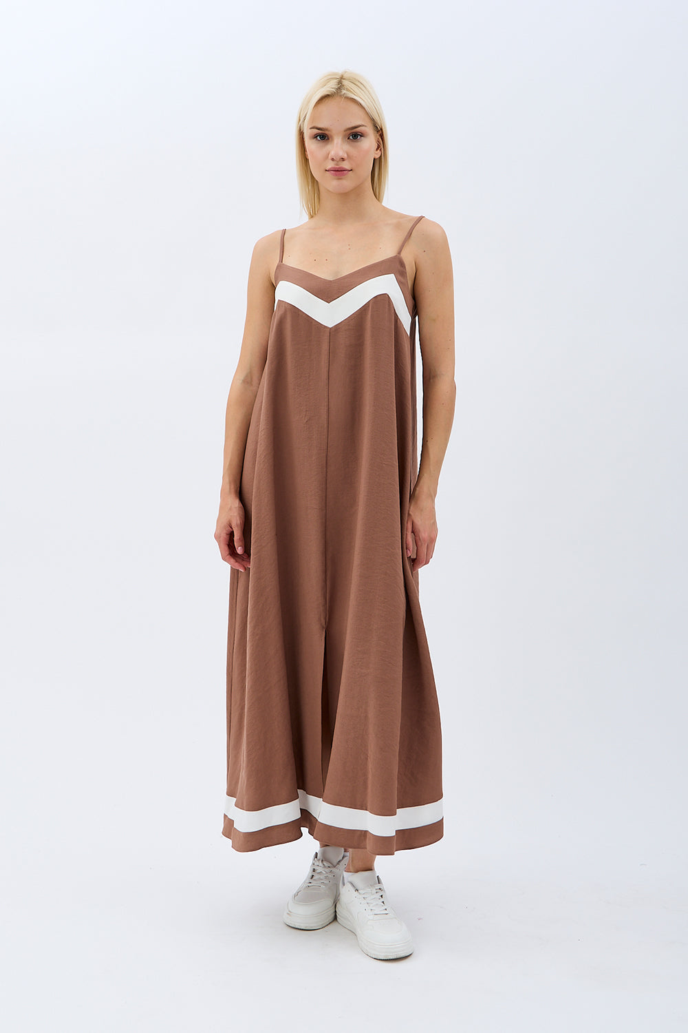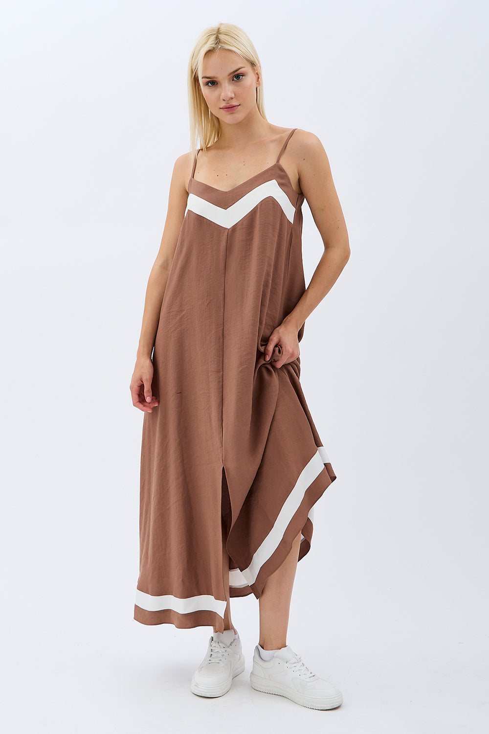 Şıklığı ve rahatlığı bir araya getiren bu elbise, ince ayarlanabilir askıları ve V formda yakasıyla zarif bir görünüm sunar. Kontrast blok renk detayı, modele modern ve dinamik bir hava katarken, yırtmaçlı asimetrik etek kesimi hareket özgürlüğü sağlar. Rahat geniş kesimiyle gün boyu konforlu kullanım sunar. %90 modal ve %10 PA karışımlı yumuşak dokulu kumaşı ile şıklığı hissettirir.