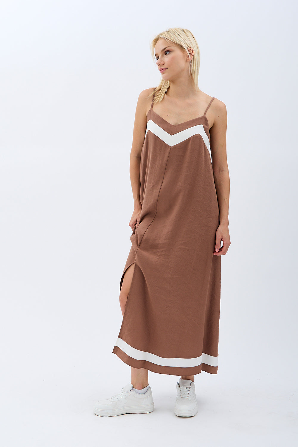 Model: İnce ayarlanabilir askı, V yaka, kontrast blok renk detayı, yırtmaçlı asimetrik etek, geniş kesim
