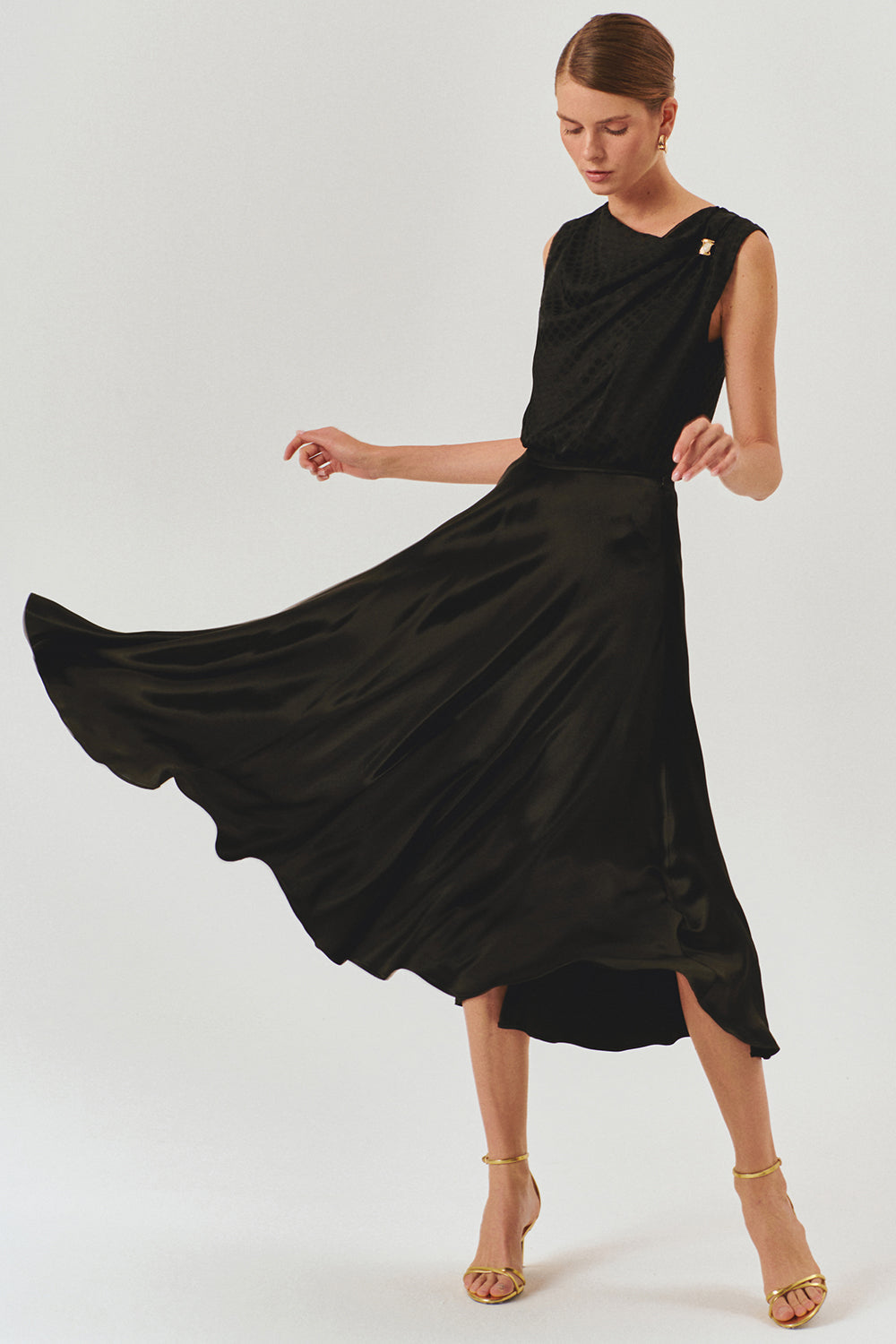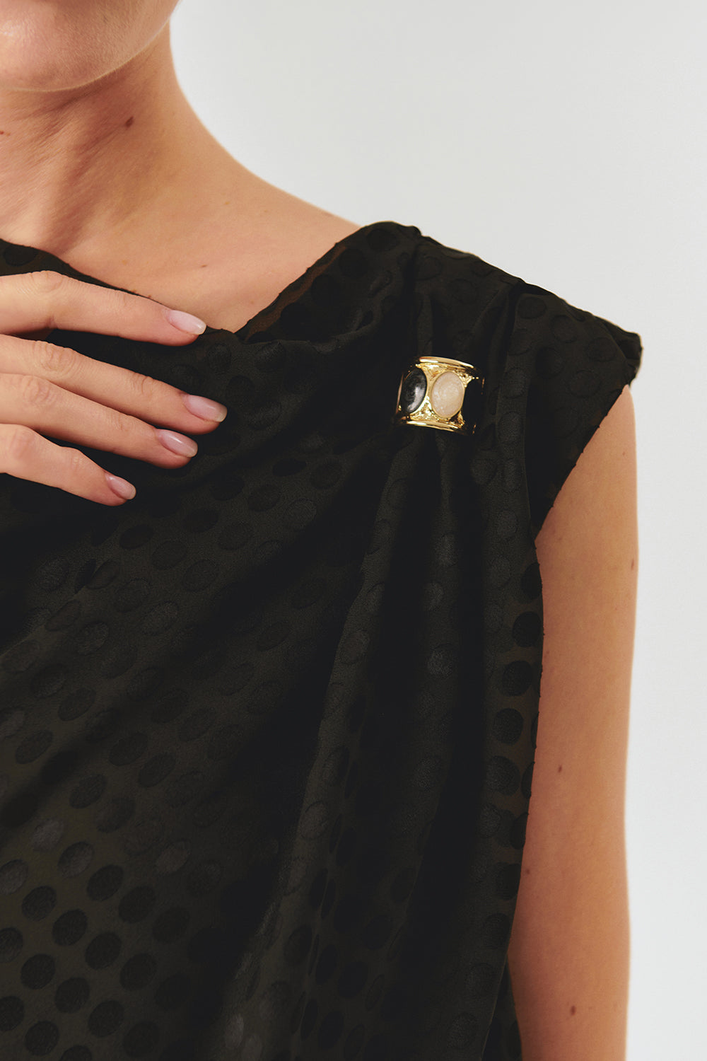 Minimalizmin çarpıcı gücü! Asimetrik yaka detayı, klasik siyah bluzu modern bir dokunuşla yorumlarken, kolsuz kesimi zarif ve özgür bir siluet sunuyor. Regular fit kalıbı, vücuda rahat bir şekilde oturarak gün boyu konfor sağlarken, akışkan kumaşı hareketinize eşlik eder.Gündüzden geceye kolayca uyarlanabilen bu bluz, şık pantolonlarla zamansız bir ofis stili, pileli eteklerle romantik bir dokunuş veya denimlerle casual bir şıklık yaratmak için ideal.