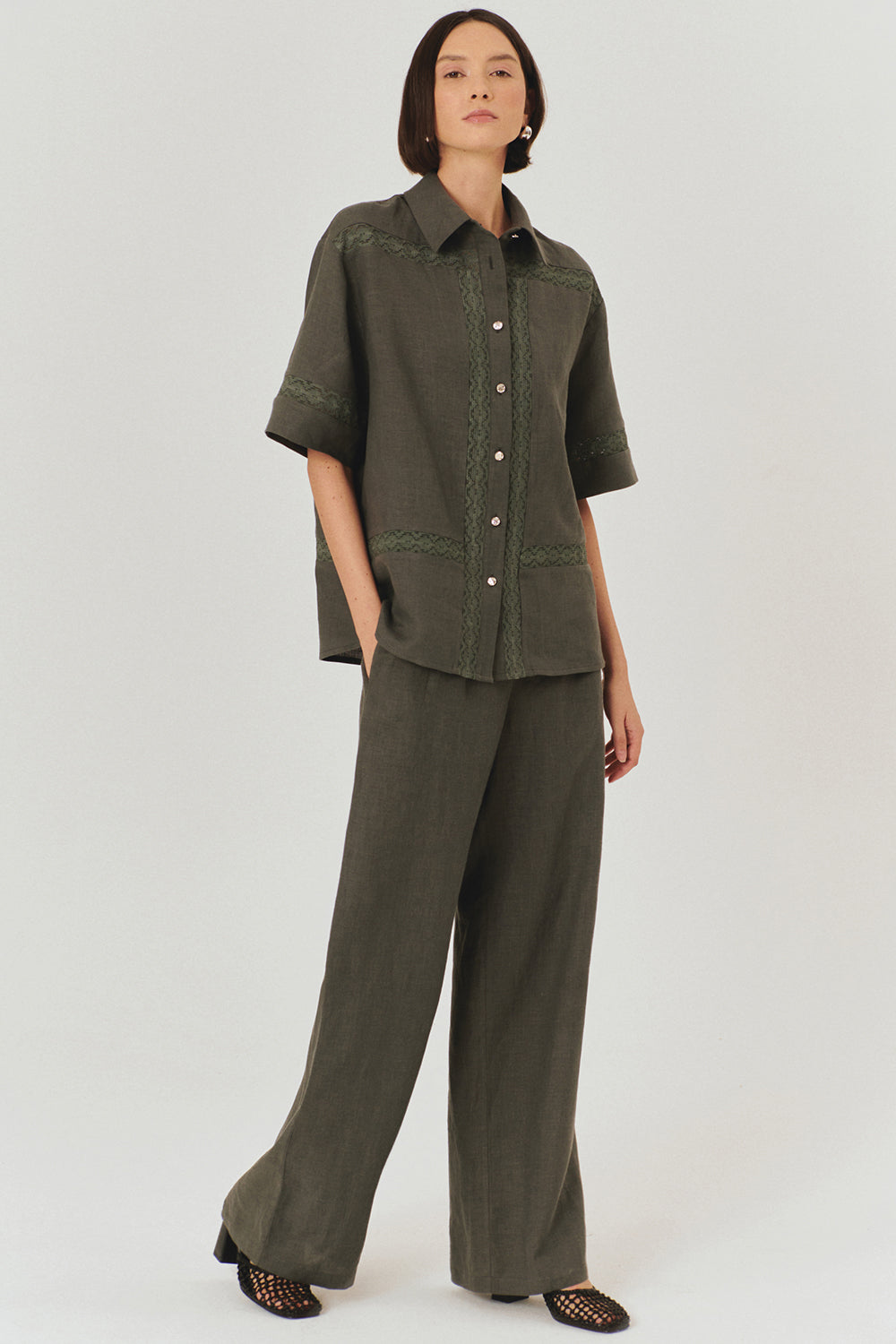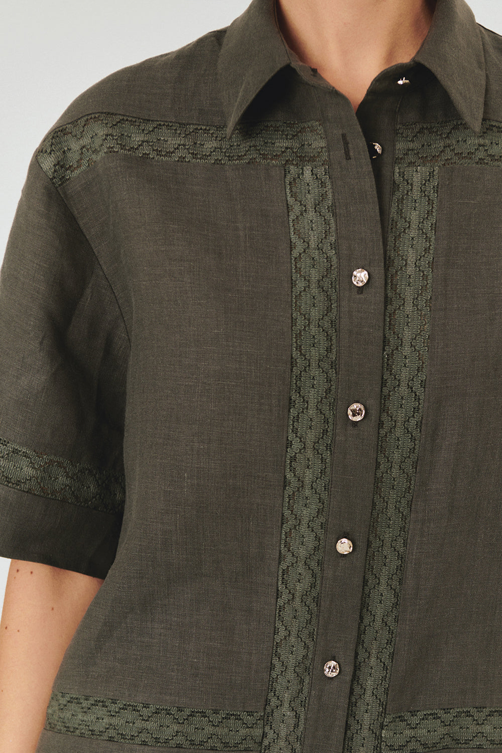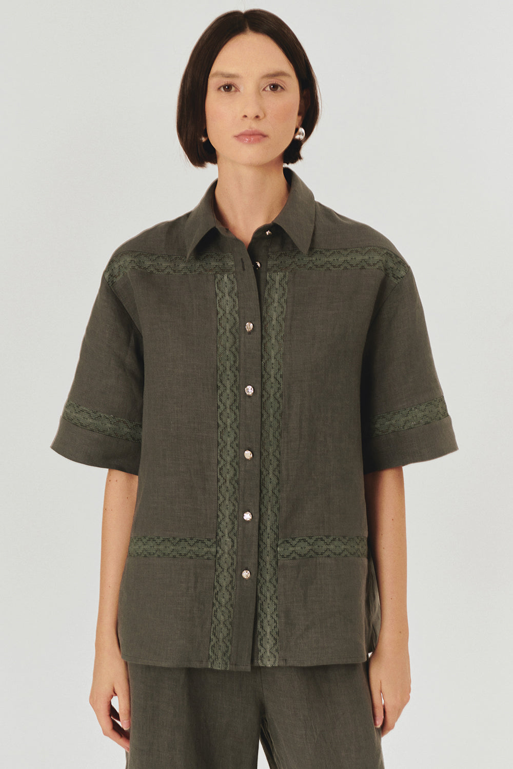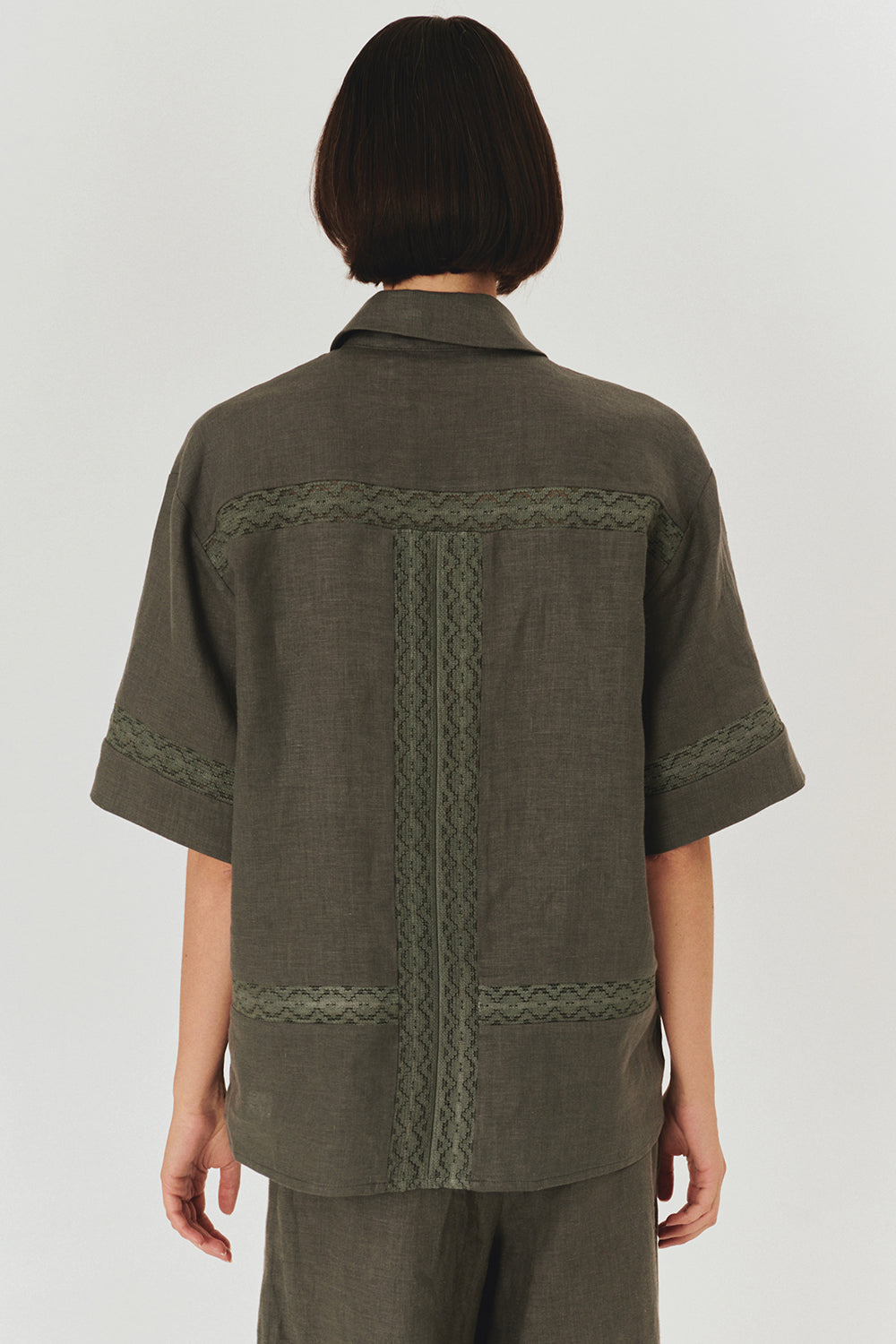 Dantel Detaylı Rahat Kalıp Saf Keten Kısa Kol Gri Gömlek