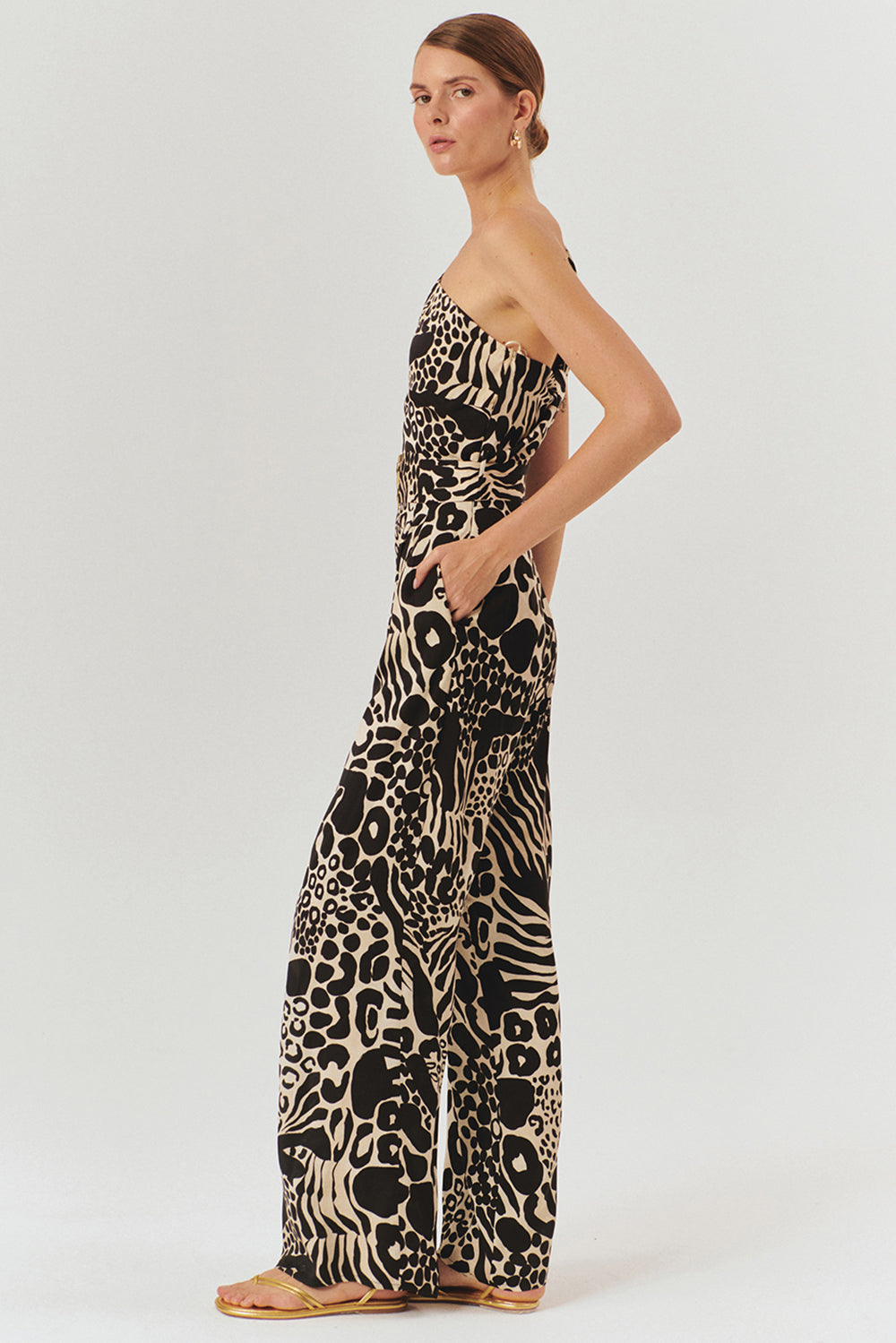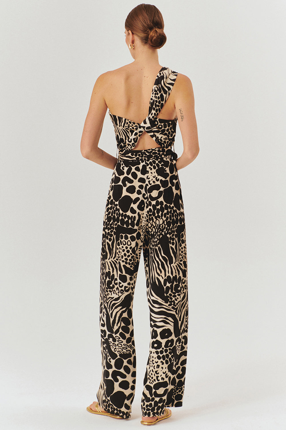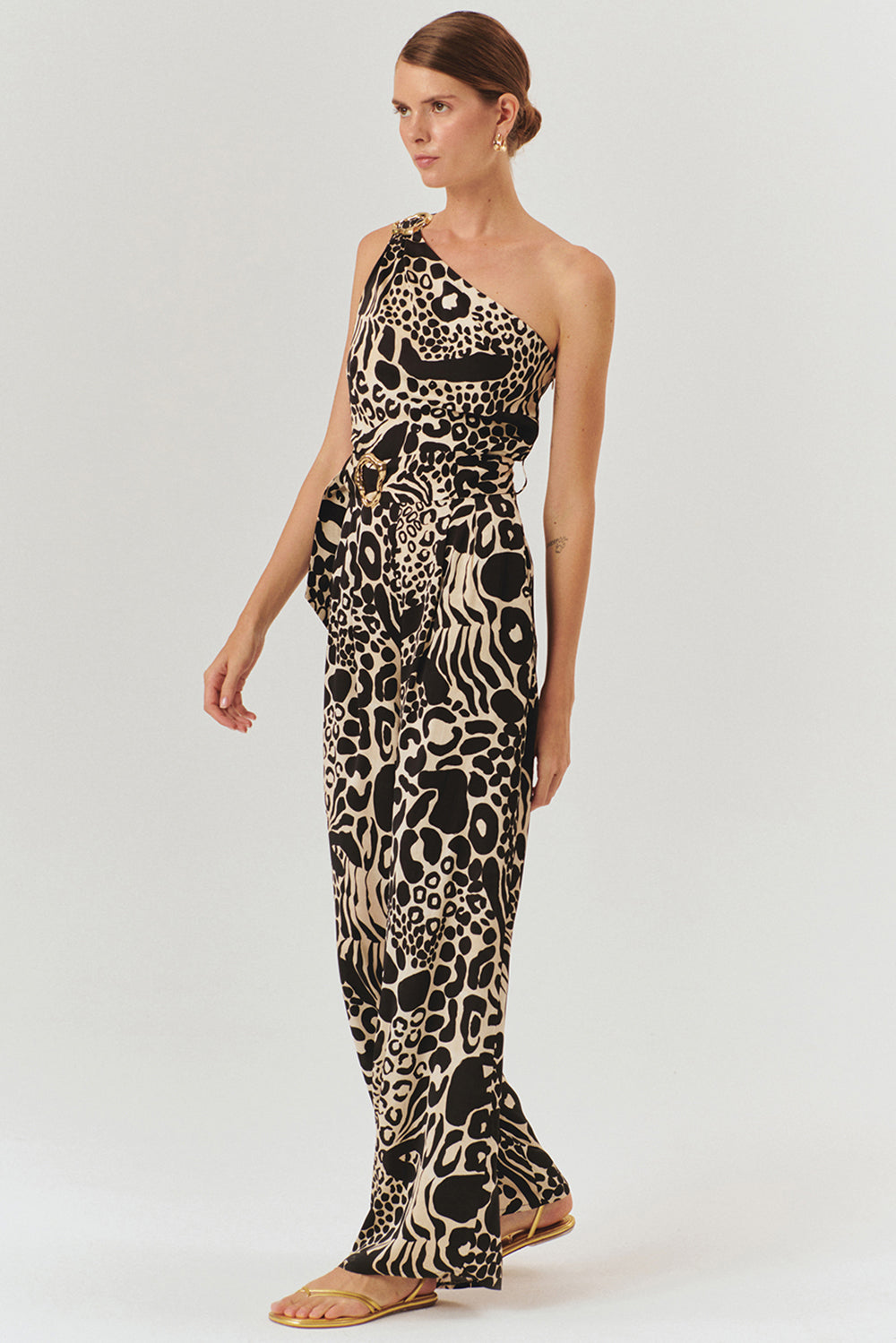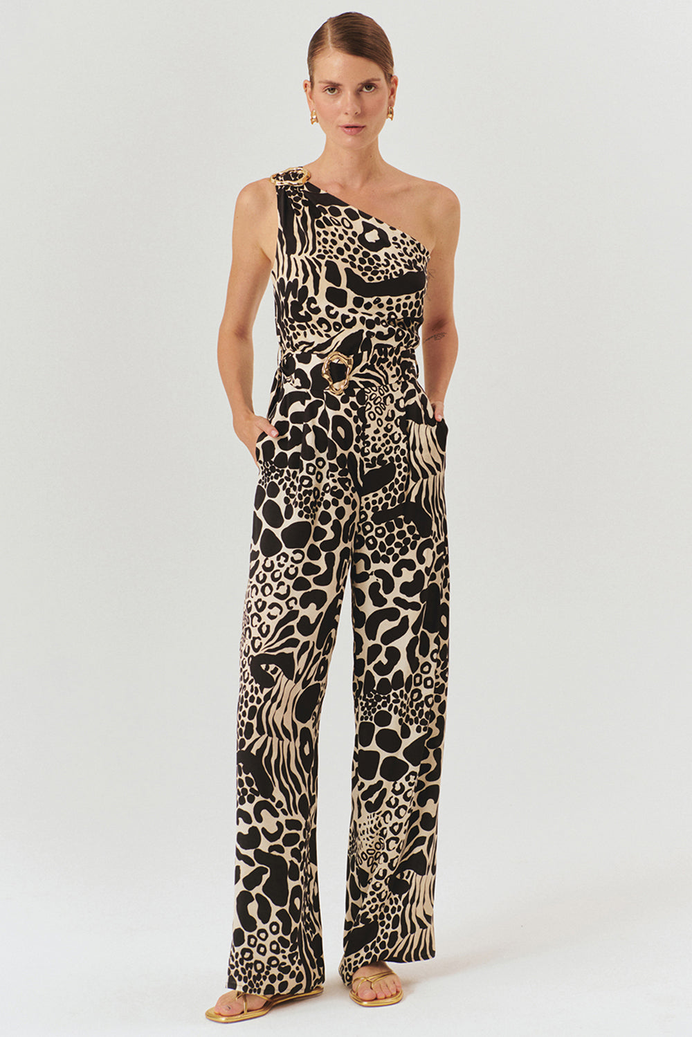 Zamansız şıklığın modern detaylarla buluştuğu kemer ve toka detaylı desenli regular tulum, güçlü ve iddialı bir stilin anahtar parçası olmaya aday! Tek omuz tasarımı, altın renkli toka detayı ve belde yer alan kemeri, bu tulumu sofistike ve feminen bir görünüme kavuşturuyor.