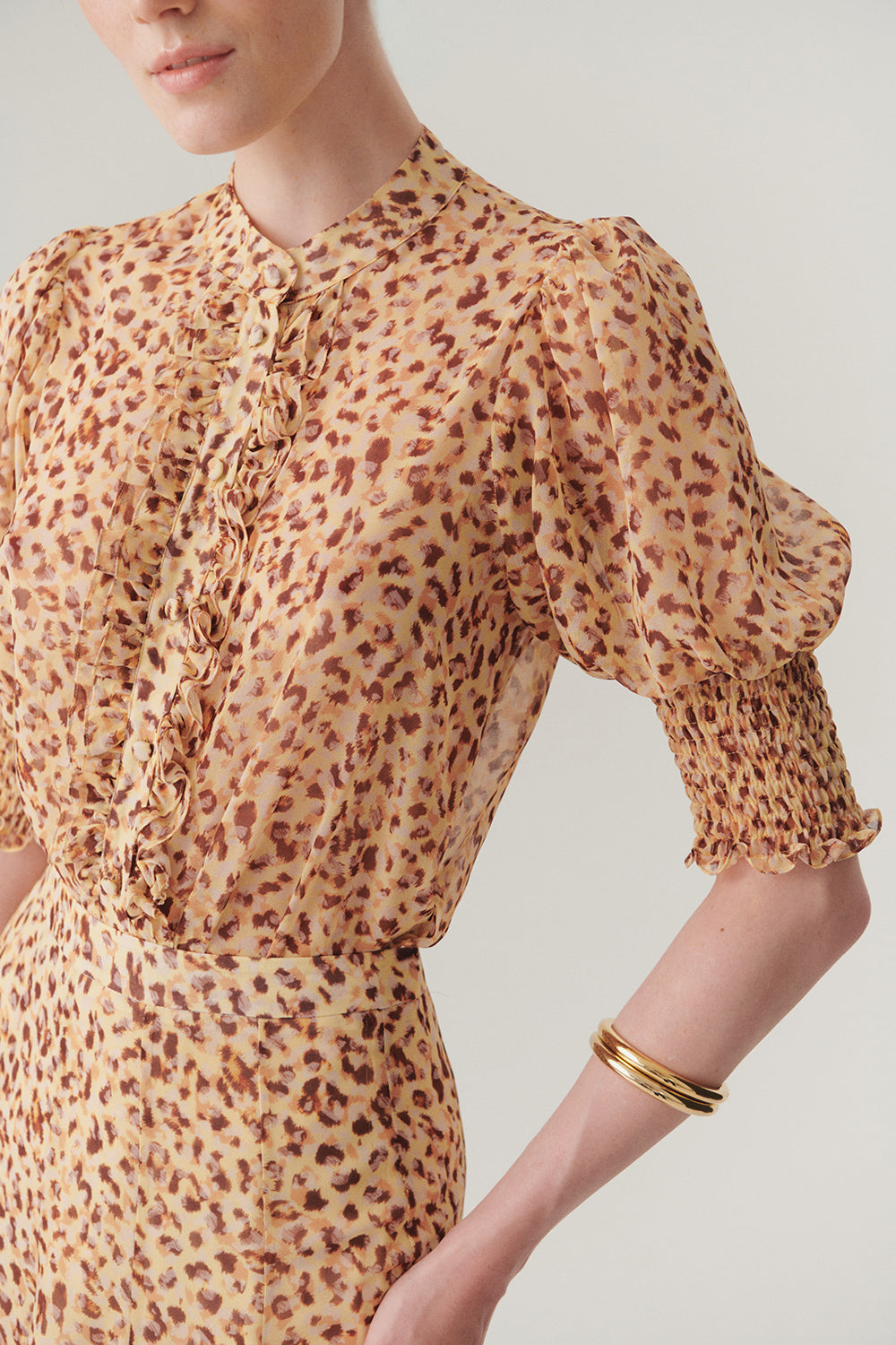 Feminen ve zamansız bir stilin anahtar parçası!Fırfır biye detayları, gömleğe hareket ve romantik bir hava katarken, zarif desenleri doğadan ilham alan şıklığı yansıtıyor. Regular fit kesimi, rahat ve modern bir duruş sunarken, hafif kumaşı ile gün boyu konfor sağlıyor.Bu şık tasarımı yüksek bel pantolonlarla sofistike bir kombin, desenli eteklerle vintage bir dokunuş, ya da jeanlerle günlük şıklık yaratmak için kullanabilirsiniz. Zarif ve modern stilinize romantik bir dokunuş ekleyin!