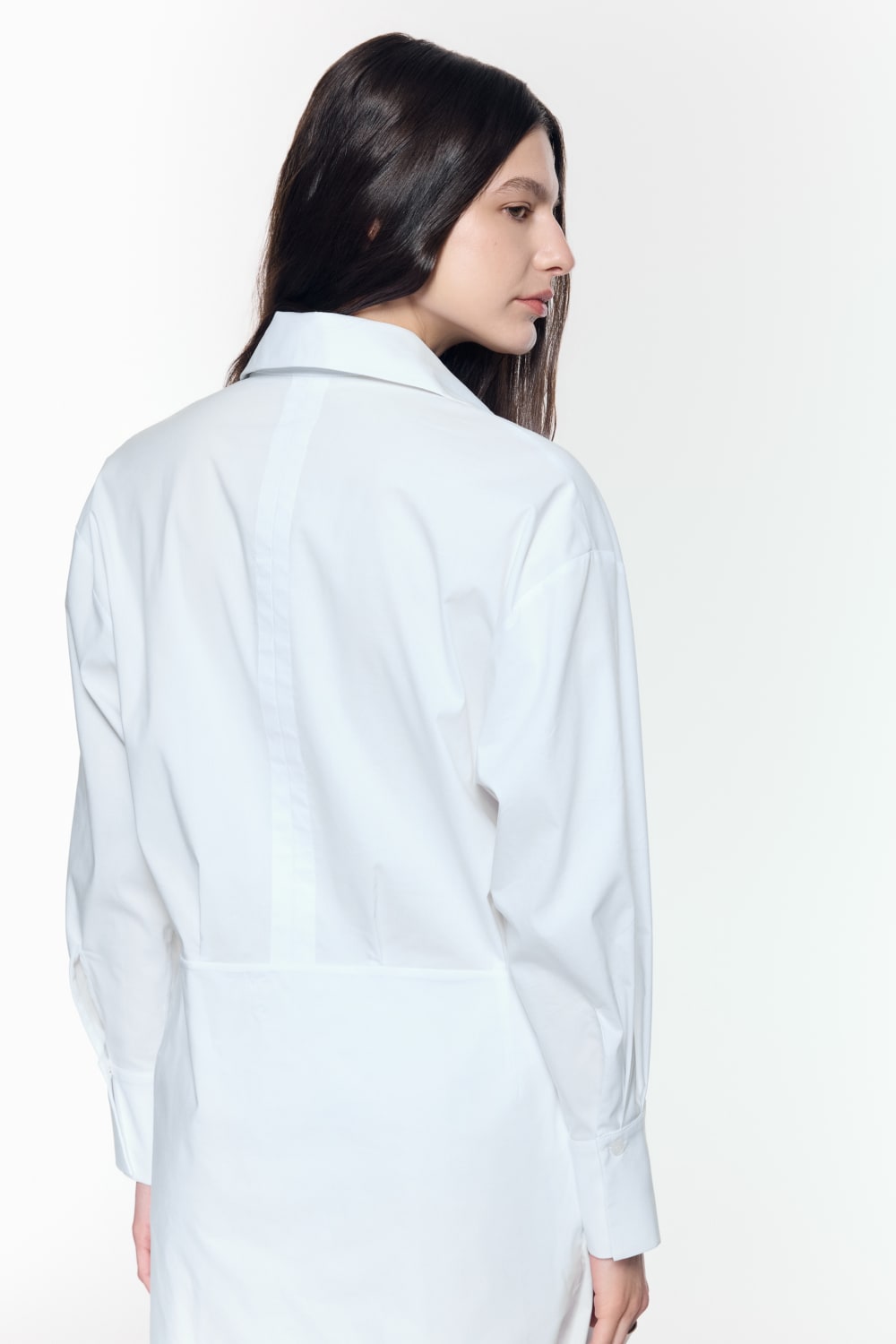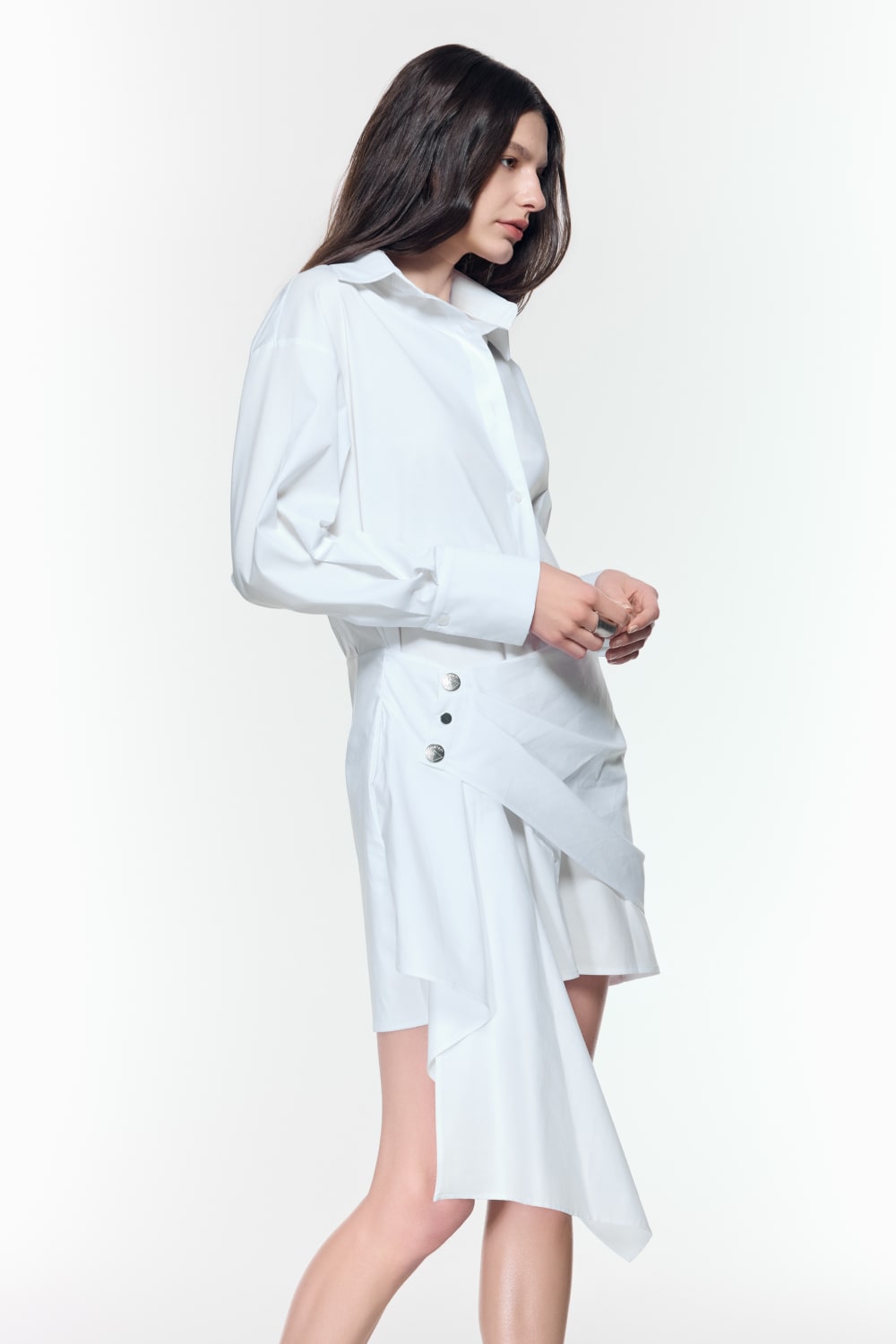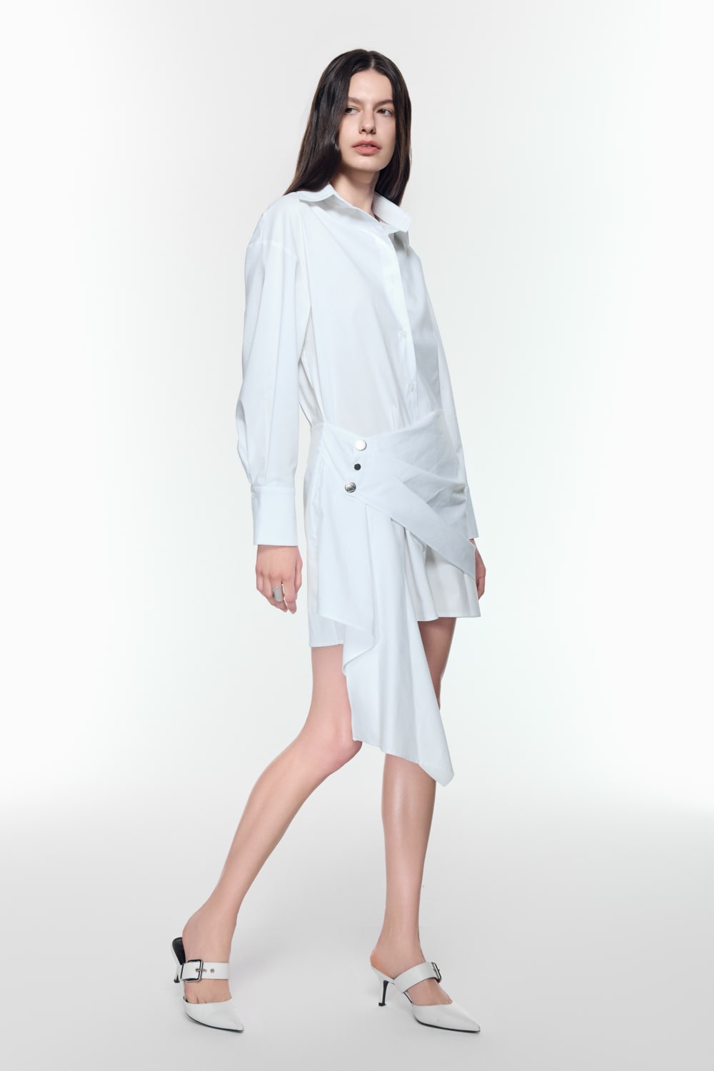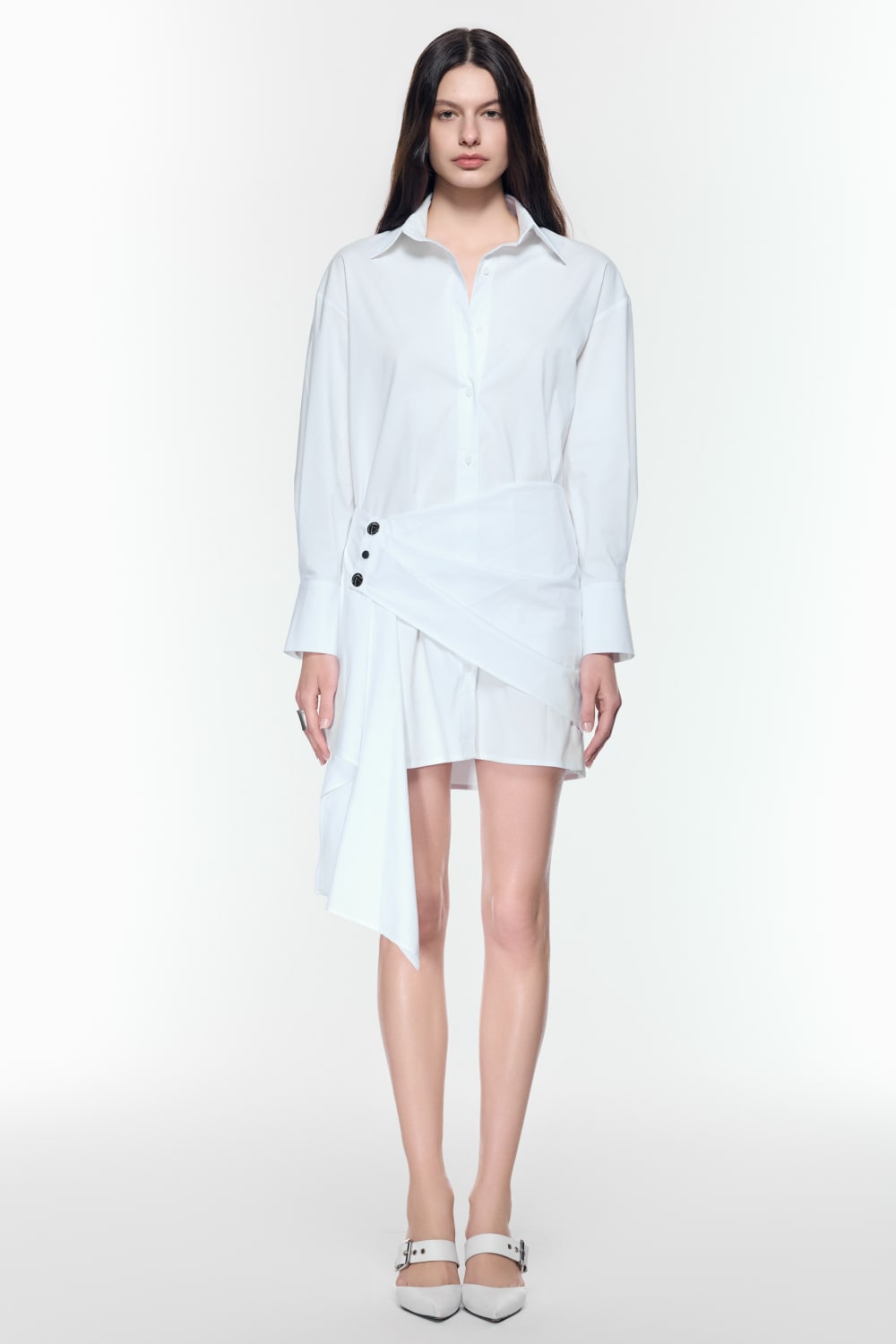 Beyaz pamuklu gömlek elbise, drapeli ve katmanlı asimetrik eteği ile öne çıkıyor