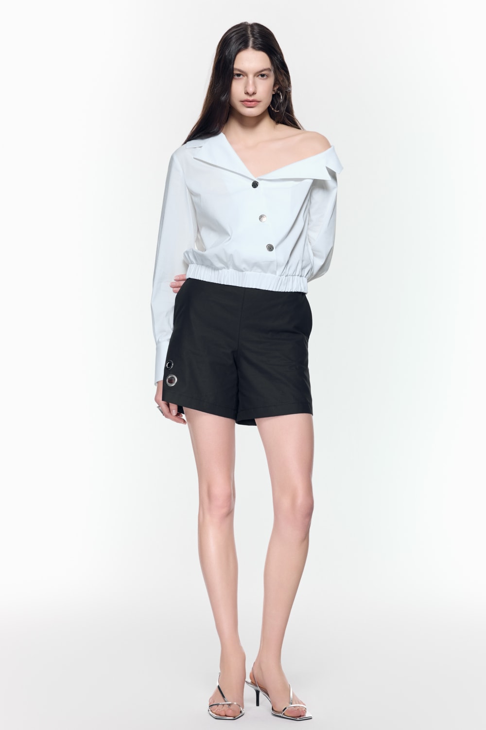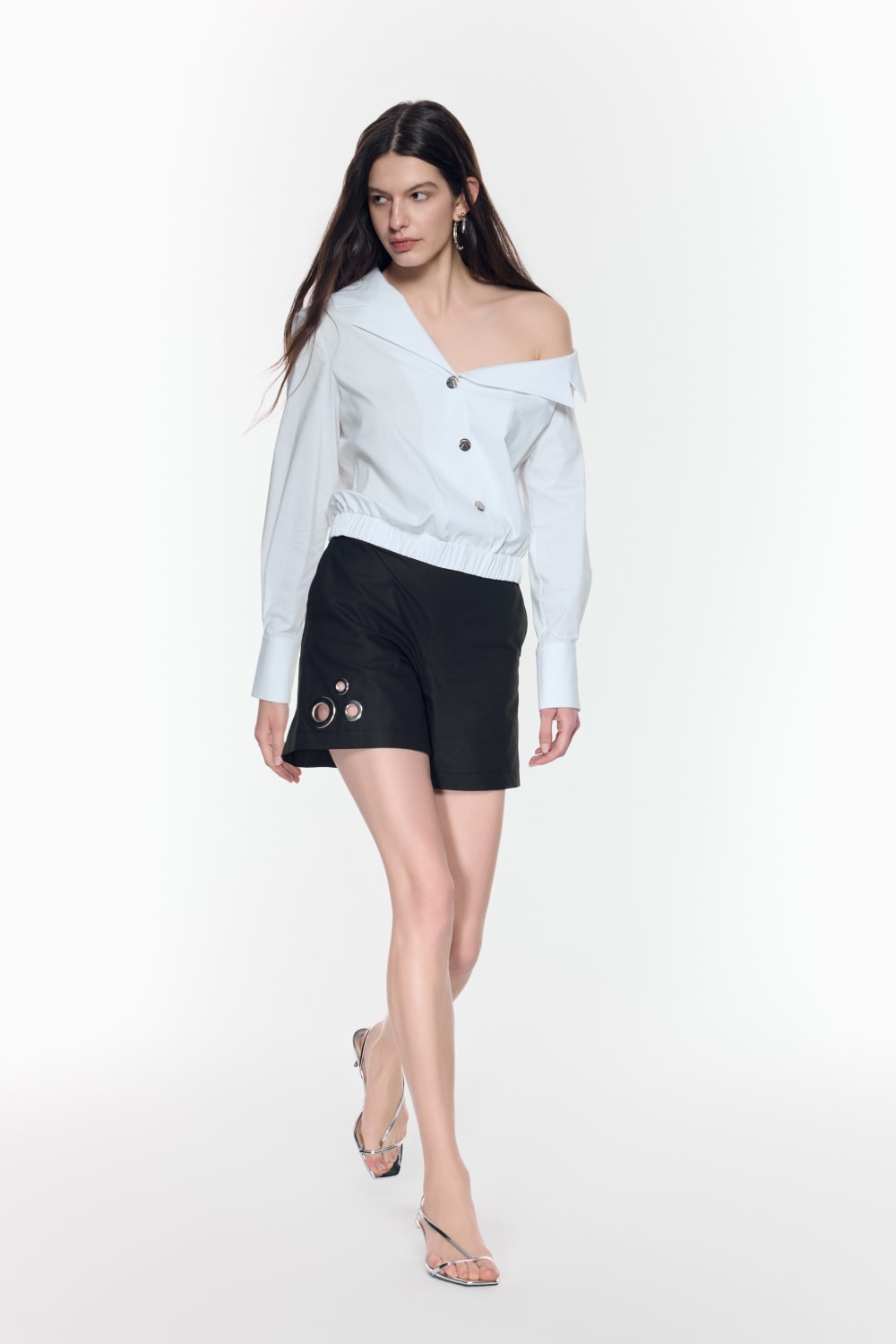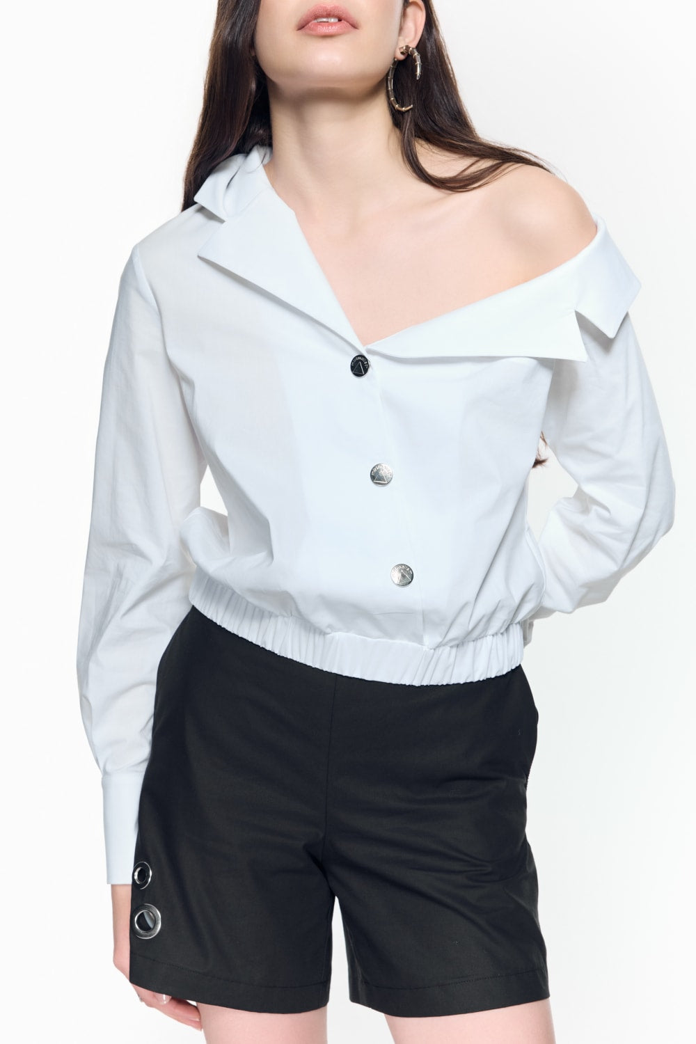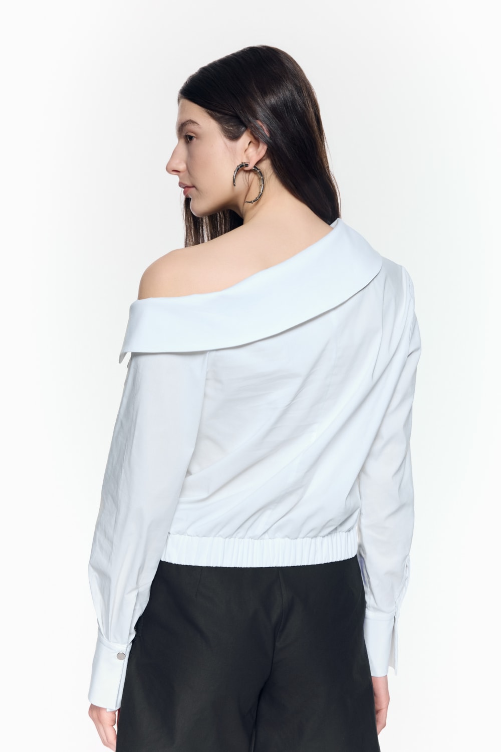 Tek omuz açık beyaz pamuklu poplin gömlek
