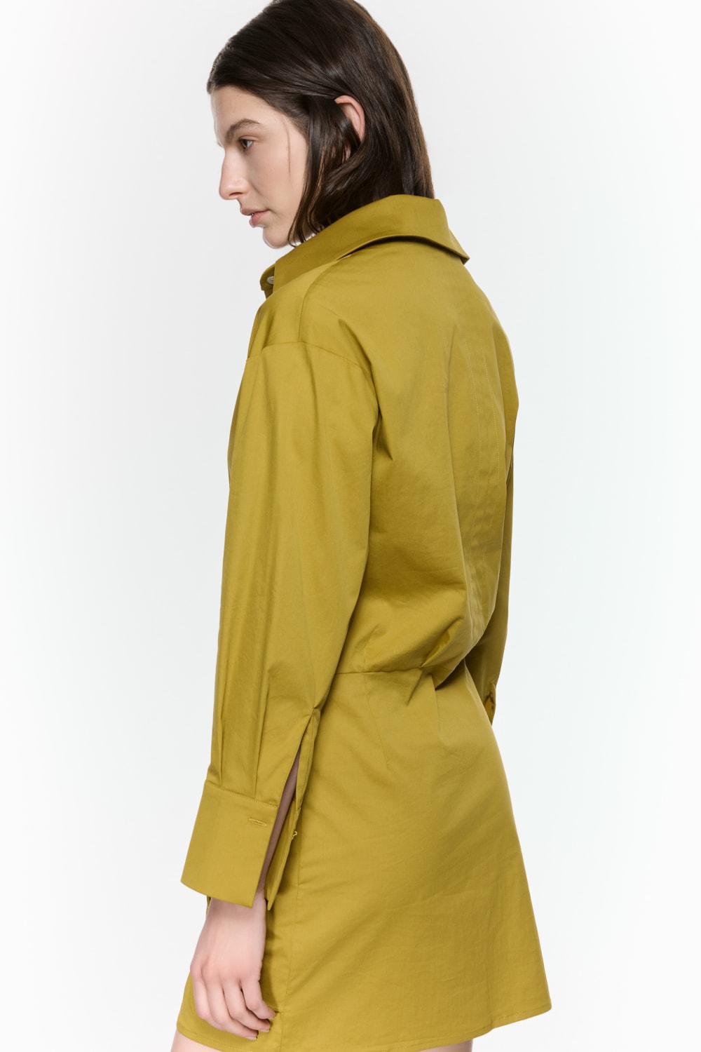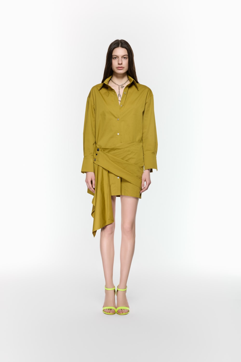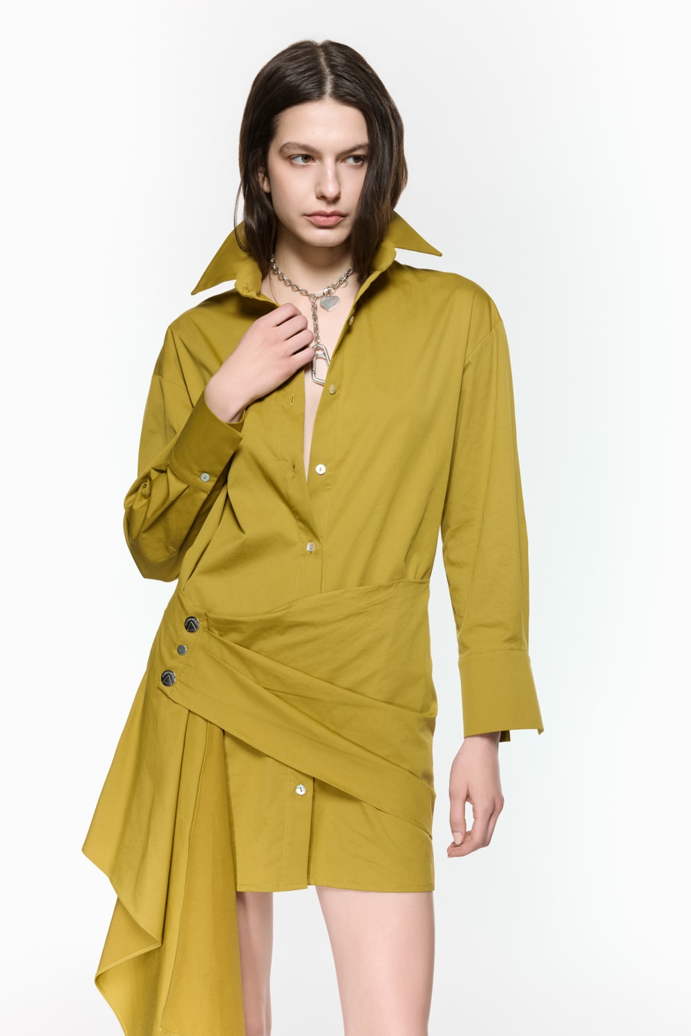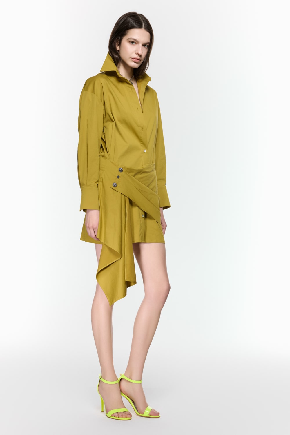 Hardal renkli pamuklu gömlek elbise, drapeli ve katmanlı asimetrik eteği ile öne çıkıyor