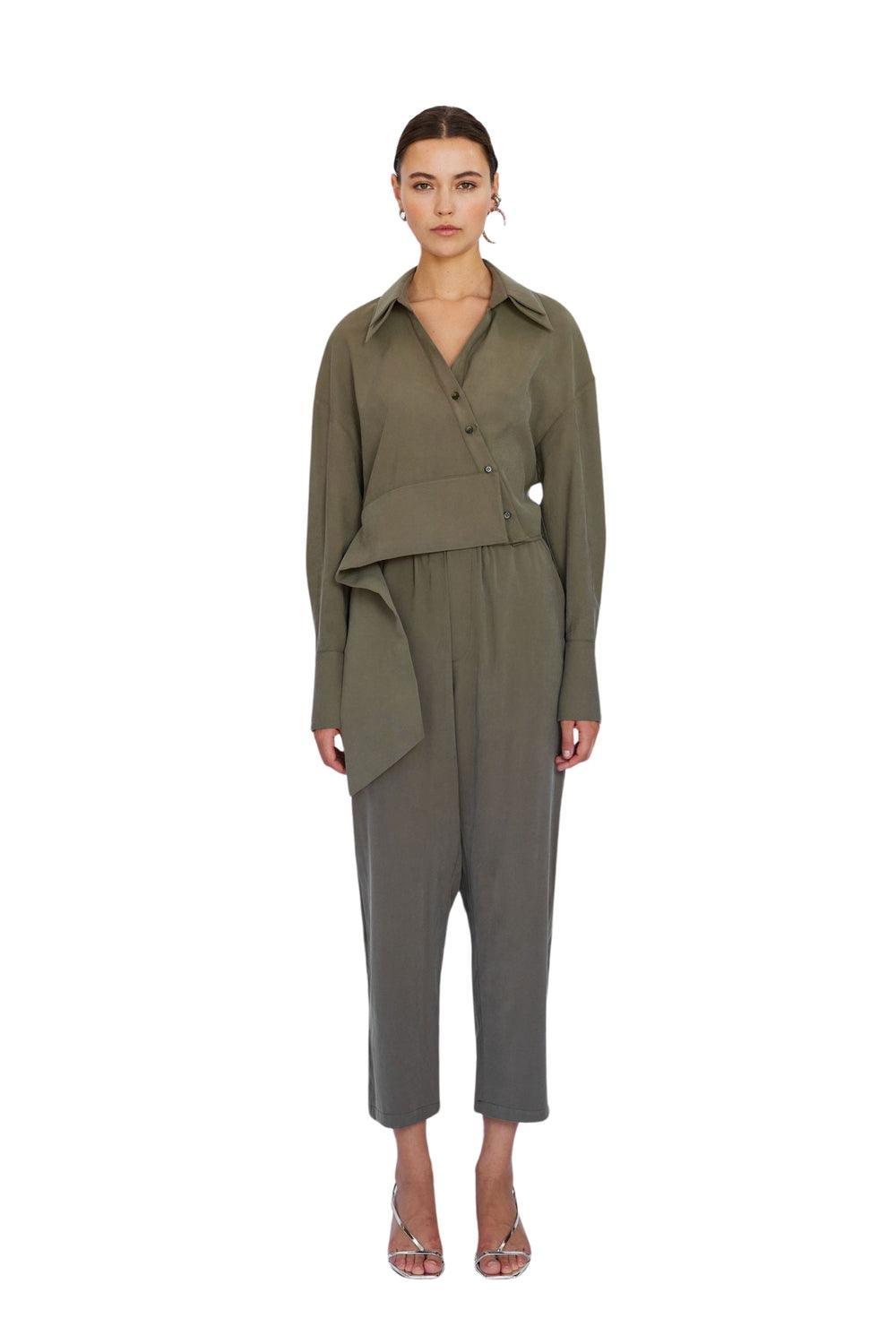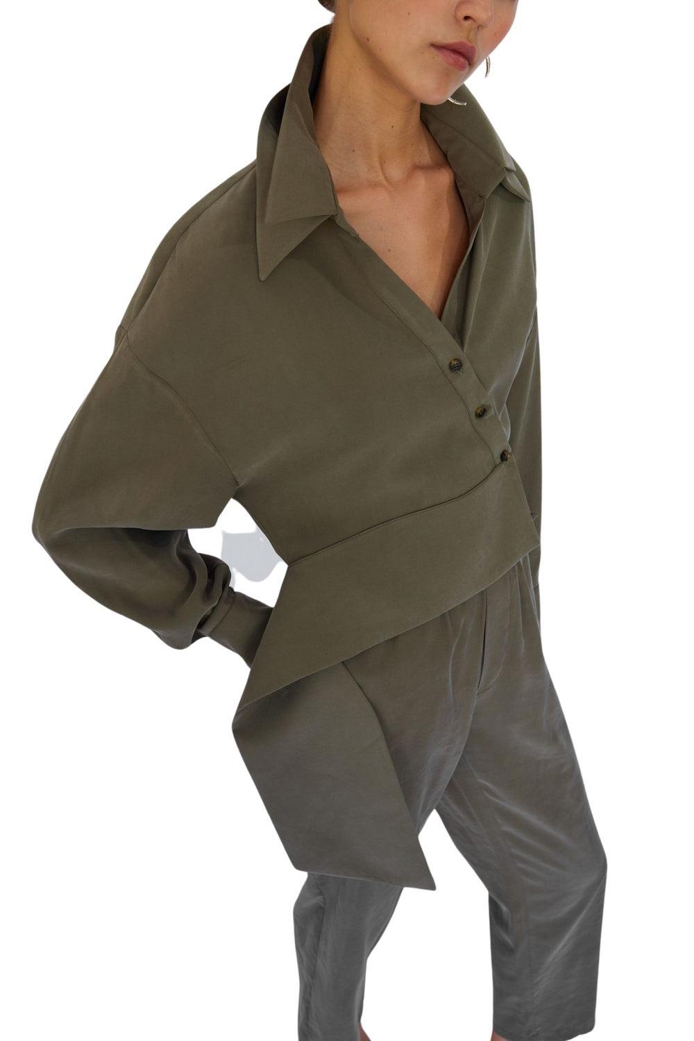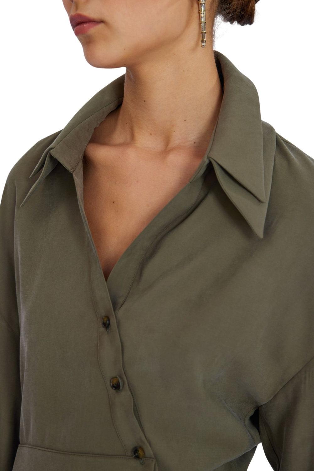 Esta camisa caqui está confeccionada en tejido 100% cupro. Tiene cierre asimétrico de botones, corte fuera del hombro y ajuste alrededor de la cintura.