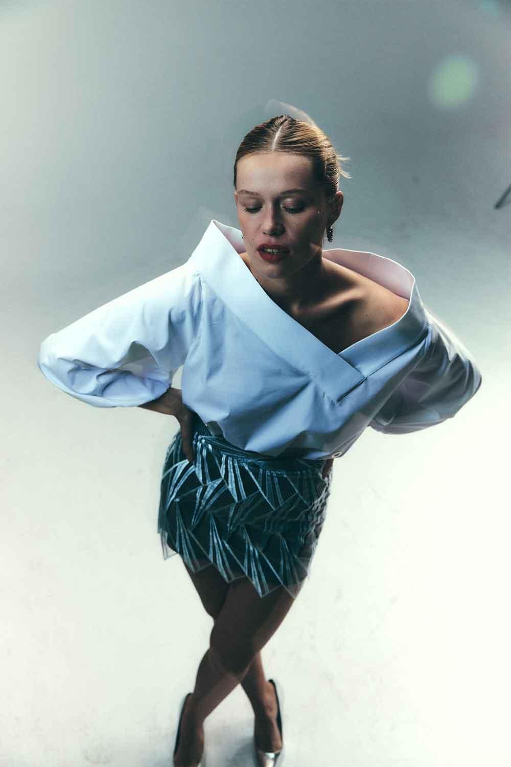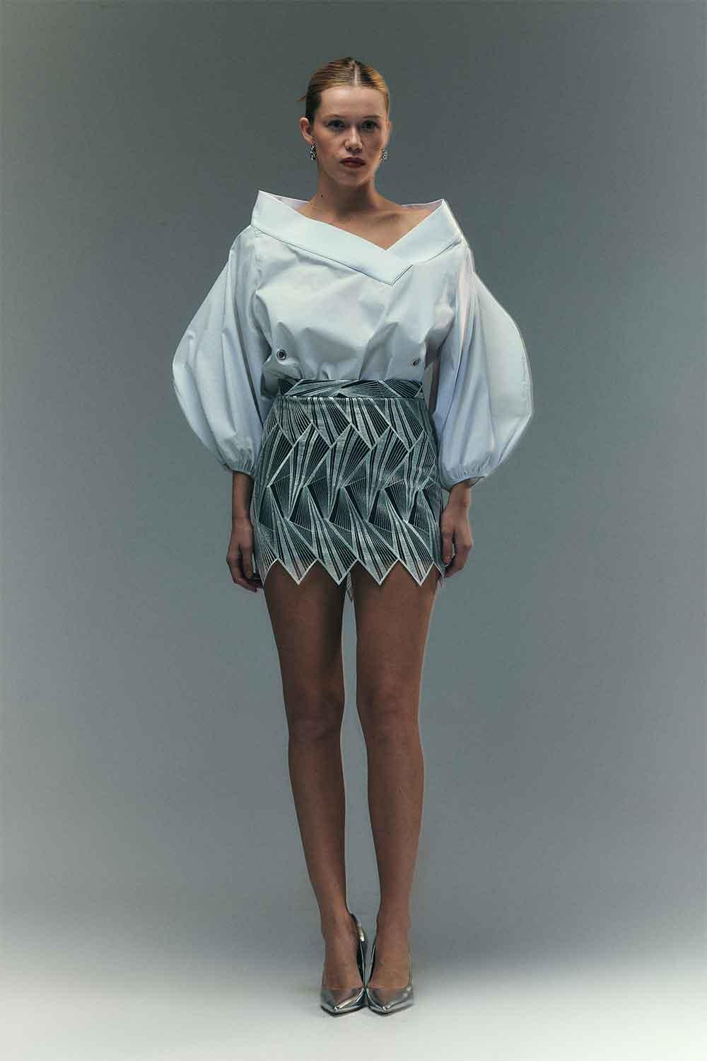 Camisa blanca de popelina con cuello llamativo y mangas abullonadas con volumen que llaman la atención