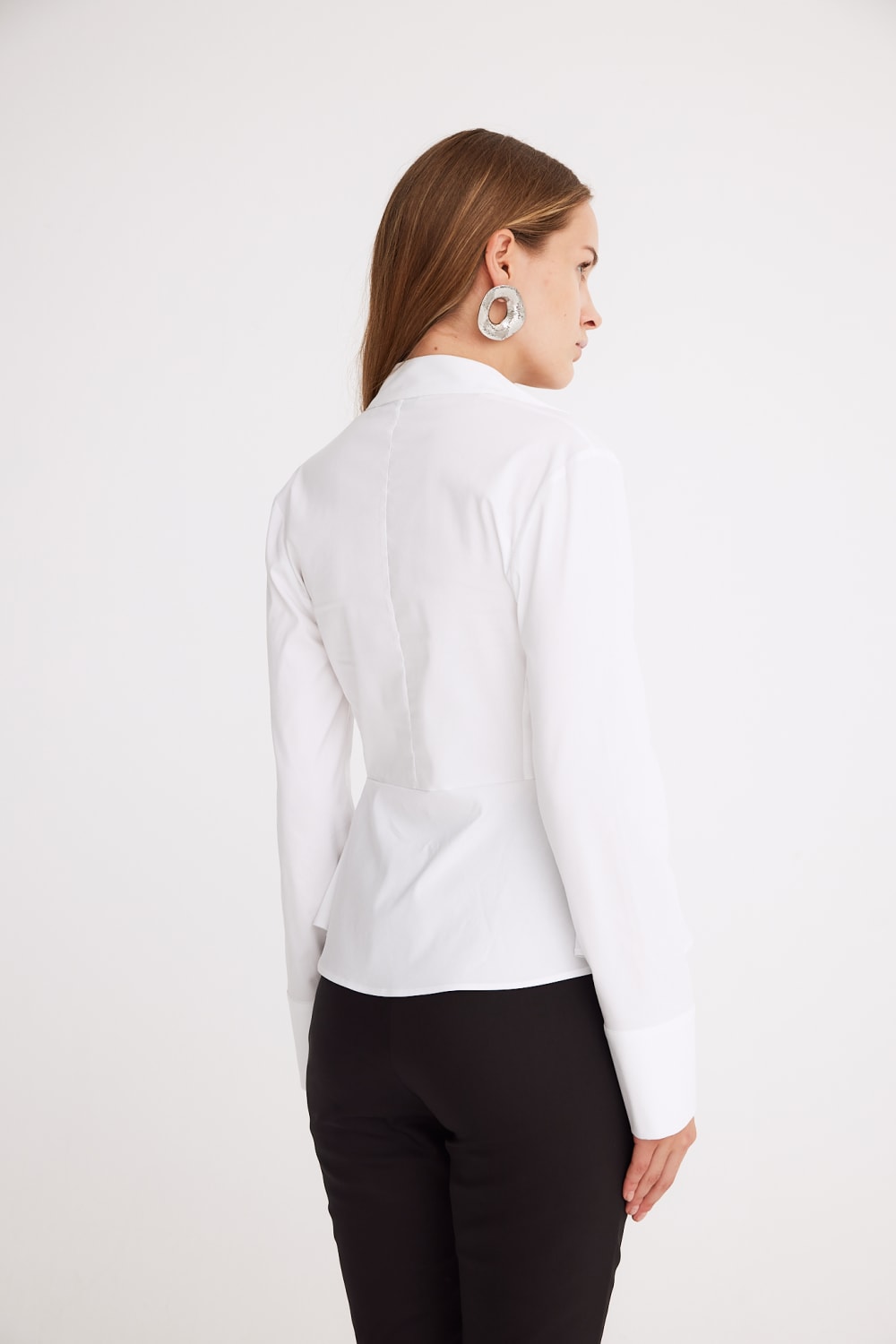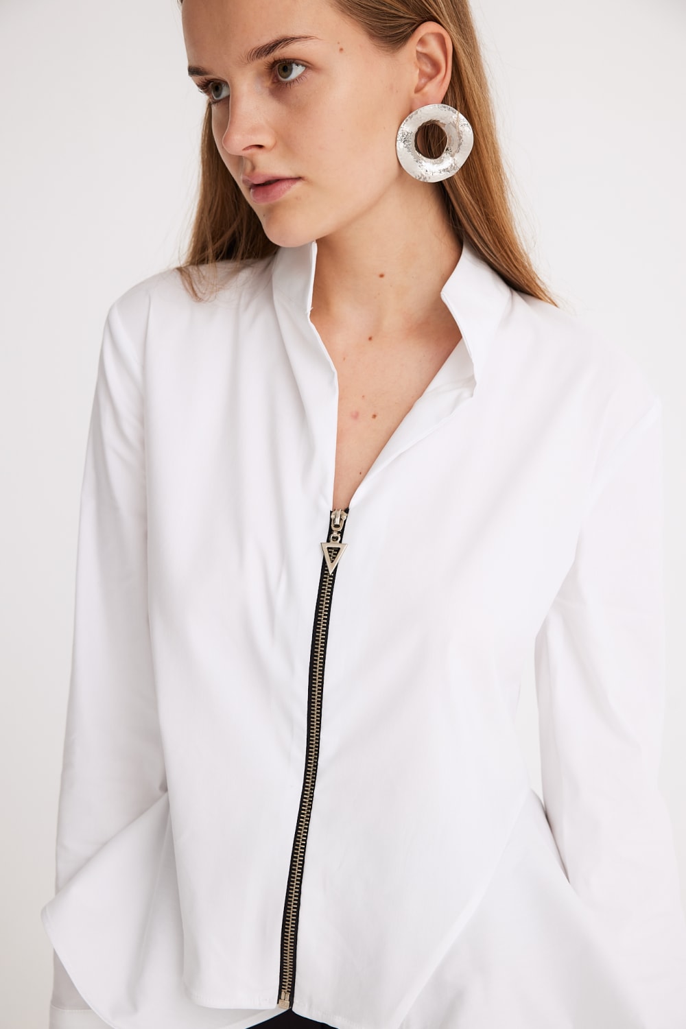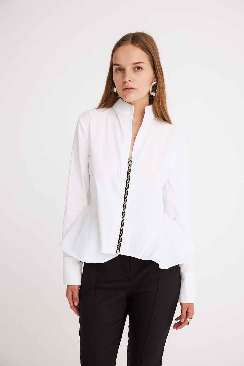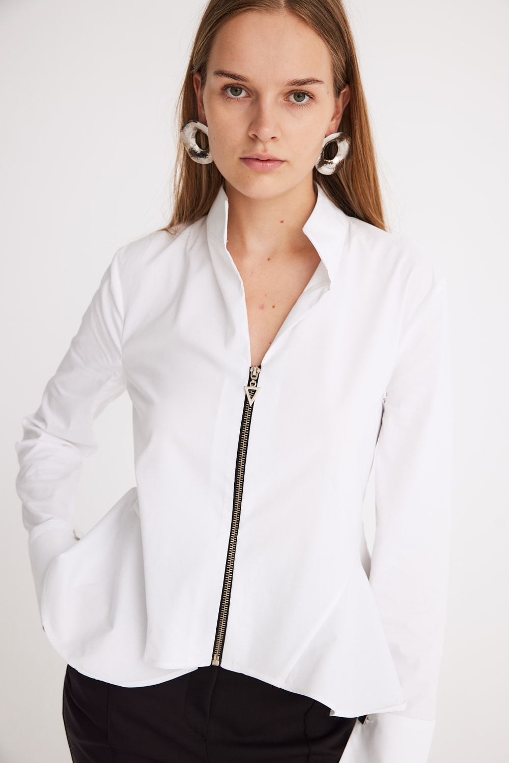 Önden metal fermuarla kapanan beyaz dik yaka gömlek