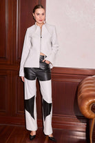This belt closure with hook fastening, dual-colored leather pants draws attention with its unique and distinctive design. The perfect harmony of black and white adds both elegance and a modern touch to the pants. Suitable for both everyday wear and special occasions, this pant enhances any outfit with its bold and original style. Its exceptional design will highlight your style and personality.