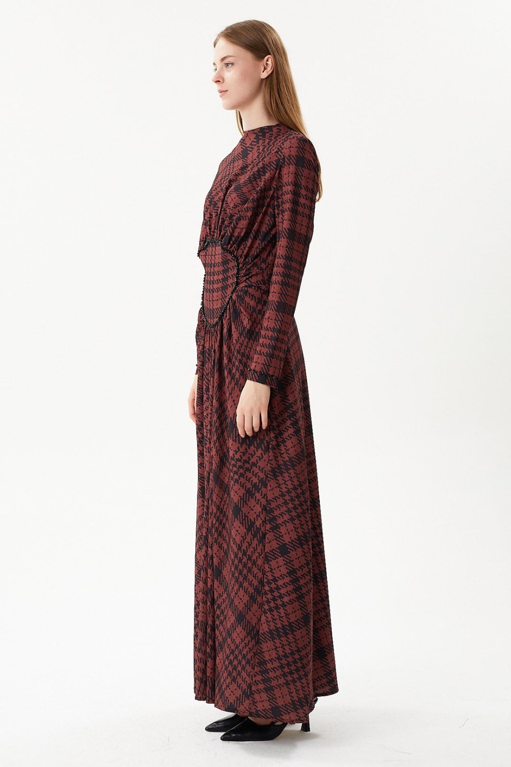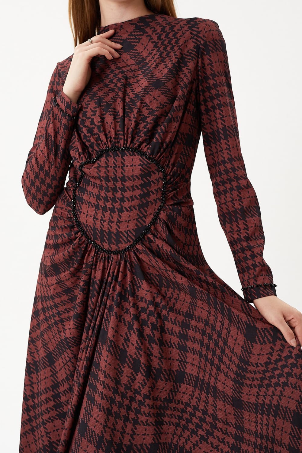 Kareli desenli, göbek üstünde büzgü detayı ve el işlemesi olan, bayan elbise.
