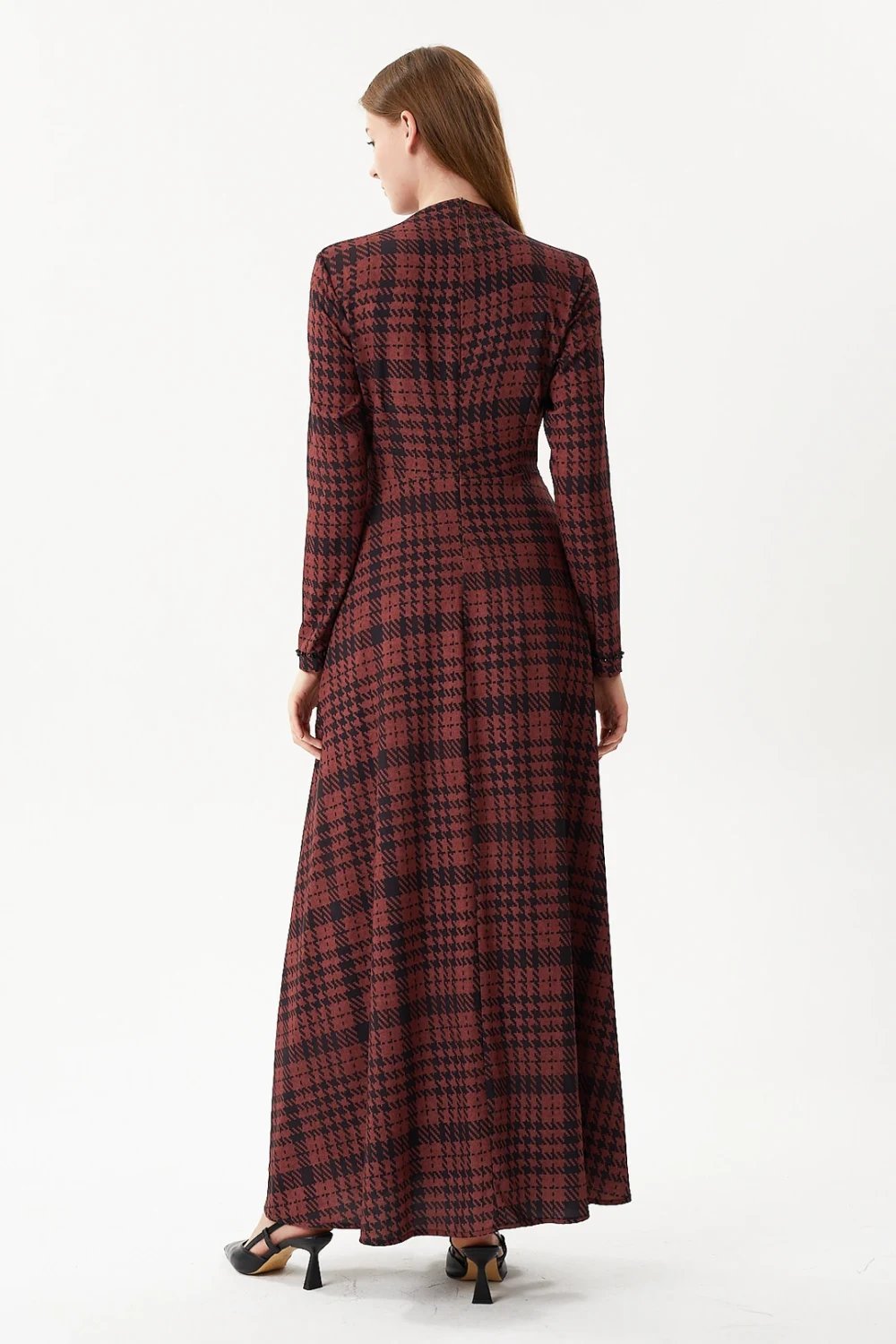 Ekose Desenli Önünde El İşlemesi Nakış Olan Uzun Elbise