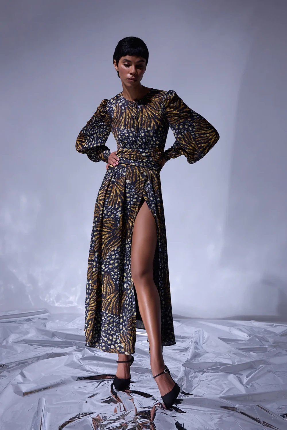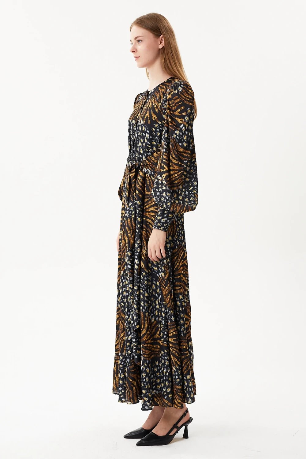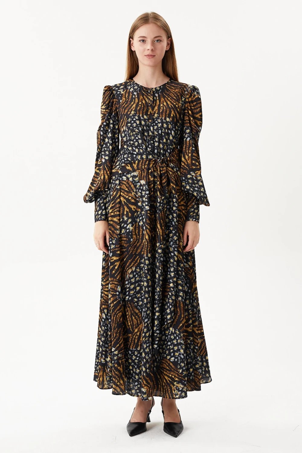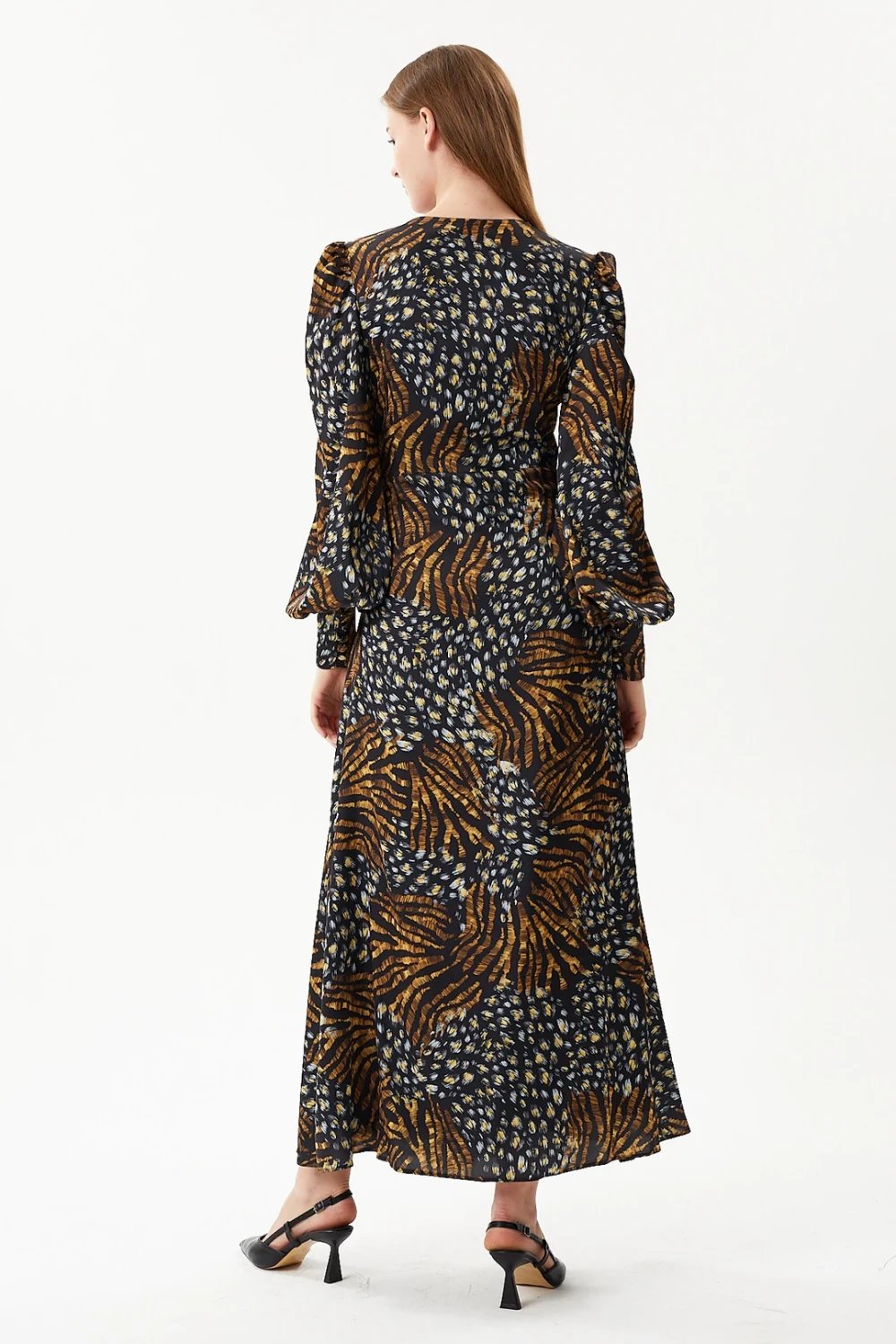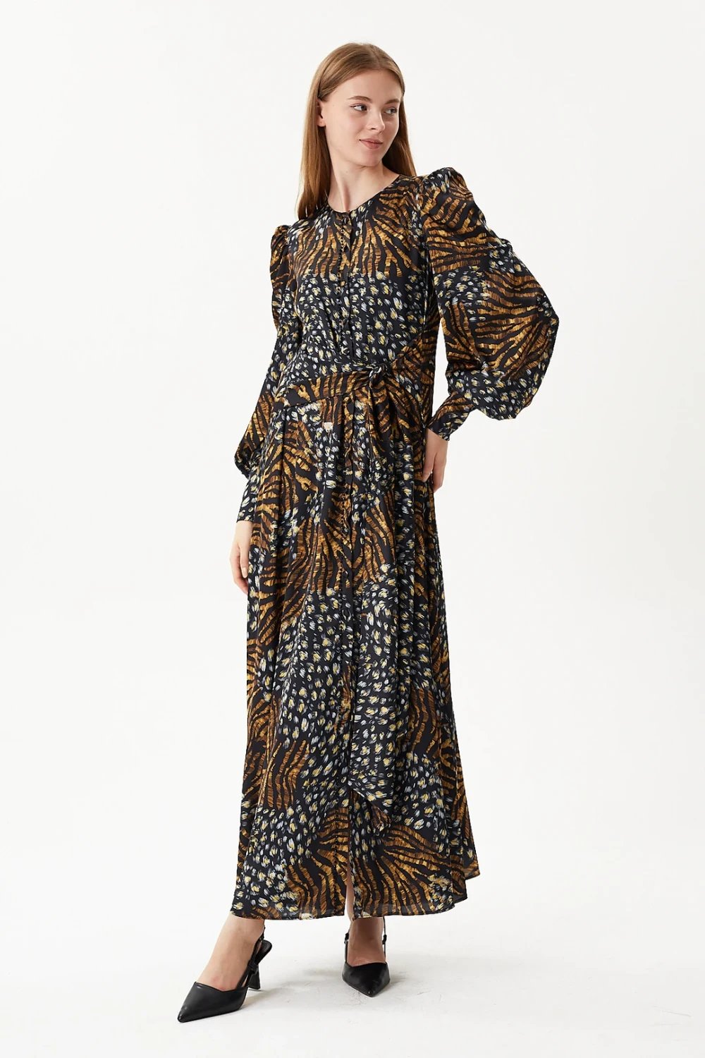 Karışık Leopar Desenli Ön Patı El İşlemeli Nakış Detayı Olan Uzun Elbise