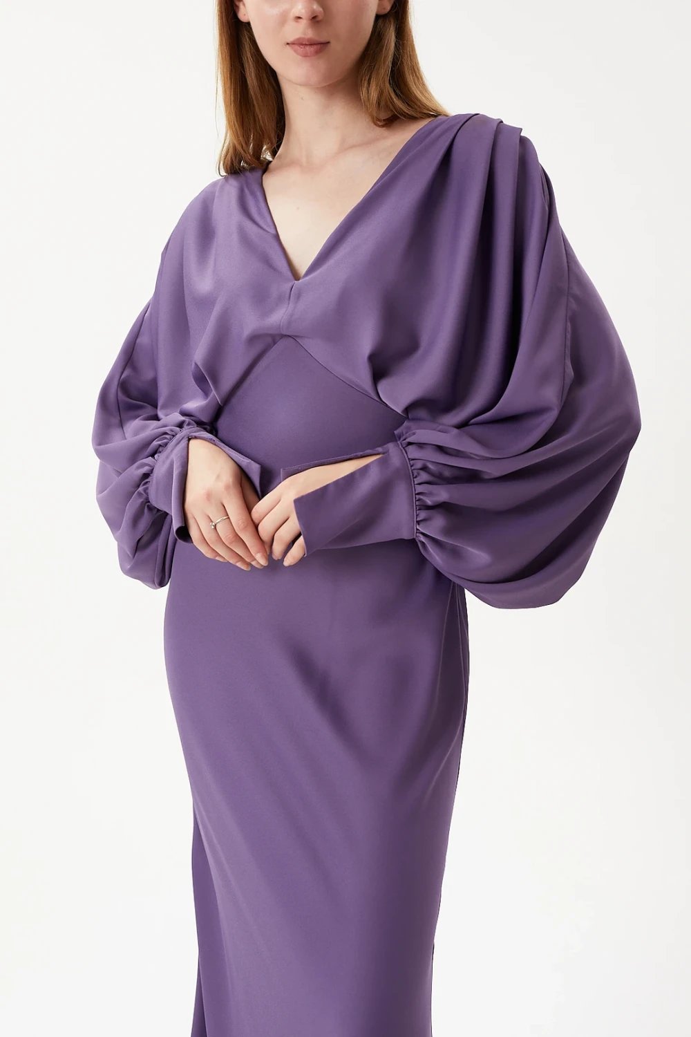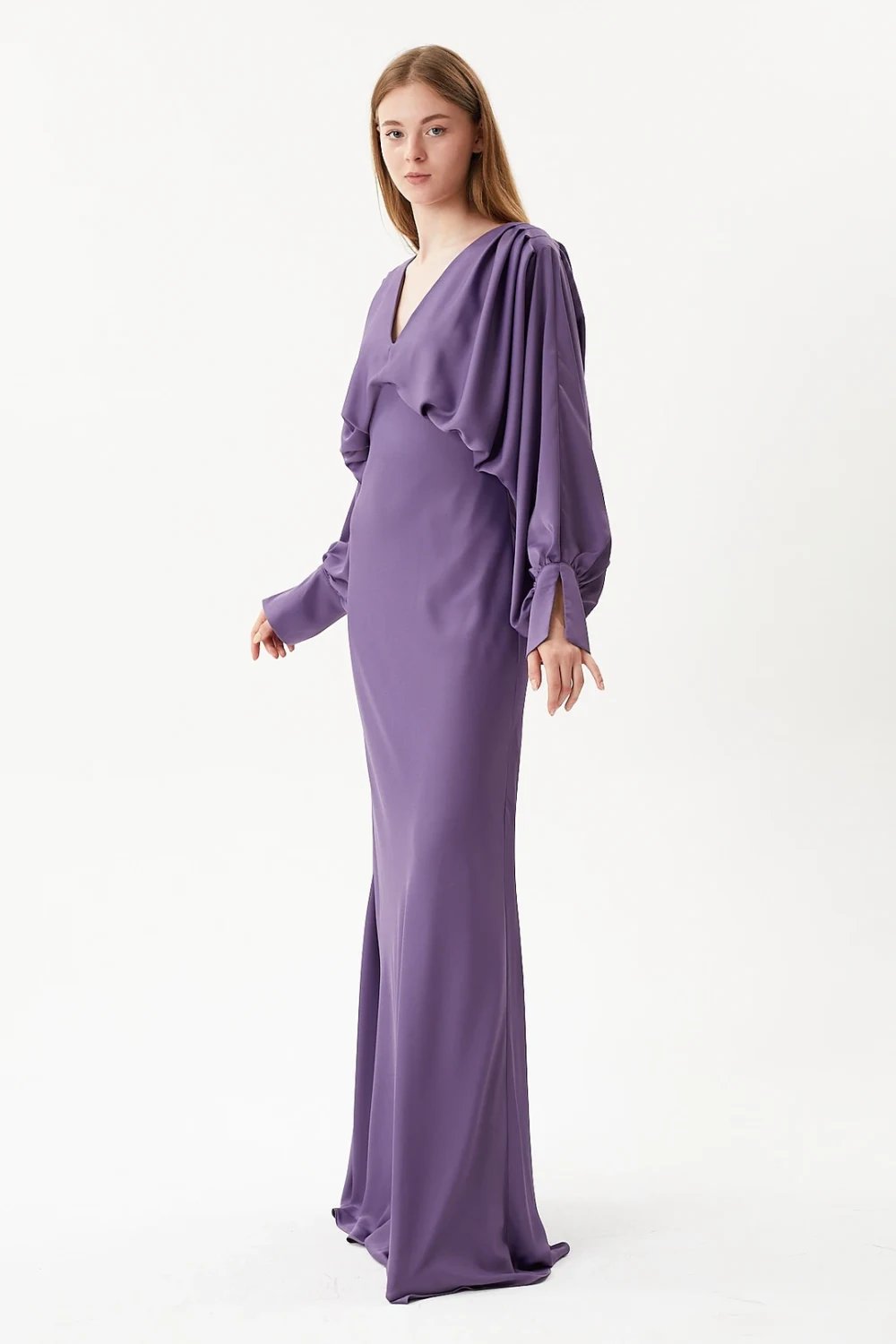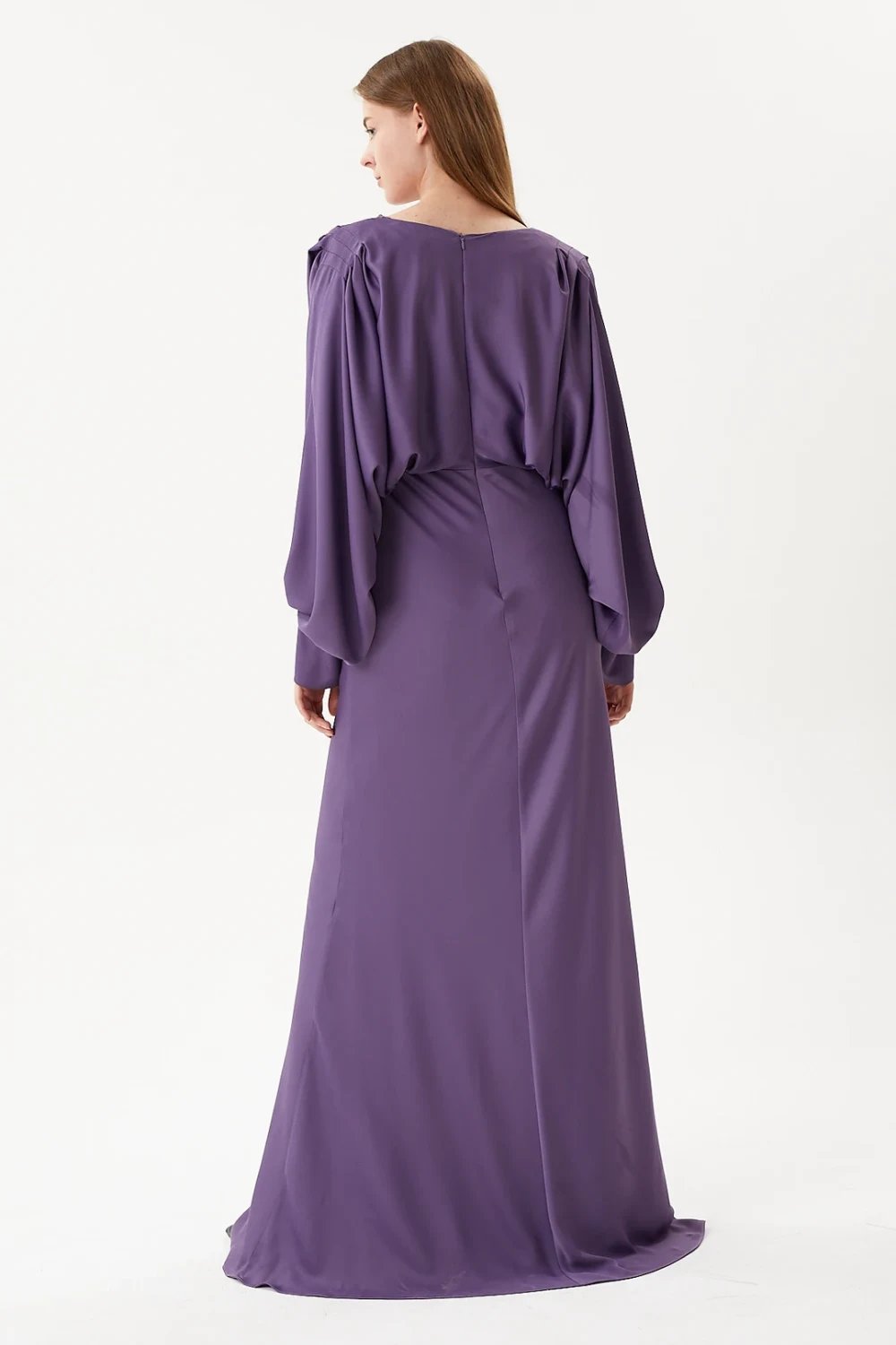 Krep Saten V Yaka Taşlar İle Süslenmiş Uzun Elbise