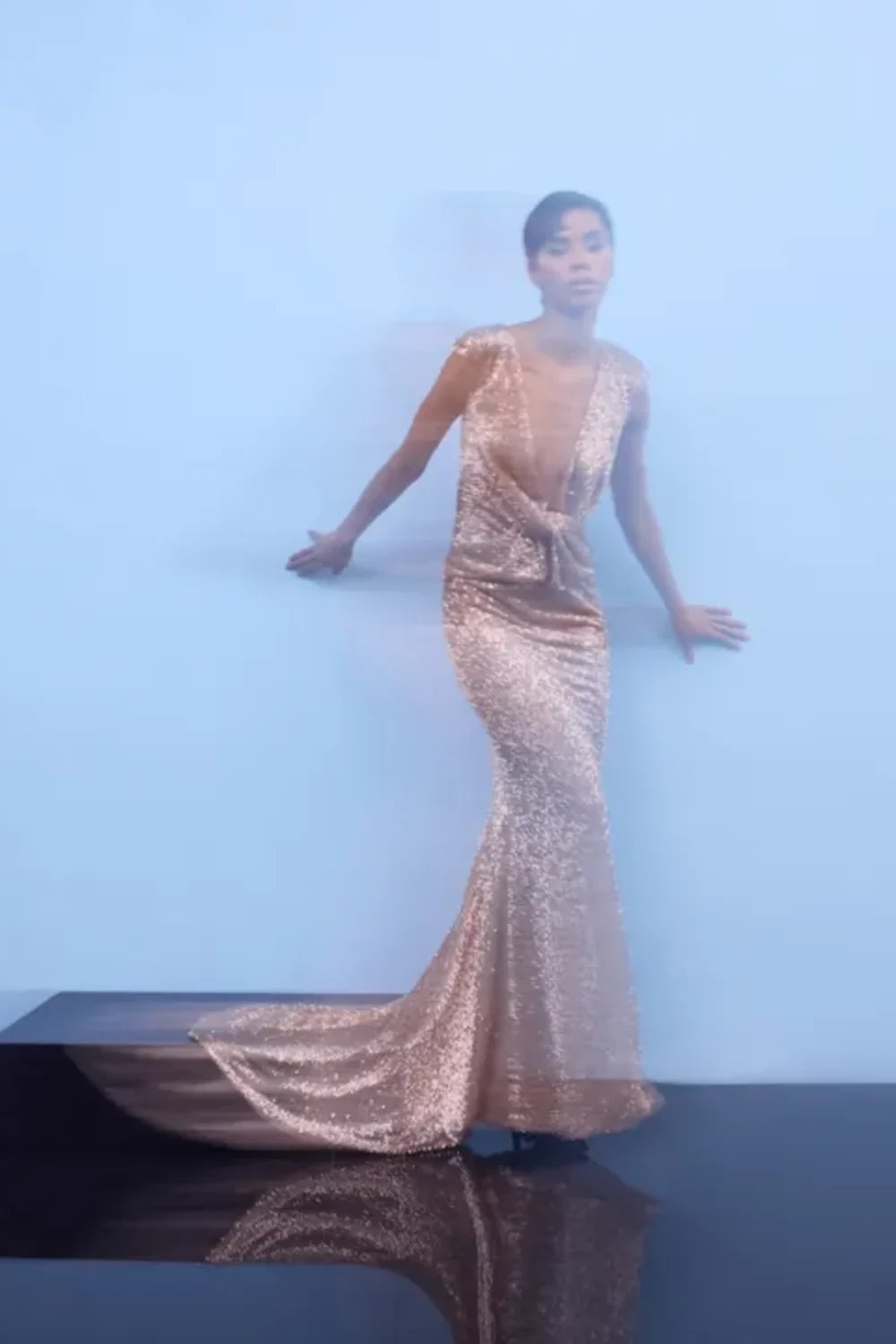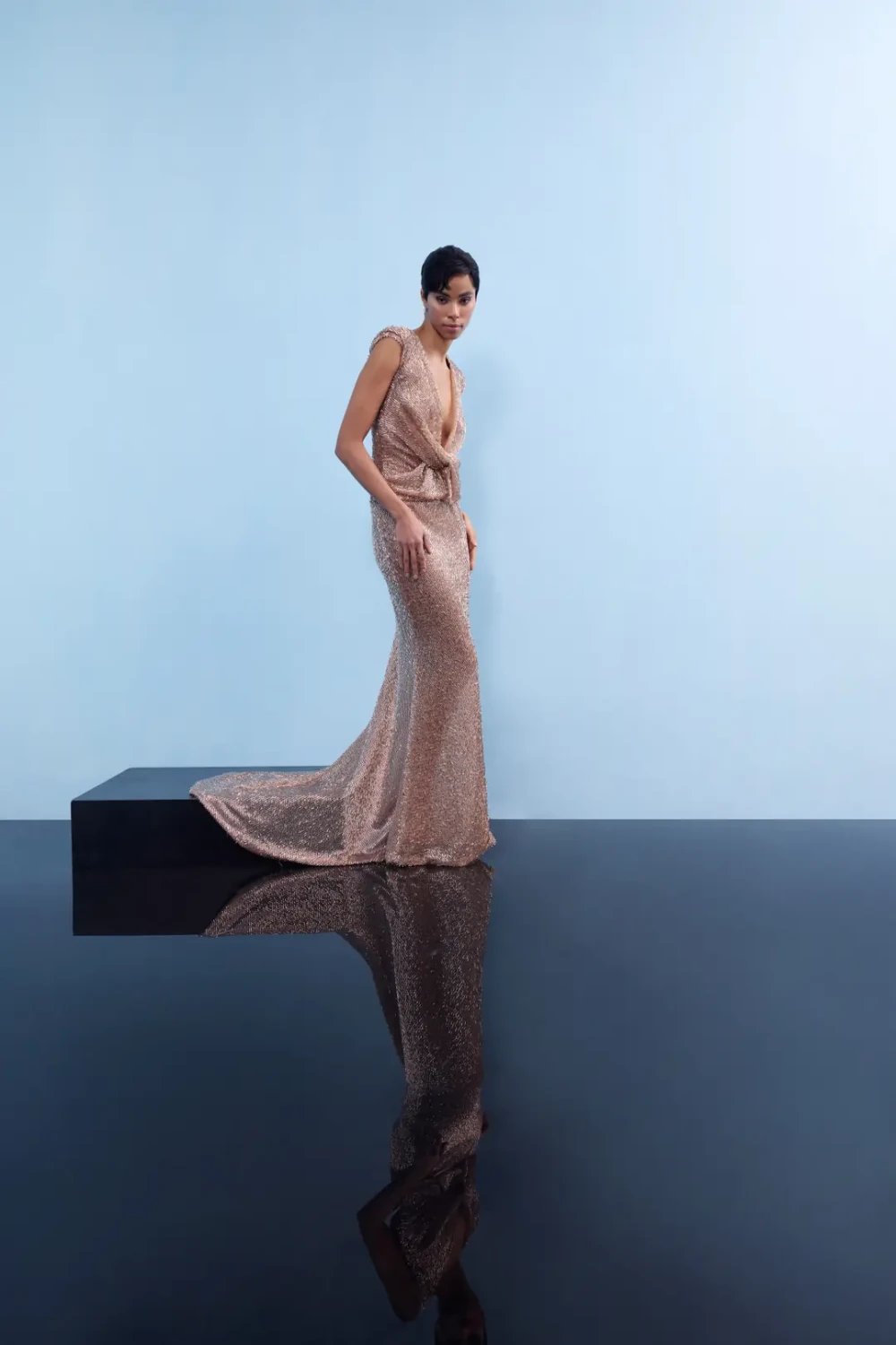 Özel yapım payetli kumaştan tasarlanmış bu gece elbisesi, şıklığı ve zarafetiyle etkileyici bir seçim sunuyor. Işıltılı payetler, elbiseye dikkat çekici bir parlaklık katarak gece boyunca ışıltınızı vurgular. Önden düğüm detayları, elbiseye modern ve şık bir dokunuş eklerken, fermuar detayı ise pratiklik sağlar. Uzun kuyruklu tasarımı, zarif bir siluet oluşturur ve elbiseye dramatik bir etki katar. Özel davetler ve gece etkinlikleri için mükemmel bir tercih olan bu elbise, stilinizi zarif ve etkileyici bir şekilde tamamlar.