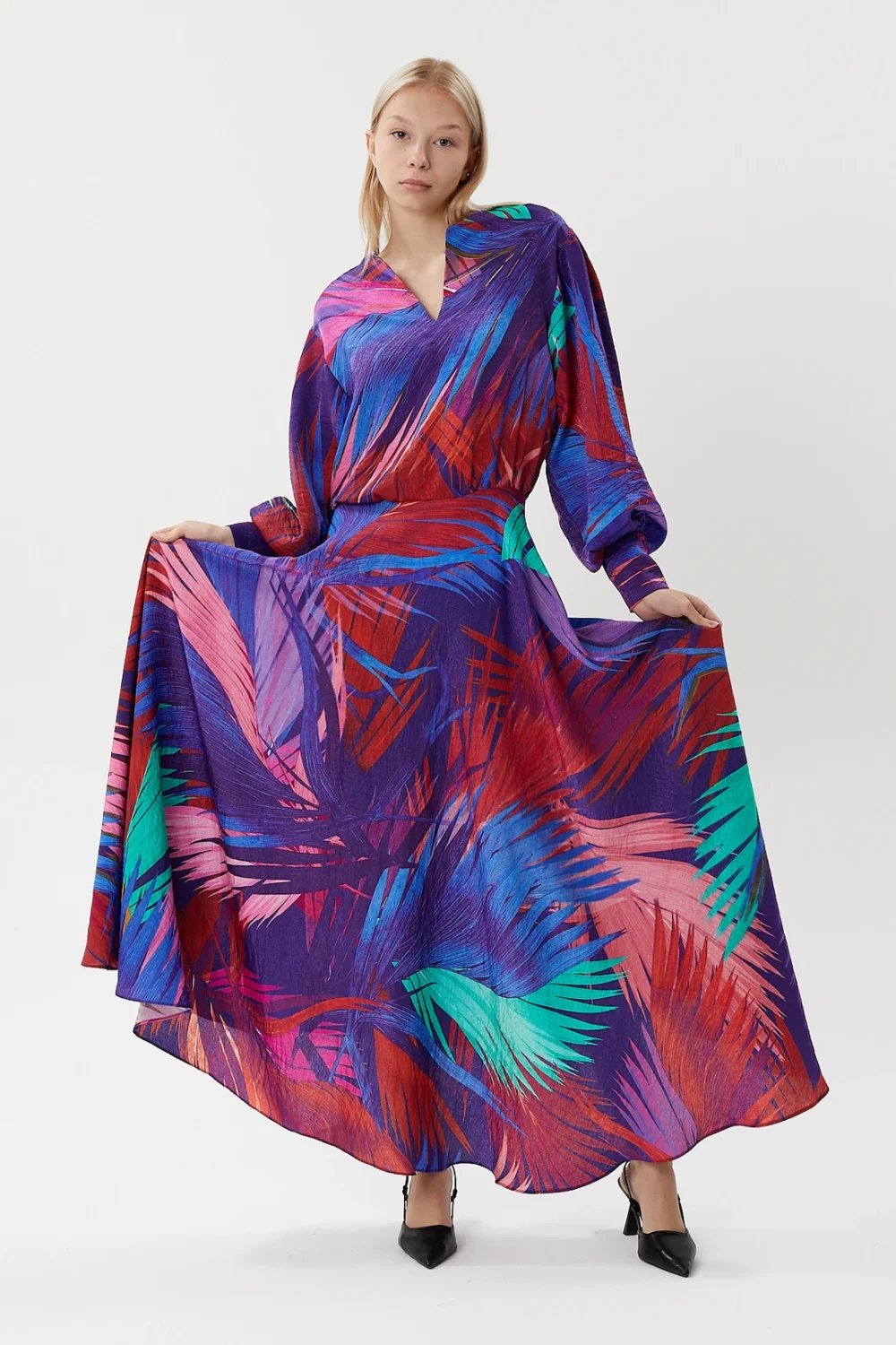 Tropikal desenli, saten viskon içinde parlak bir elyaf çeşidi bulunan, uzun bayan elbise