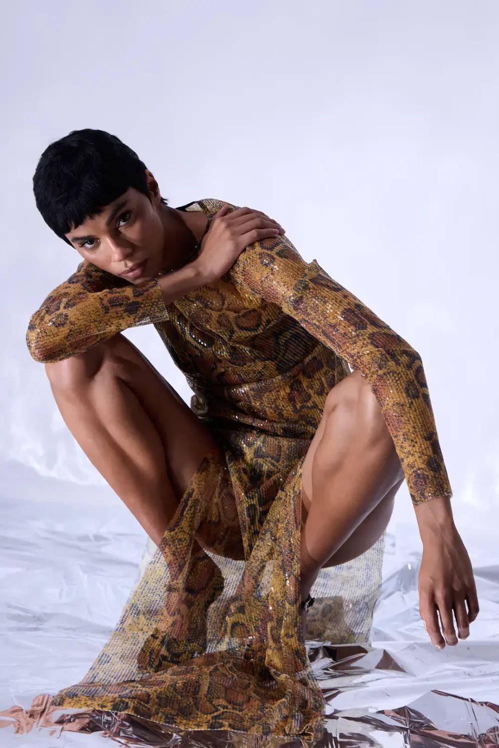 Yılan desenli, payetli kumaş, iki yandan derin yırtmaçlı, bayan gece elbisesi.