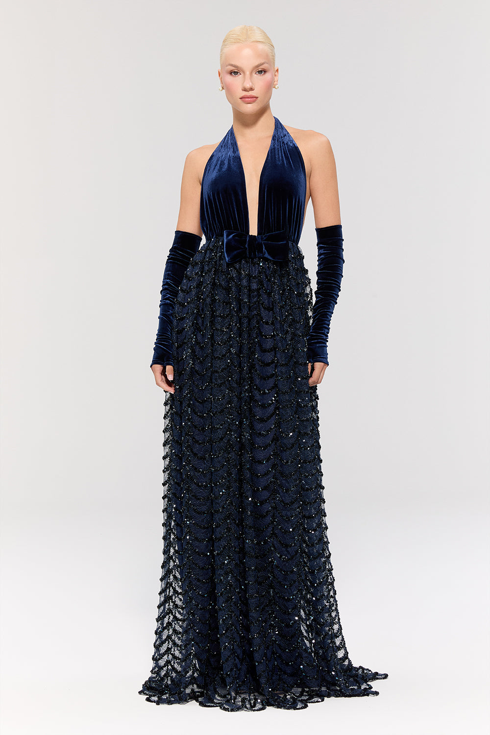 • Boyundan bağlamalı derin V yaka ve sırt dekoltesi feminen bir silüet oluştururken, beldeki kurdele detayı zarif bir dokunuş katar.