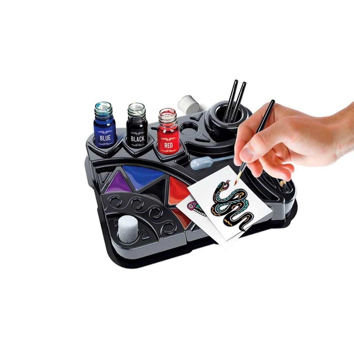 Bir laboratuvar, ama aynı zamanda modaya uygun ve havalı dövmeler yapmak için tüm ihtiyaçlara sahip harika bir set!Set, gerçek bir dövme sanatçısı gibi serbest dövmeler yapmak için bir çalışma tezgahı, keçeli kalemler, renklendirici sıvılar ve şablonlar içerir! Kılavuz, dövmelerin nasıl yapılacağını adım adım açıklıyor ve çocuğa eğlenceli ve ilgi çekici bir oyun deneyimi sunuyor. Setteki tüm kumaş ve malzemeler maksimum güvenlik sağlamak için dermatolojik olarak test edilmiştir. Yaratıcılığı ve el becerilerini harekete geçiren bir oyuncak.Kutu Ölçüsü: 38.5 x 28.2 x 7.7 cm