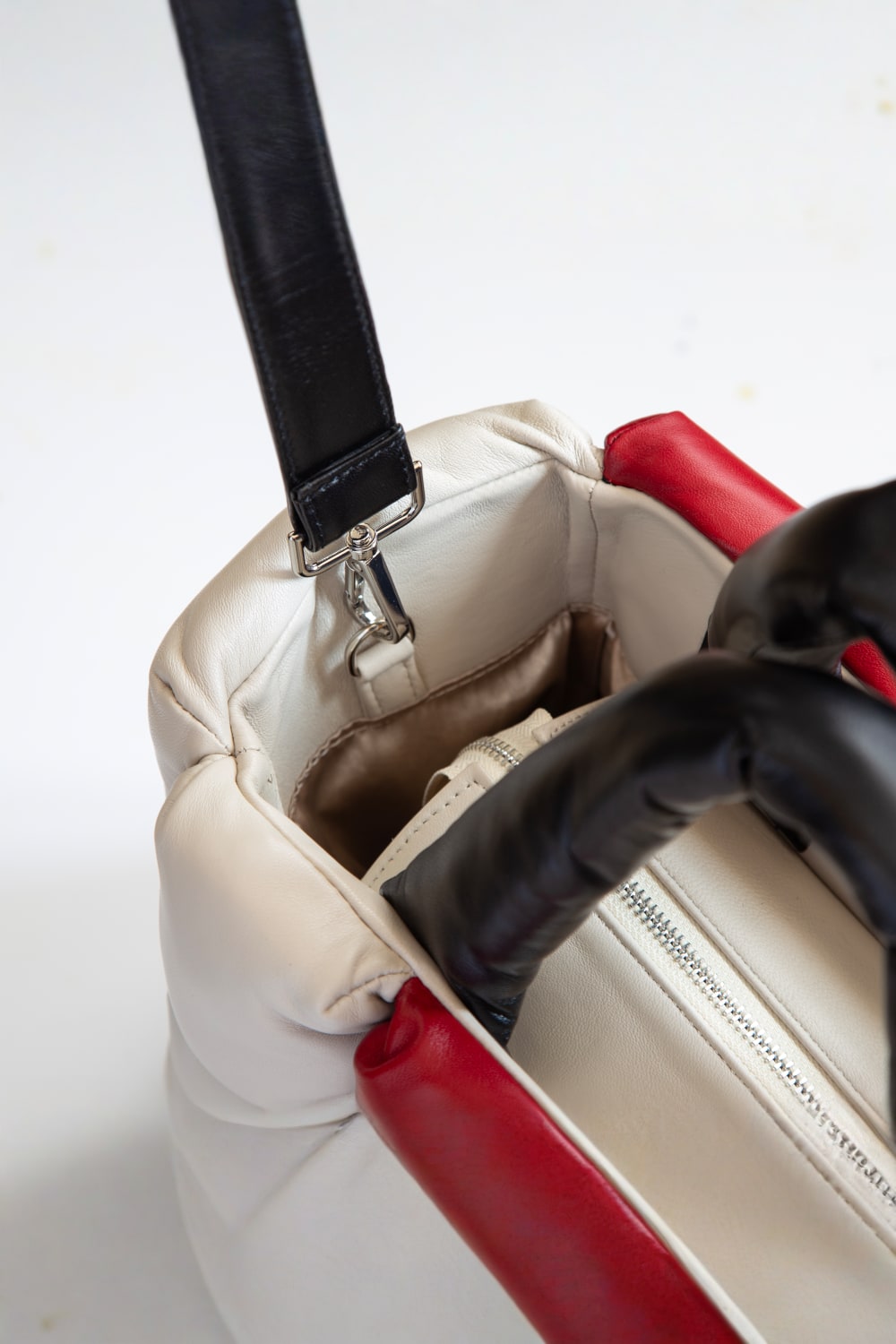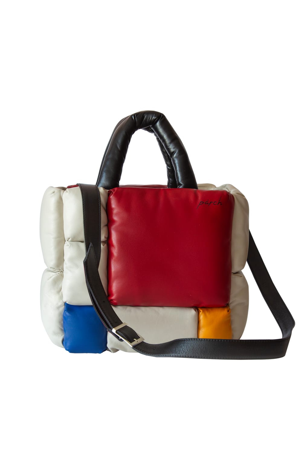 Kırmızı ana blok etrafında asimetrik şekilde yerleştirilmiş beyaz, mavi, sarı ve siyah renk blokları, çantaya hem dikkat çekici hem de zamansız bir estetik kazandırıyor. %100 doğal kuzu derisinden, el işçiliğiyle üretilen bu tasarım; yumuşak viskon astarı, gümüş renkli fermuarı ve üç iç cebiyle günlük kullanıma işlevsel bir zarafet katıyor.