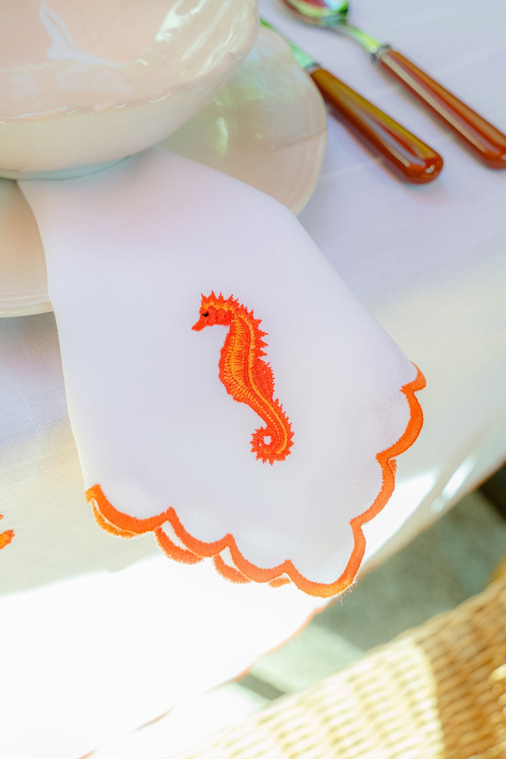 Denizin büyüsünü sofranıza taşıyan Denizatı Peçete, turuncunun enerjisini zarif bir denizatı nakışıyla buluşturuyor. Beyaz keten/pamuk karışımı zemin üzerine işlenen turuncu biyeler ve ince detaylar, sofranıza hem canlılık hem de sofistike bir dokunuş katıyor.