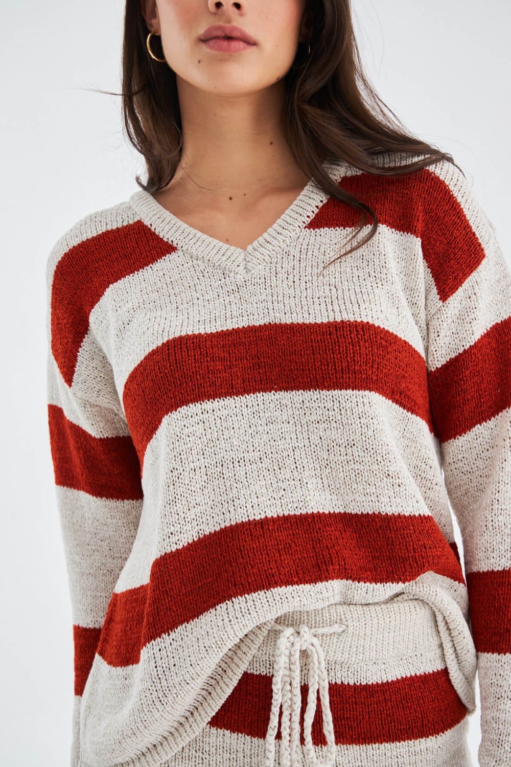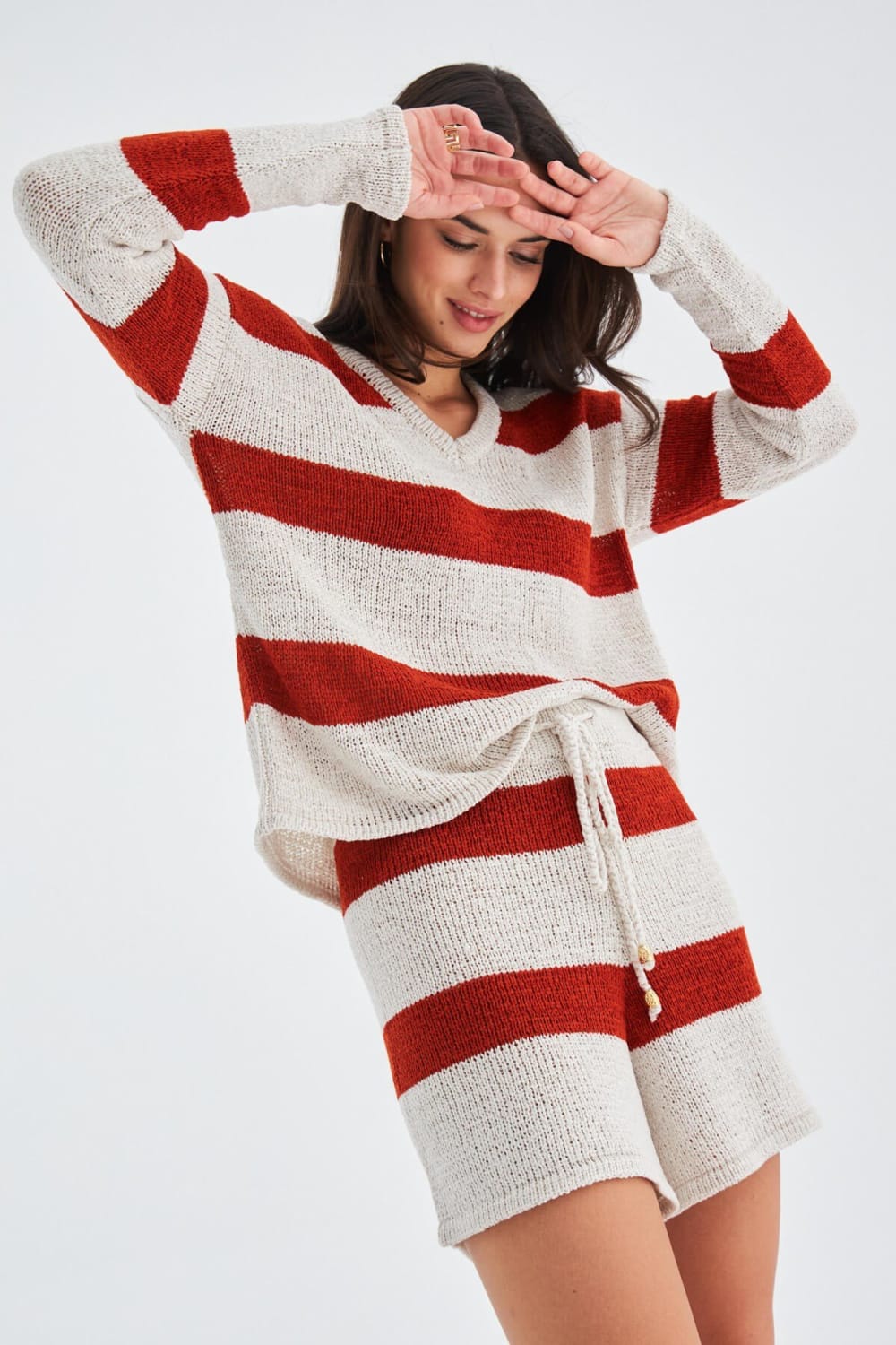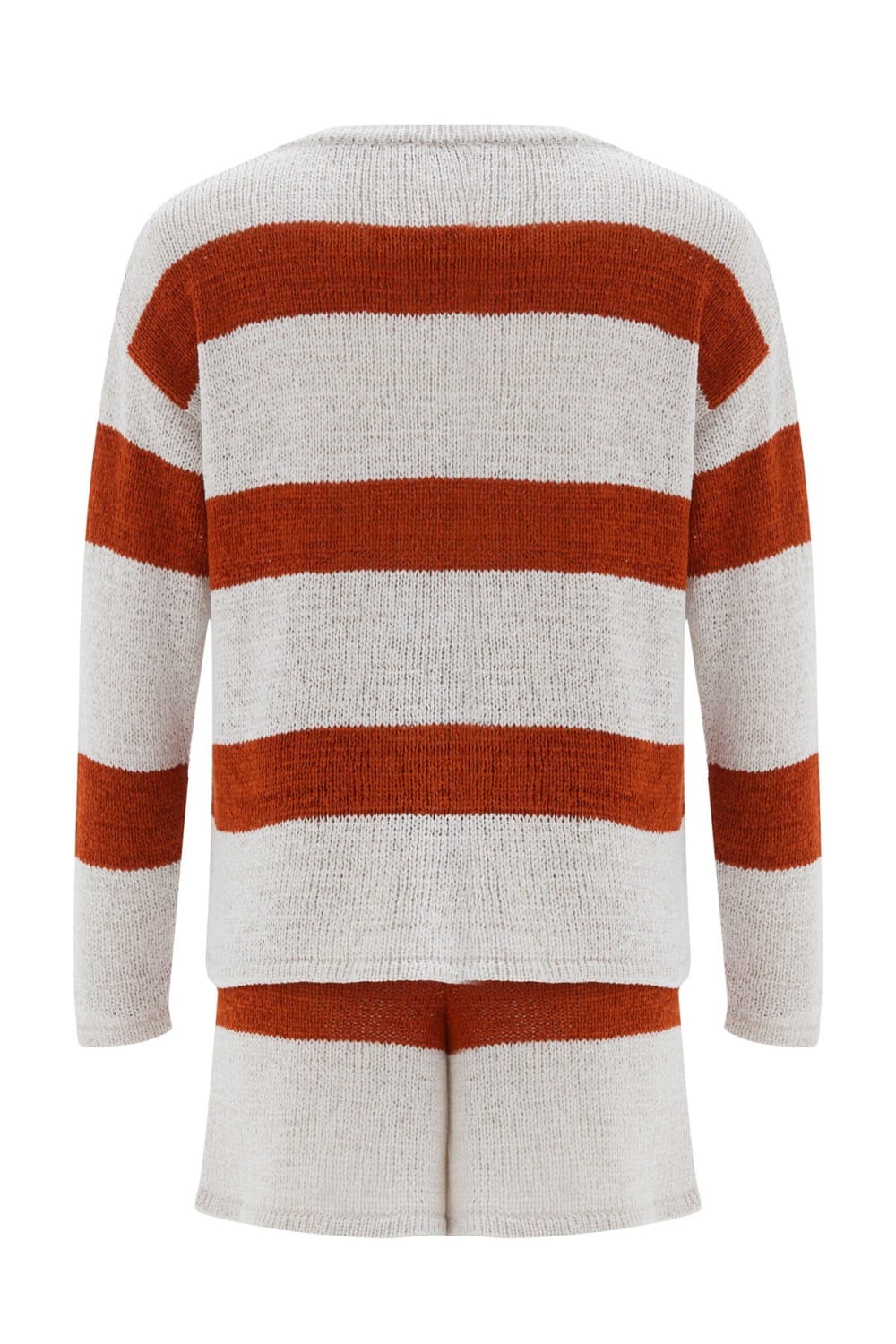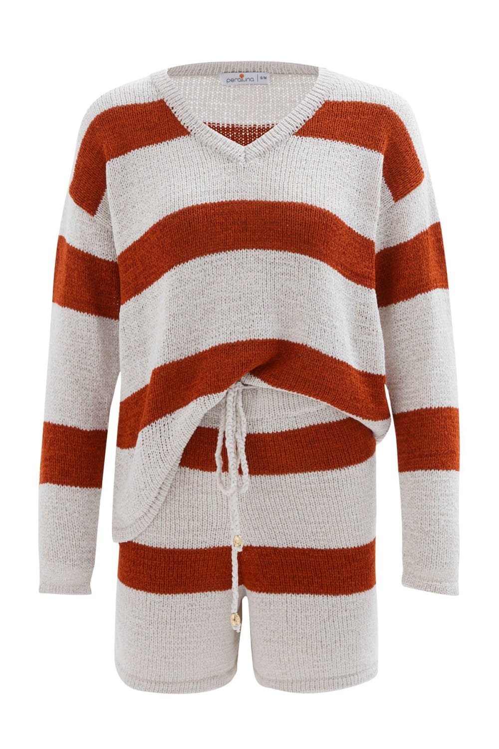 Conjunto de pantalones cortos de punto de manga larga a rayas para mujer Siena, blusa y pantalones cortos, Crema/Piedra