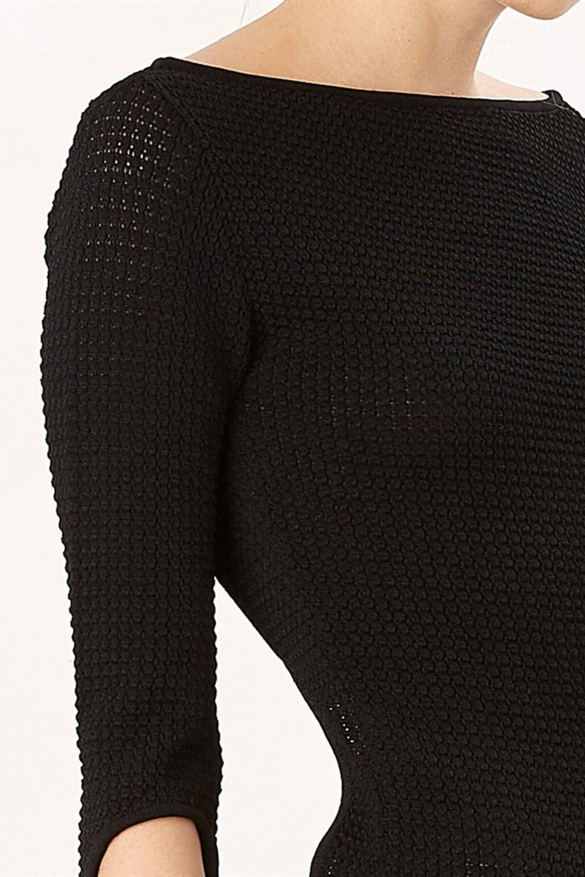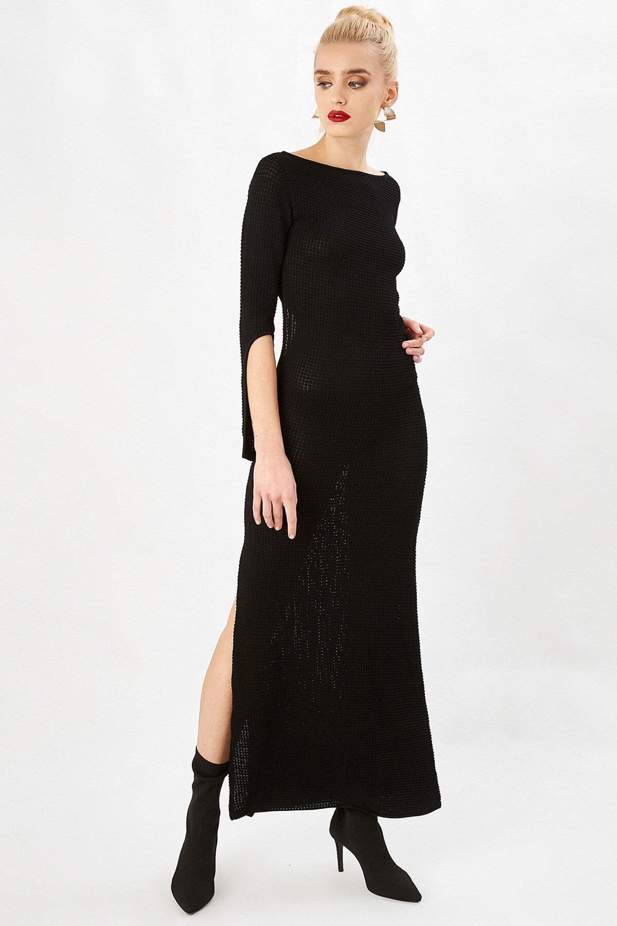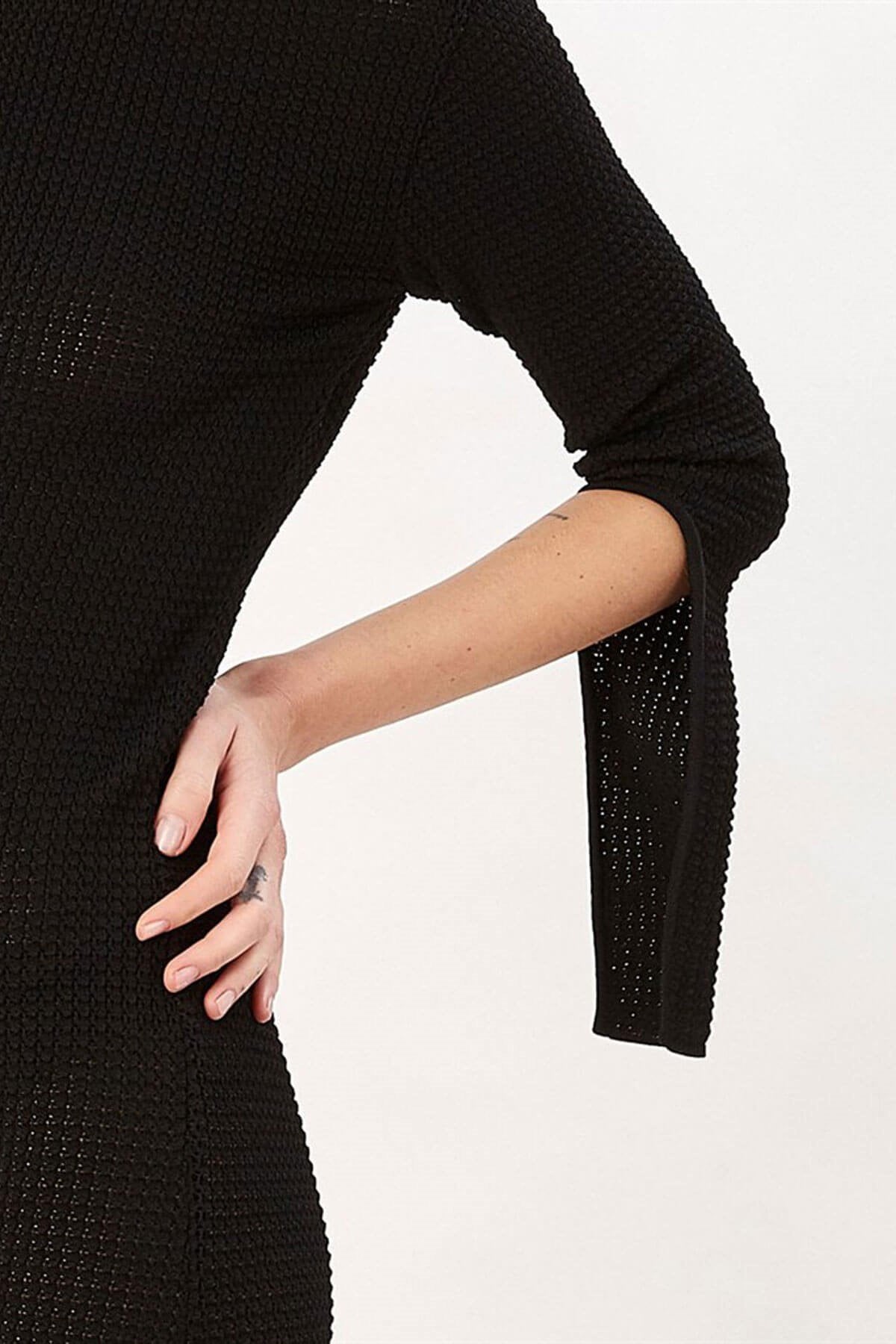 Sırtı açık abiye elbise, kol uçlarındaki kesim şekli ve derin sırt dekoltesi ile biraz şakacı. Elbisenin boyunu uzun tuttuk, o yüzden bol keseden şık bir yan yırtmacı hak etti. Hem şık olmak hemde rahat etmek isteyenlerin çok rahat edeceği bir elbise. Çok özel bir dokusu var fotolardan da görebileceğiniz gibi. Ütüsünü ihmal ettim derdi yok çünkü pek kolay kırışmaz. Ne kadar giyseniz de, ne kadar yıkasanız da bu elbise formunu asla kaybetmez ve tüylenmez, rengi de solmaz. Yıllarca gardrobunuzda tutabilirsiniz. Örgüsü yumuşacık viskon karısımlı iplikten yapıldı. Siyah rengi harika duruyor üstte. Tabi olmazsa olmaz Bordosunu da yapmadan edemezdik. Materyal Bilgileri: %65 Viskon - %35 Naylon