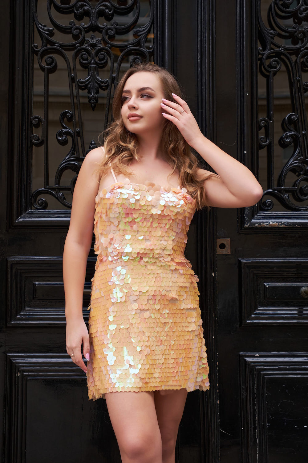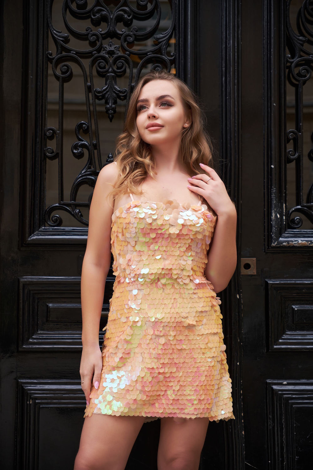Şeftali Bolerolu payetli elbise , özel günleriniz için şahane bir seçim olacaktır .Üst kısmında içten balen destekleri bulunan büstiyer, göğüs bölgesinde sıkı bir oturuş sağlarken , arkadaki ayarlanabilir korse bağlama detayı sayesinde rahatça uyum sağlar. Elbisemiz Belden fit oturan etekte ise rahat A- kesim şeklindedir . Dore şeftali rengin parlak etkisi , ışıltılı payetlerle birleşerek elbiseyi özel davetler ve Party geceleri için mükemmel tercihiniz olacaktır.
