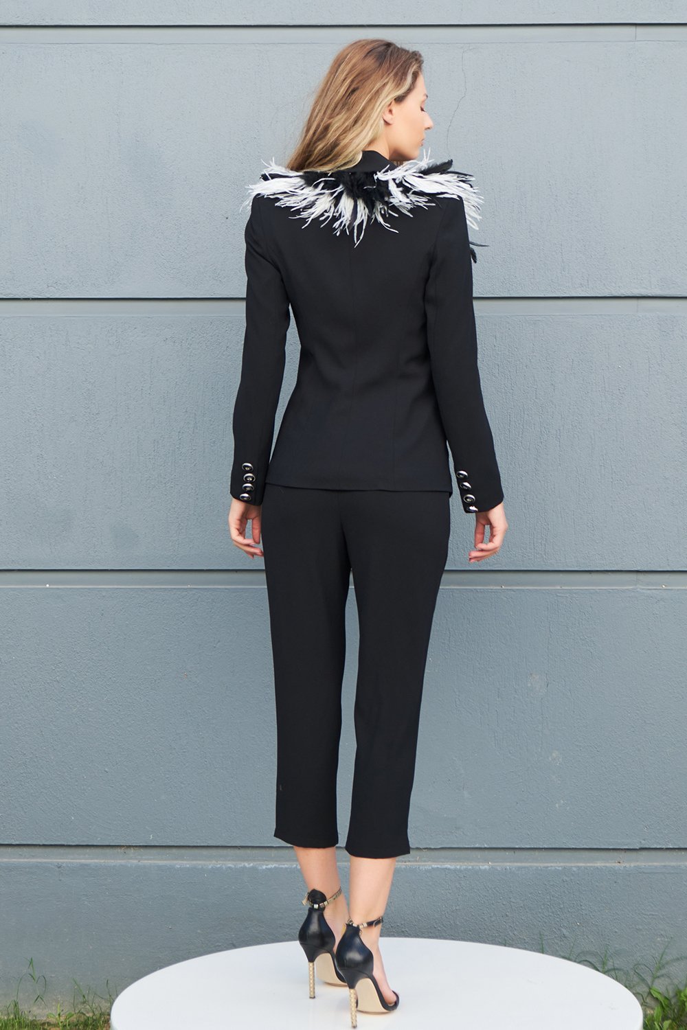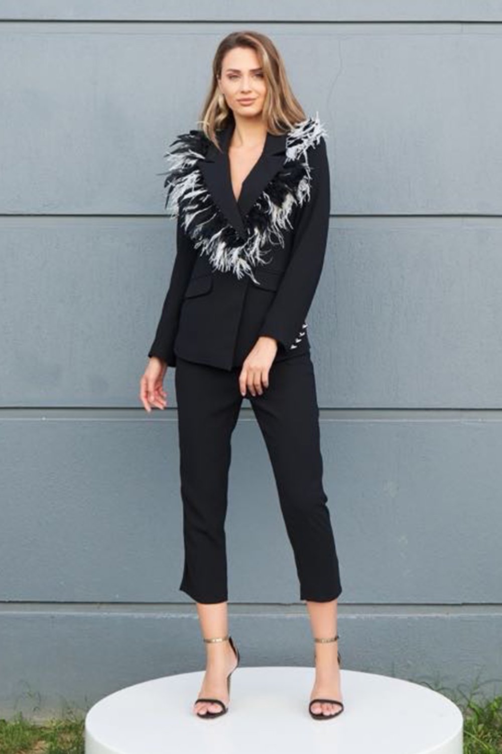 Otriş detaylı standart düz kesimli siyah ceket ve yüksek bel pantolon takım . Düz , bol kesime sahip bu ceketin, yaka etrafı siyah beyaz otriş tüyler ile çevrili , yanlarında cepleri mevcuttur . Pantolon, yüksek bel kesimli ve kumaş tokalı kemerlidir . Bu model takım olarak satılmaktadır . Mat bir dokuya sahip polyester kumaştan üretilmiştir . Pantolon boyu Görseldeki manken uzun olduğu için kısa oldukça kalmıştır . Standart boy bayanlar için üretilmiştir