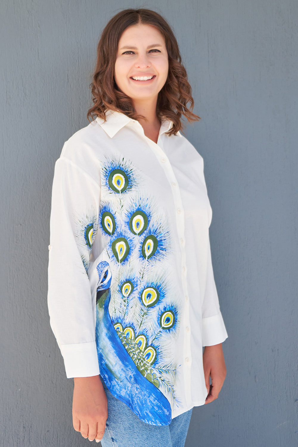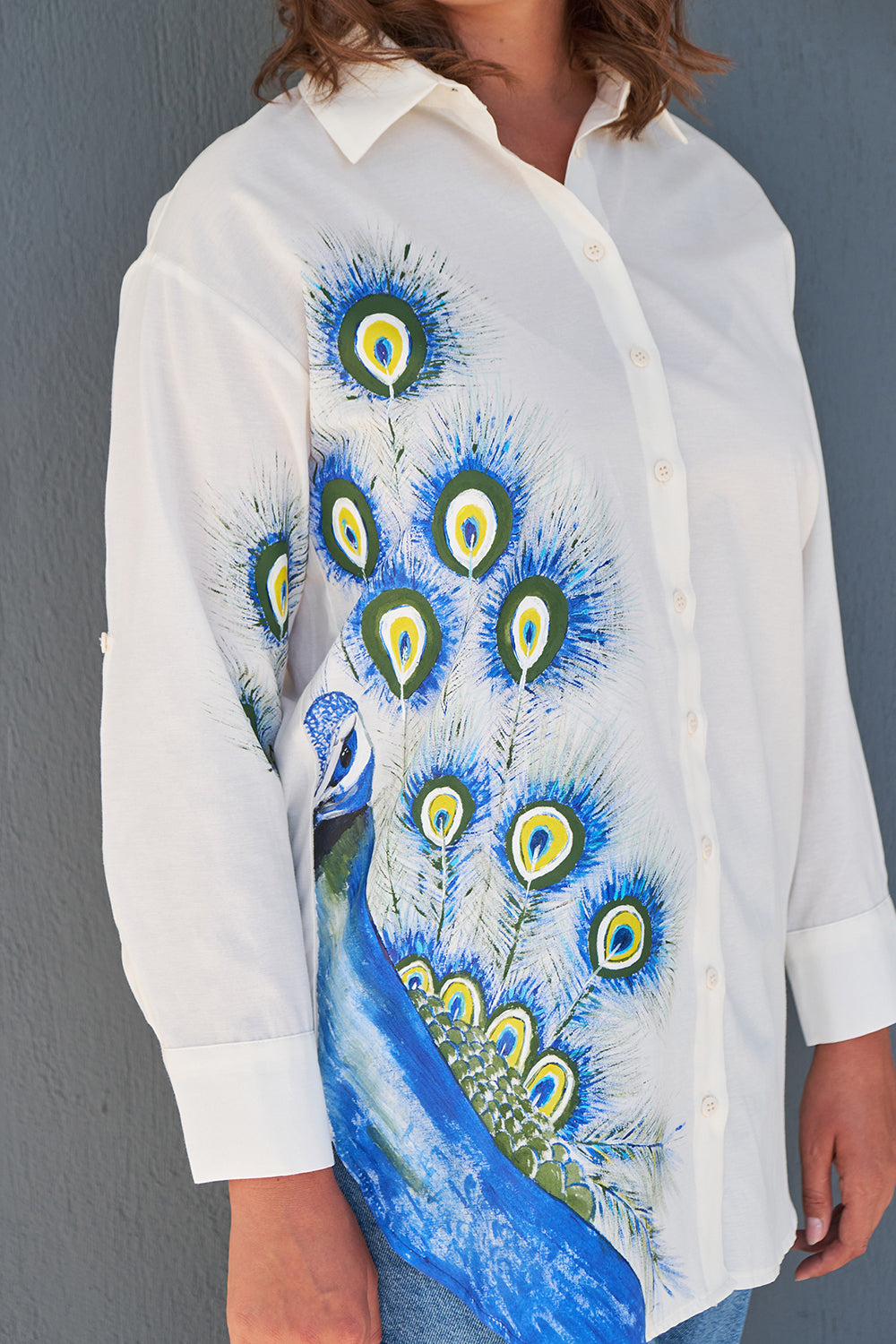 Bol kesim el çizimi kırık beyaz gömlek. Önü düğmeli, yumuşak Poplin kumaştan üretilmiştir. El çizimi olan bu gömleklerimiz her biri tamamen eşsiz ve sınırlı sayıda üretilmiştir. Dilediğiniz gibi kombinleyebilir, özellikle yaz ve geçiş aylarında gardırobunuzun bir star parçası olabilir.