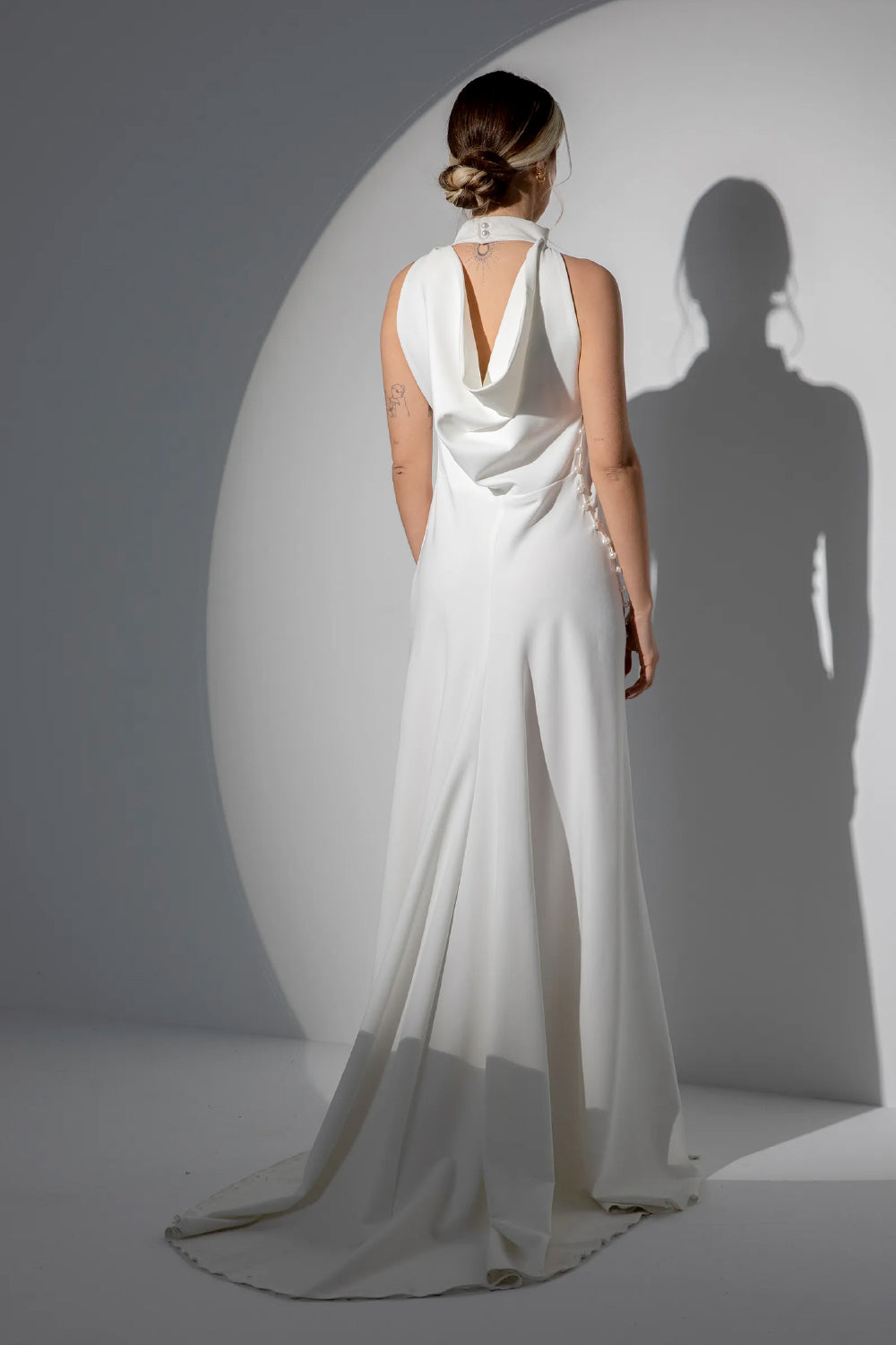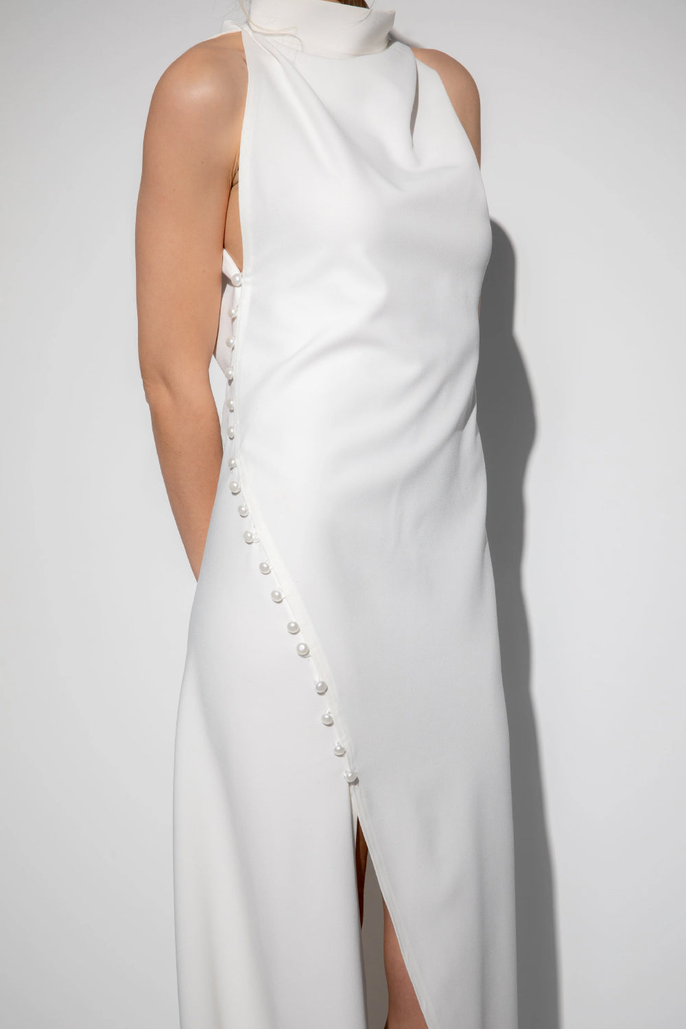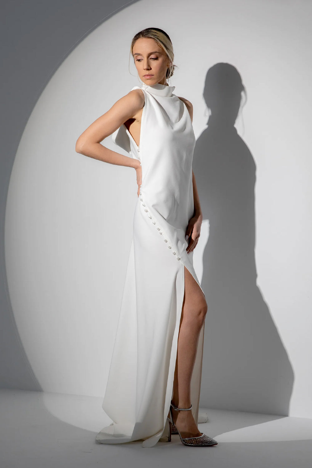 Yandan yırtmaçlı, inci düğmeli, degaje sırt detaylı kuyruklu beyaz elbise.