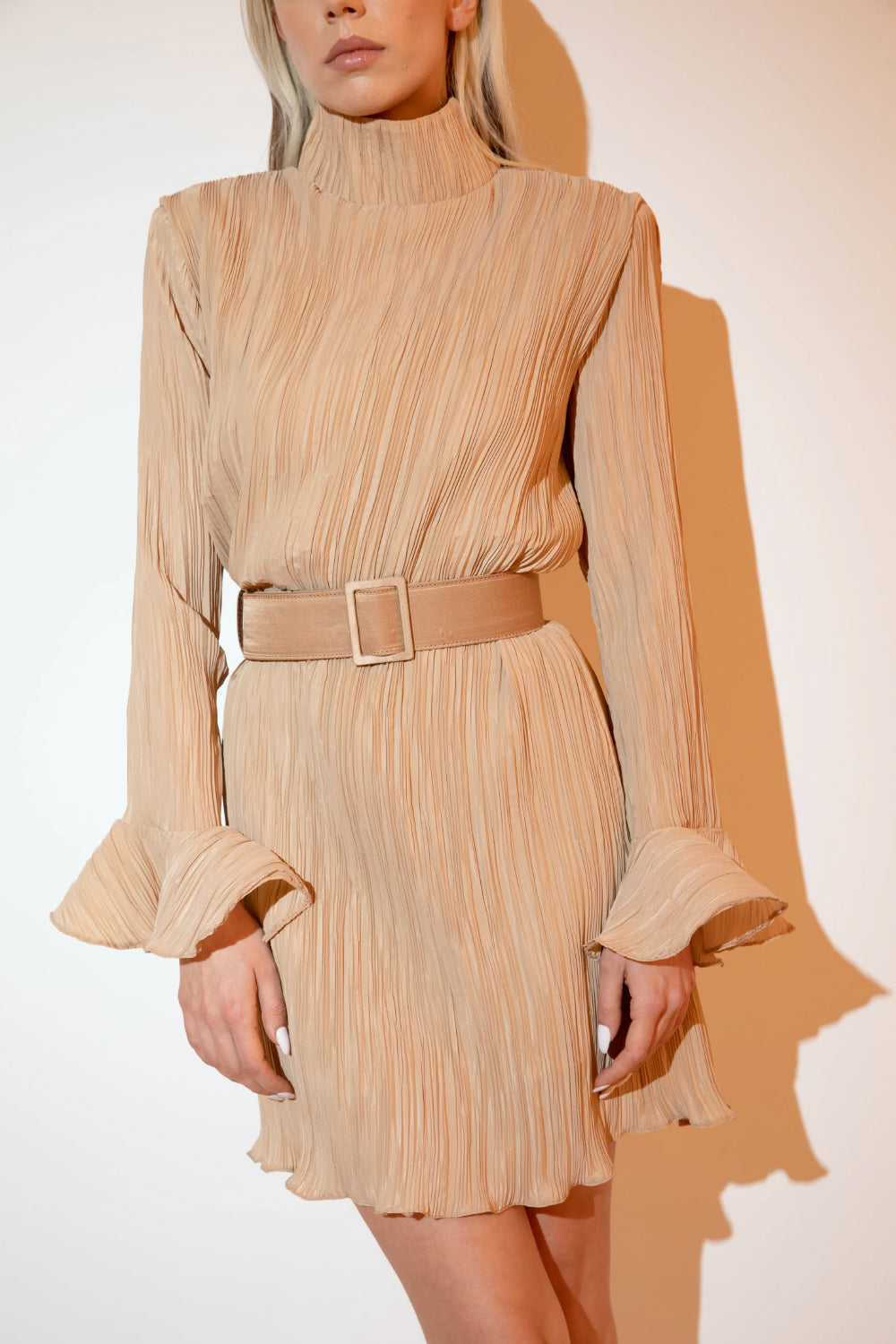 No9 Bej Fırfır Kol Kemerli Elbise