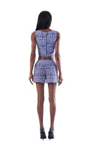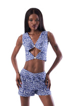 İnci Dokulu Gold Detaylı Kare Aksesuarlı, Dokulu Kumaşa Mermaid Desen Baskılı, Cut out Detaylı, V Yaka, Kolsuz Tasarım Crop Top.