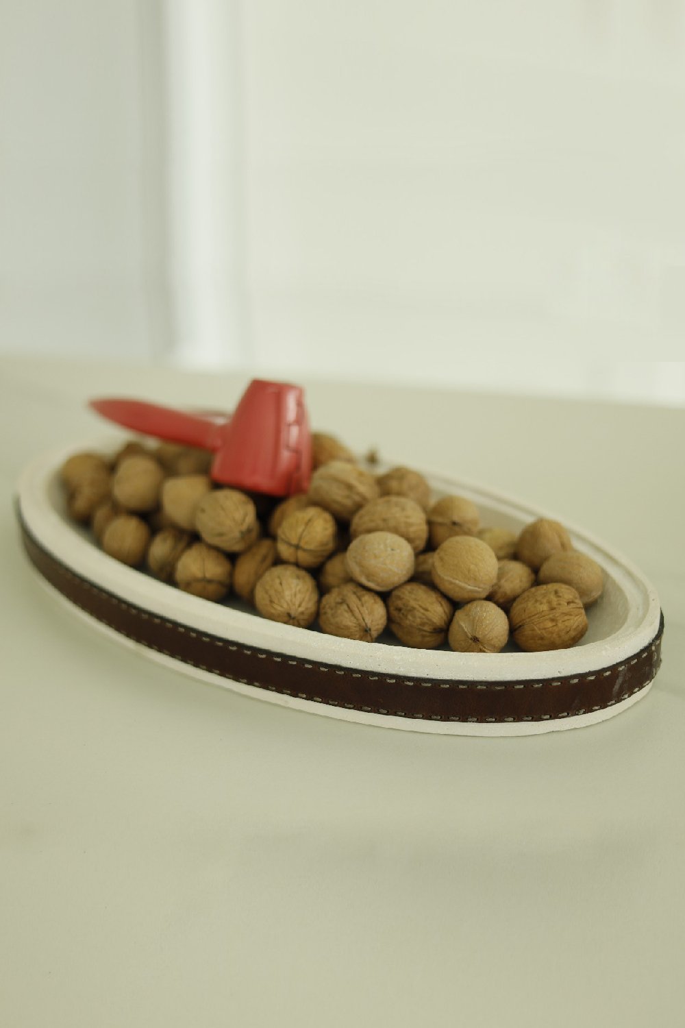 Benzersiz mermer yüzeyi, her ürünü tek ve özel kılar. Çevresini saran deri kaplama, hem modern hem de klasik dekorasyon stilleriyle kusursuz uyum sağlar. Kuruyemiş, çikolata ve atıştırmalık sunumlarından takı ve aksesuar düzenlemeye kadar çok yönlü kullanım imkanı sunan bu kase, mekanlarınıza lüks bir hava katmak için ideal bir tamamlayıcıdır.