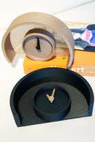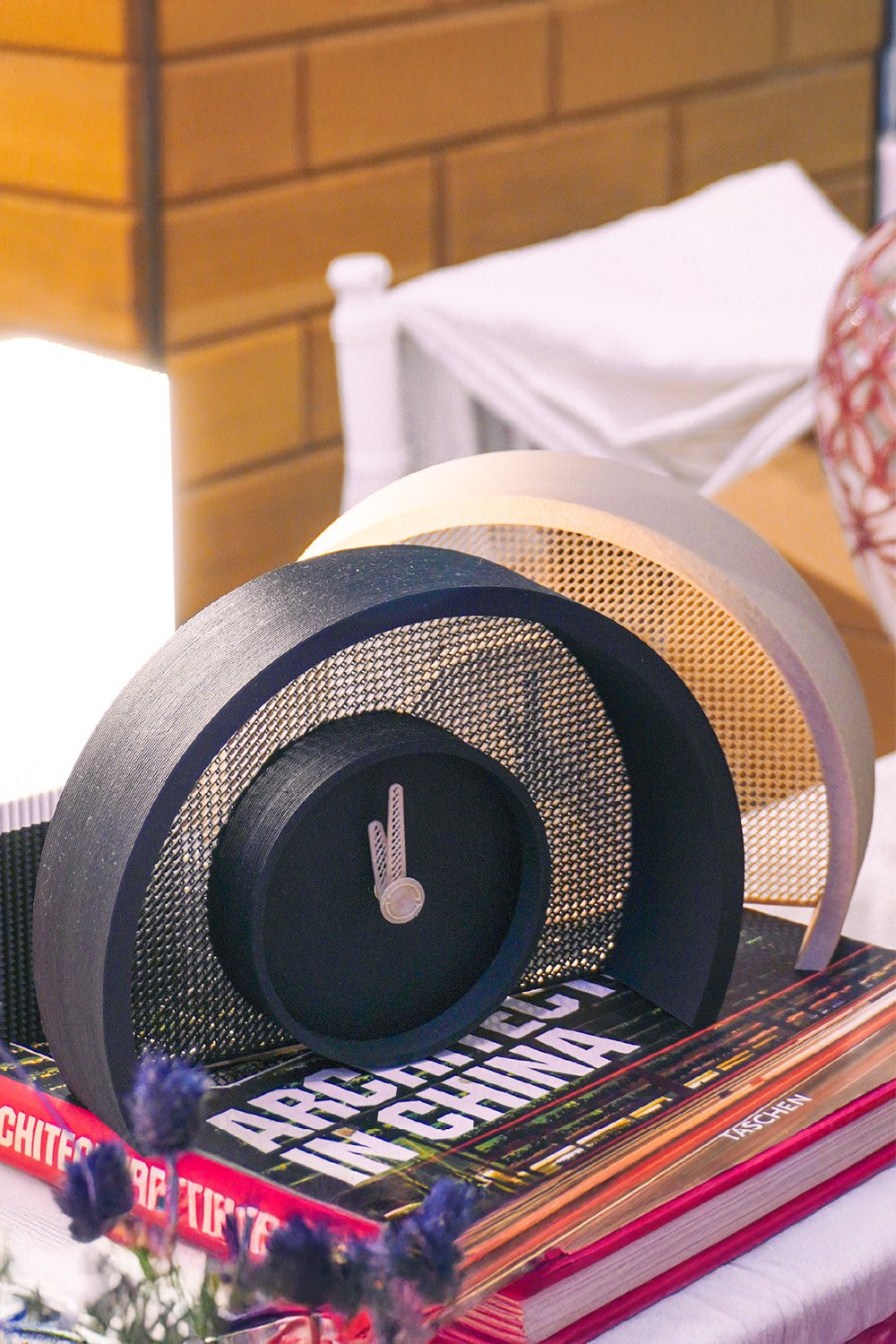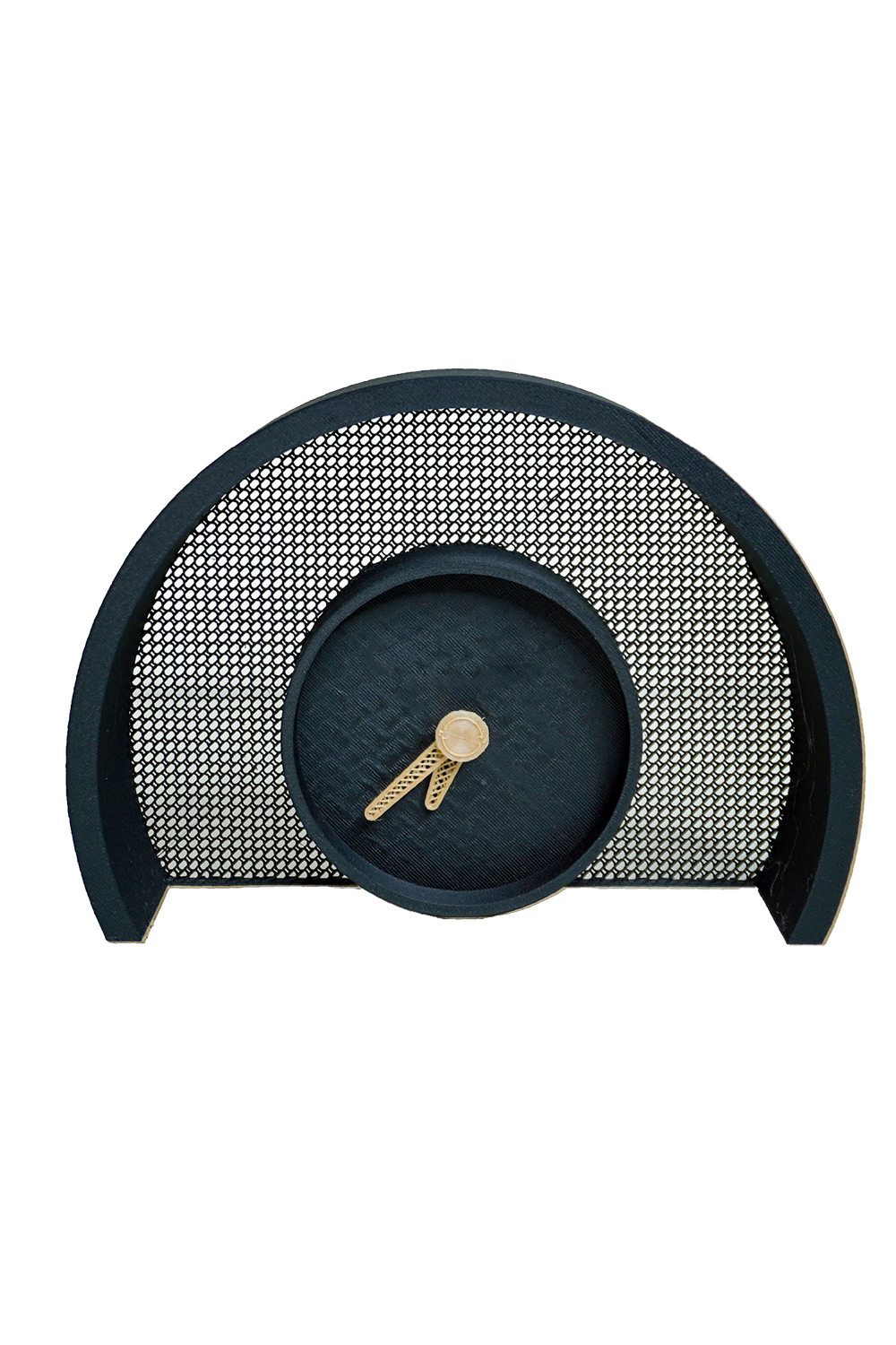 Yarım daire formuyla dikkat çeken bu masa saati, ahşap dokusunu modern tasarımla buluşturuyor. Arka yüzeyindeki ince kafes deseni, saate zarif bir transparanlık kazandırırken, mekâna hafif ve sofistike bir atmosfer katıyor. Doğal ve şık bir aksesuar arayanlar için ideal.