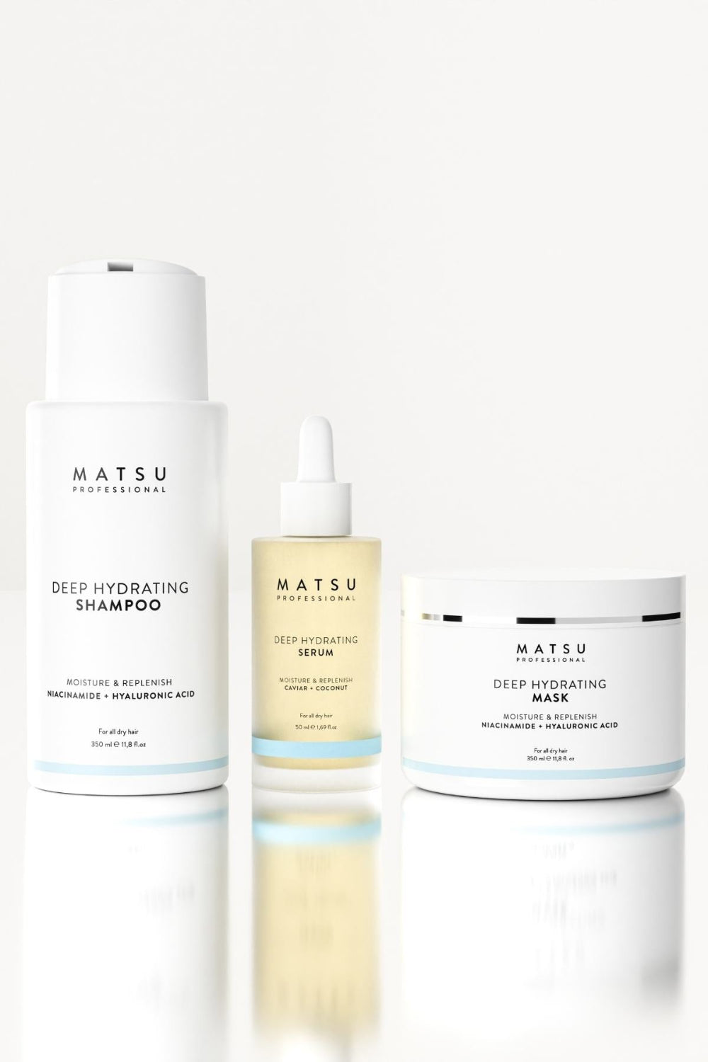 Deep Hydrating Yoğun Nem Şampuanı (350 ml), Hyaluronik Asit ve Niasinamid içeriğiyle saç tellerine yoğun nem kazandırır, kuruluğu azaltarak daha parlak ve sağlıklı bir görünüm sağlar. Deep Hydrating Yoğun Nem Maskesi (350 ml), 17 bitkisel kompleks ile saçı derinlemesine besleyerek uzun süreli nem sağlar, saçın elastikiyetini artırarak kırılmaları önler. Deep Hydrating Kuru Saçlar için Yoğun Nem Serumu (50 ml), Havyar ve bitkisel yağlarla zenginleştirilmiş içeriğiyle saçı ağırlaştırmadan nemlendirir, anında yumuşaklık ve parlaklık kazandırır.