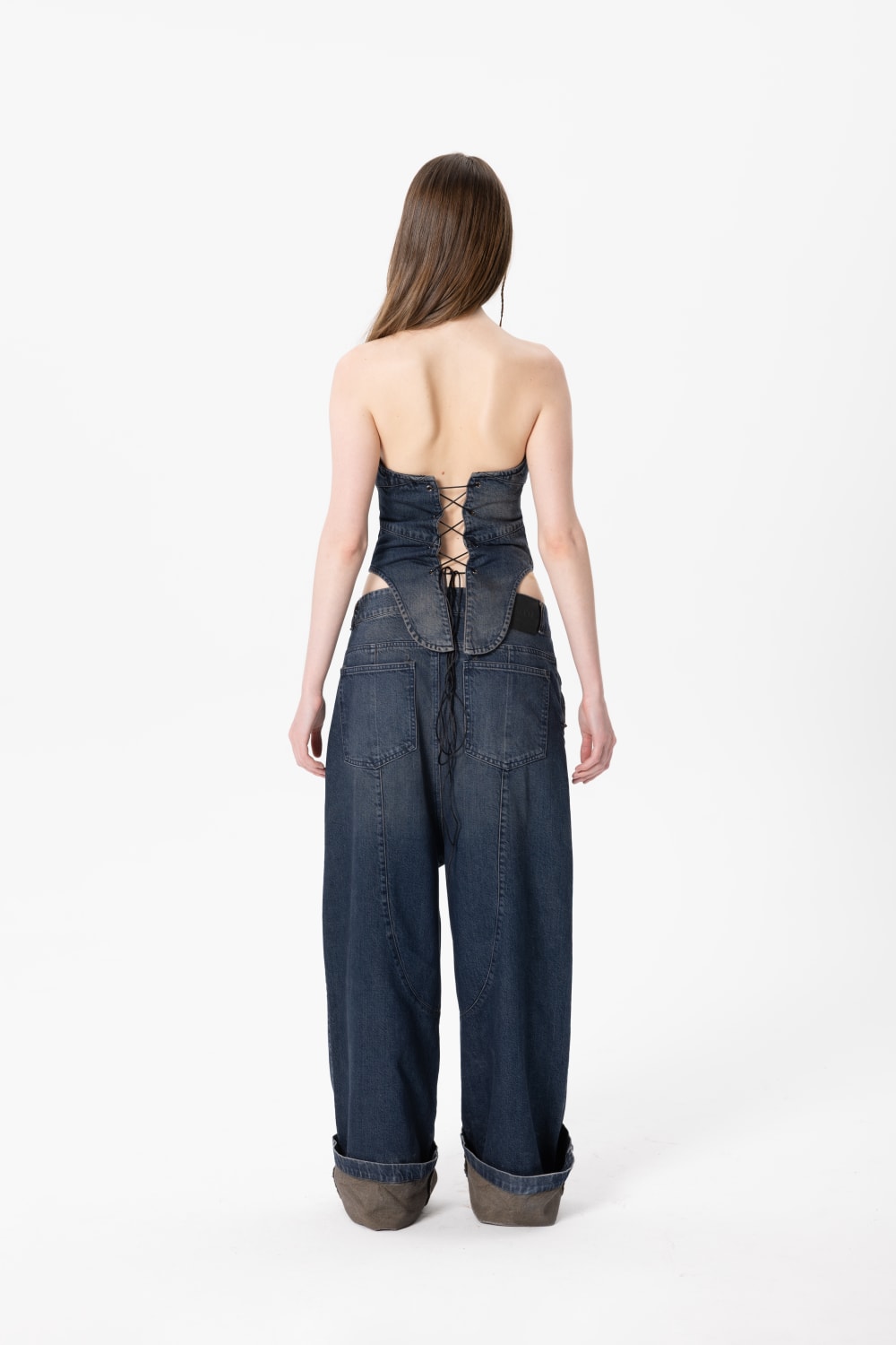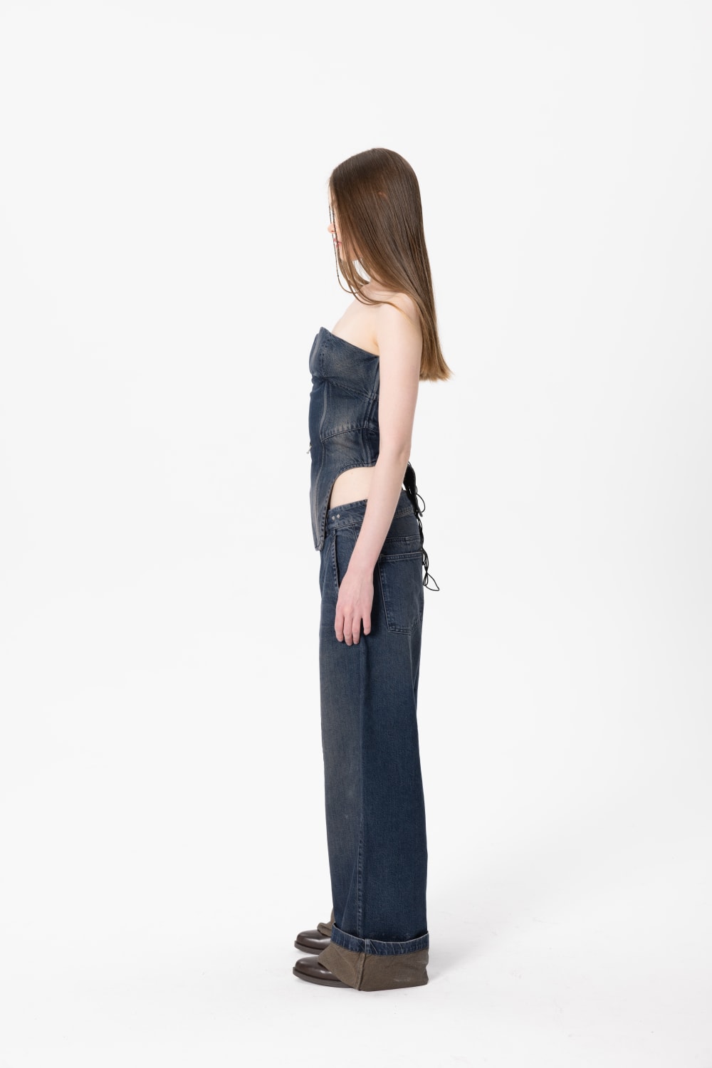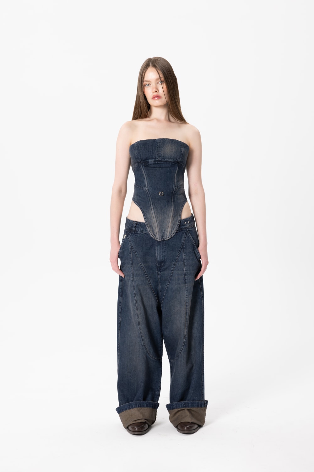%100 pamuklu denimden üretilen bu korse, çevre dostu bir görünüm için sürdürülebilir tekniklerle yıkanmıştır. Ortadaki metal detay, tasarıma cesur ve modern bir dokunuş katıyor. Günlük veya iddialı görünümünüzü zenginleştirecek, göz alıcı bir parça.