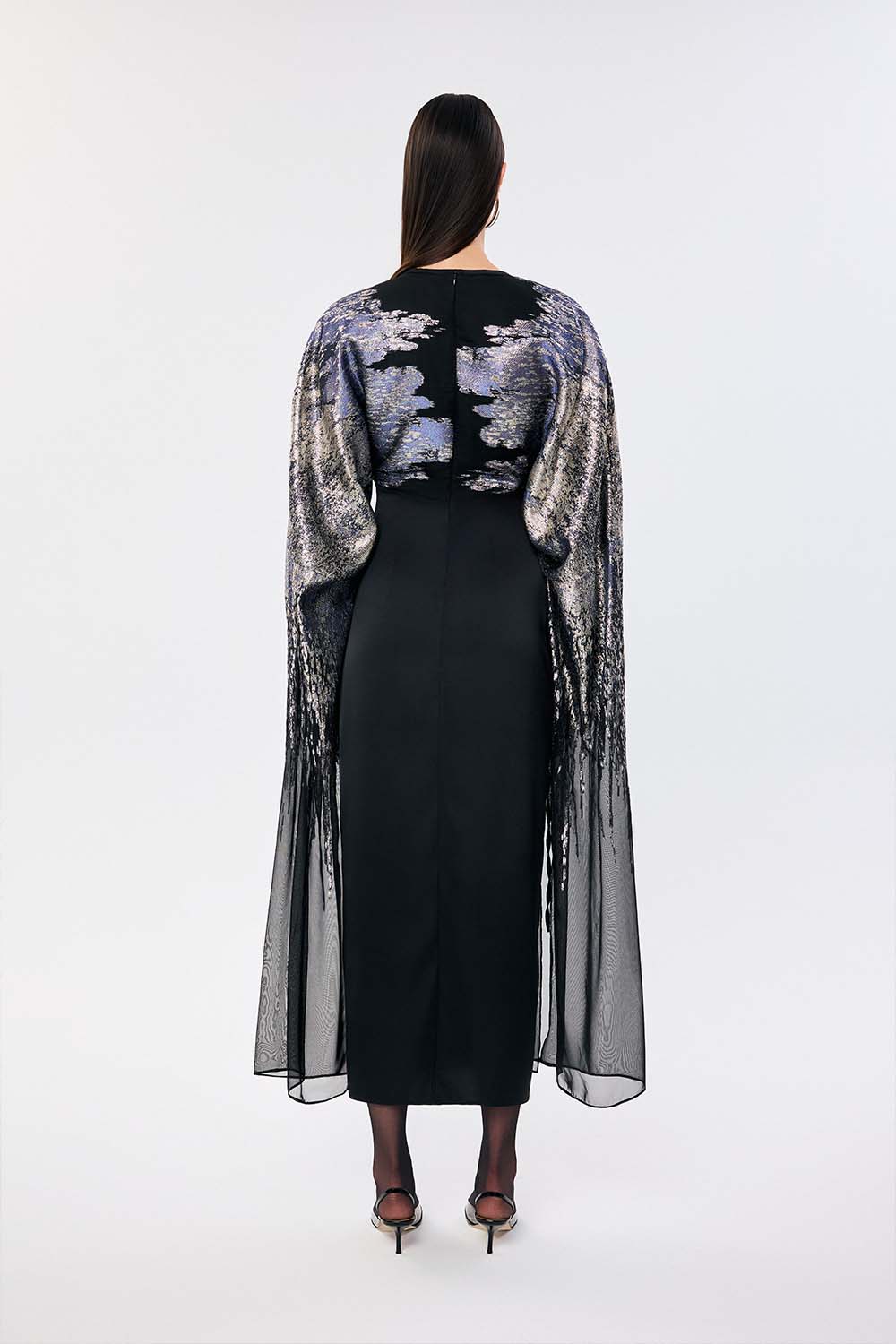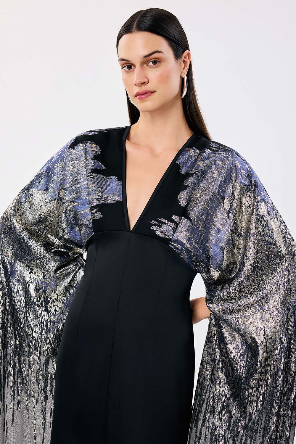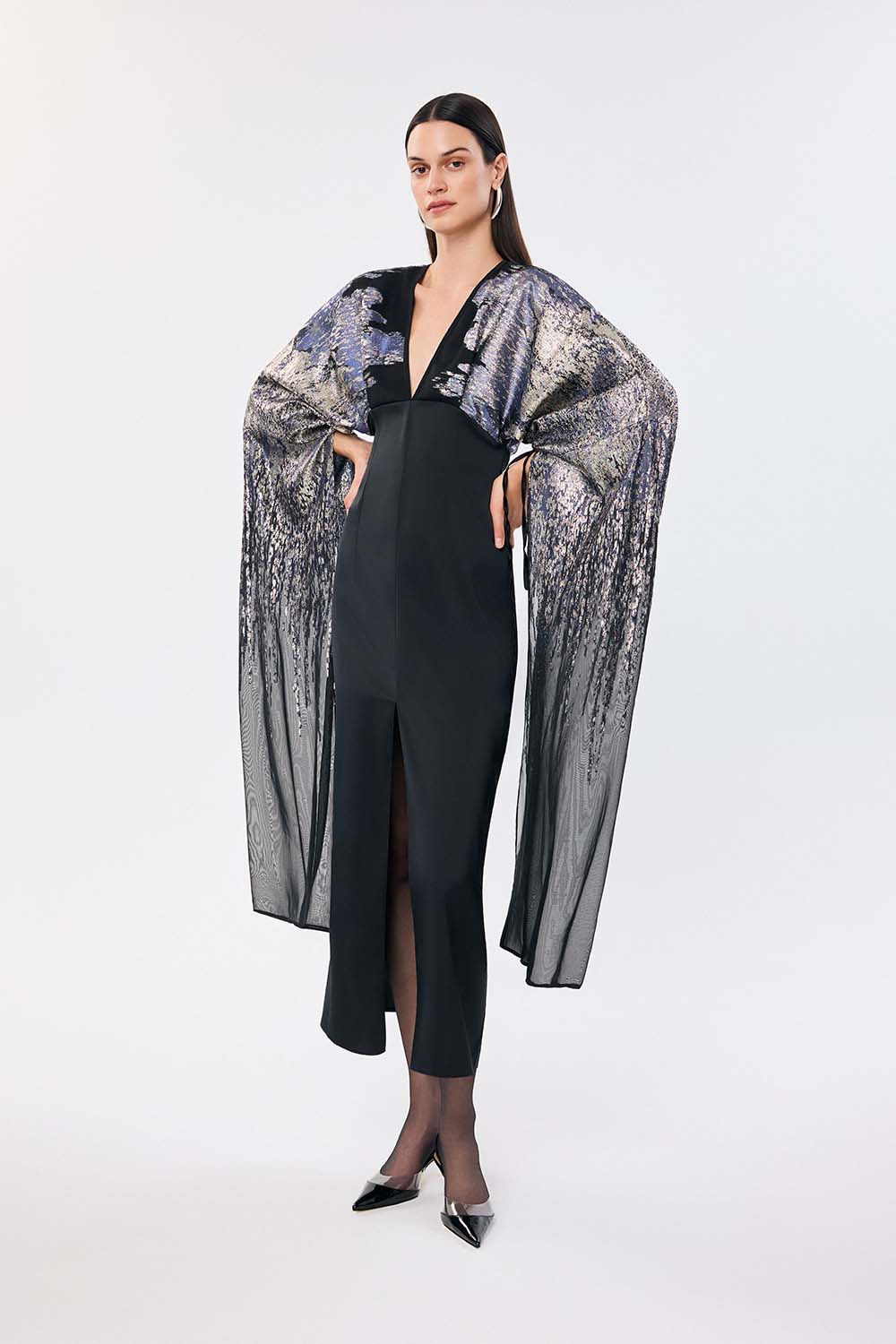 Aquila is a dramatic dress that merges celestial fantasy with sharp tailoring. Its deep V-neckline and sculpted waist create a statuesque silhouette, while the sheer, metallic sleeves cascade like stardust in motion. The ombré shimmer evokes the twilight sky, turning each gesture into a performance. Lightweight yet impactful, Aquila is designed for those who move like constellations and dress with intention.