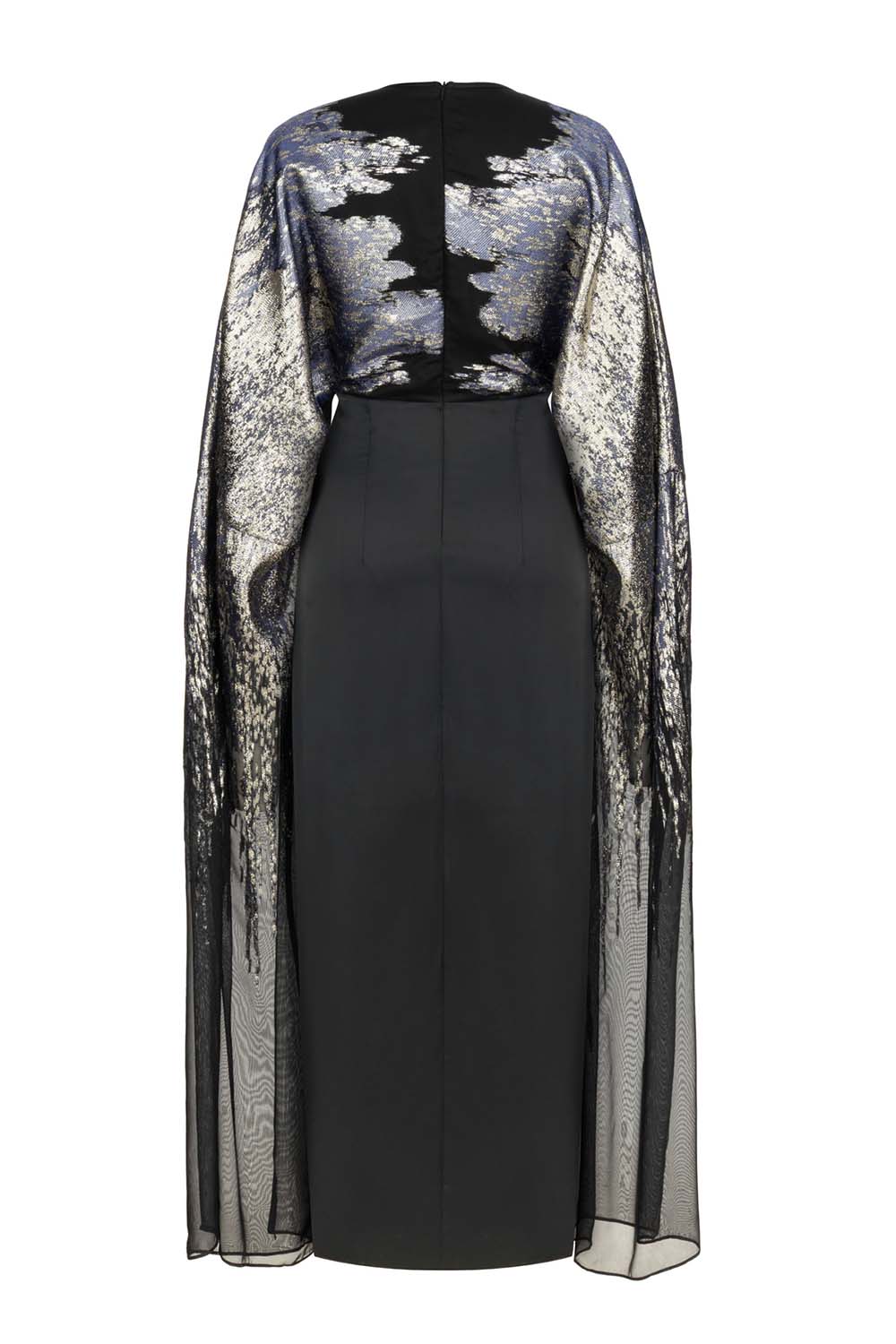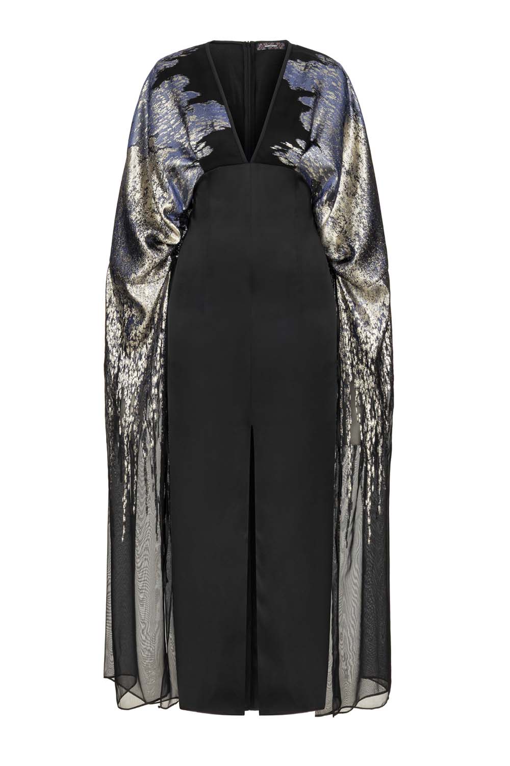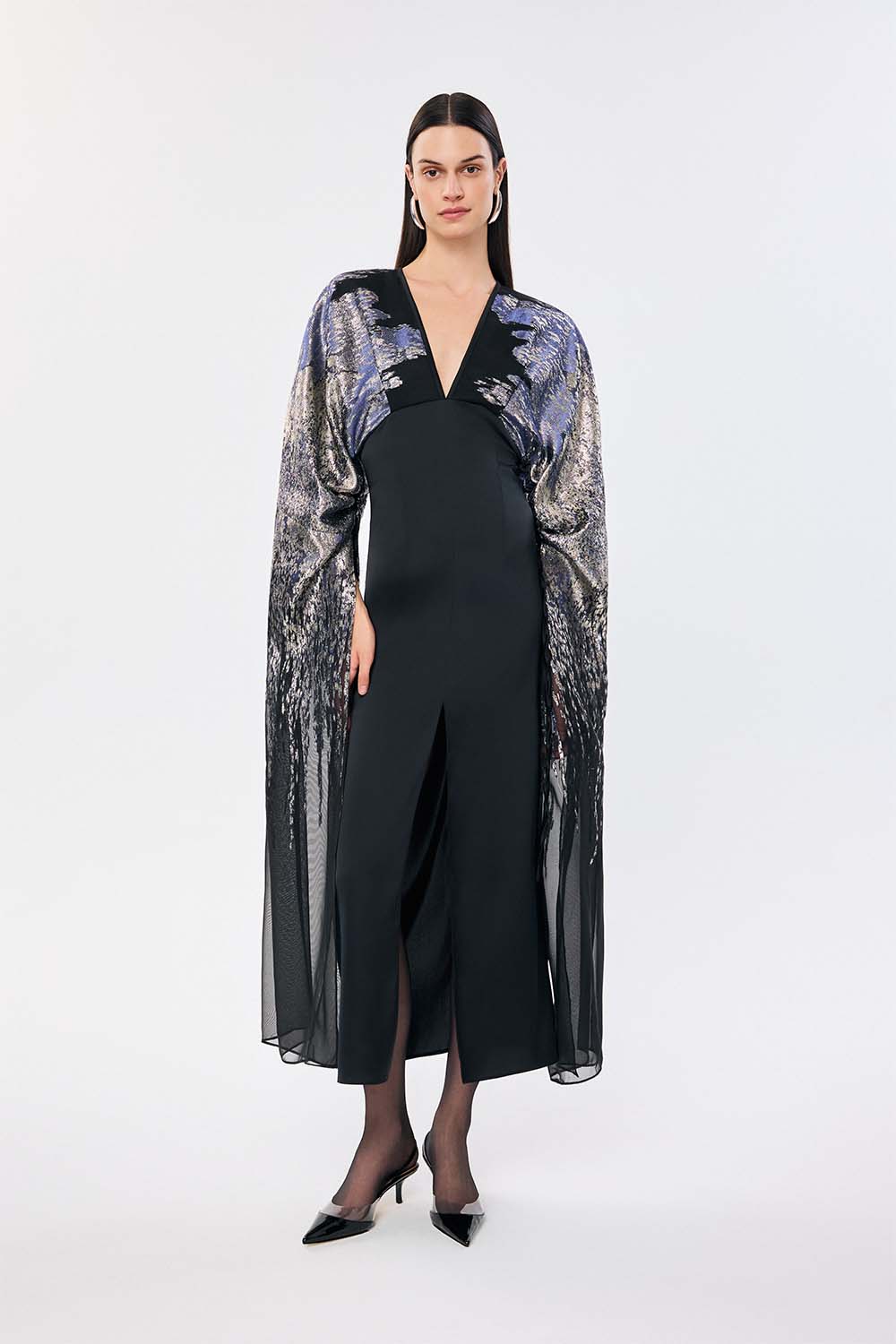 Aquila is a dramatic dress that merges celestial fantasy with sharp tailoring. Its deep V-neckline and sculpted waist create a statuesque silhouette, while the sheer, metallic sleeves cascade like stardust in motion. The ombré shimmer evokes the twilight sky, turning each gesture into a performance. Lightweight yet impactful, Aquila is designed for those who move like constellations and dress with intention.