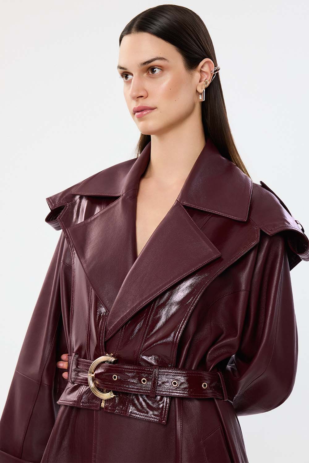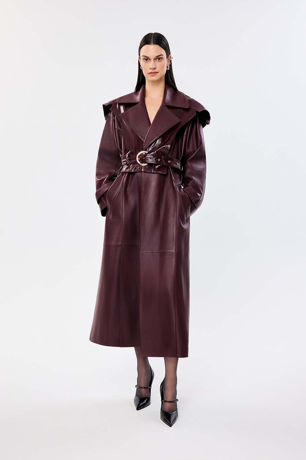 Arden is a commanding trench coat that redefines outerwear with presence and sensuality. The rich oxblood tone, wide lapels and belted waist speak of drama and determination, sculpting a silhouette that is both protective and empowering. Its glossy texture contrasts with the matte body, creating visual depth and movement.