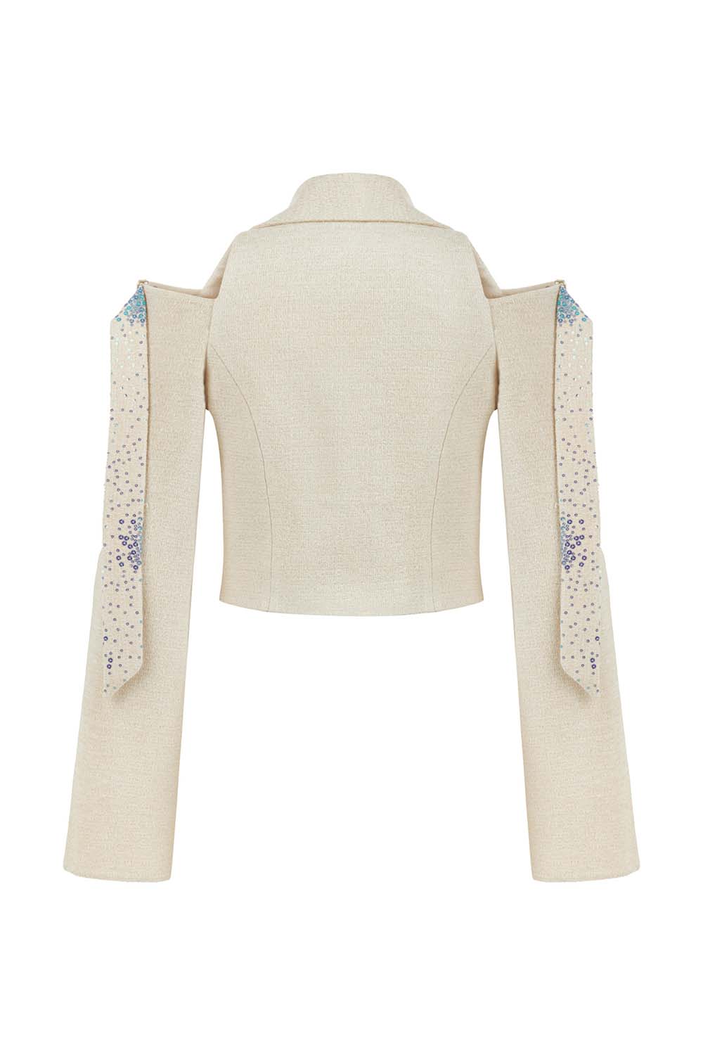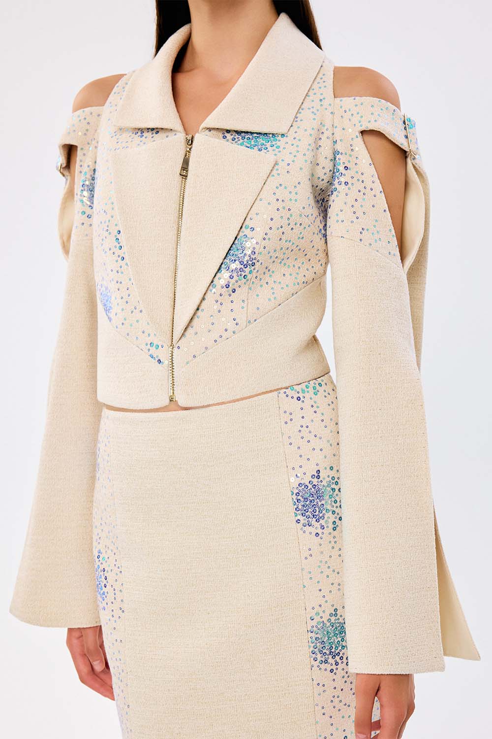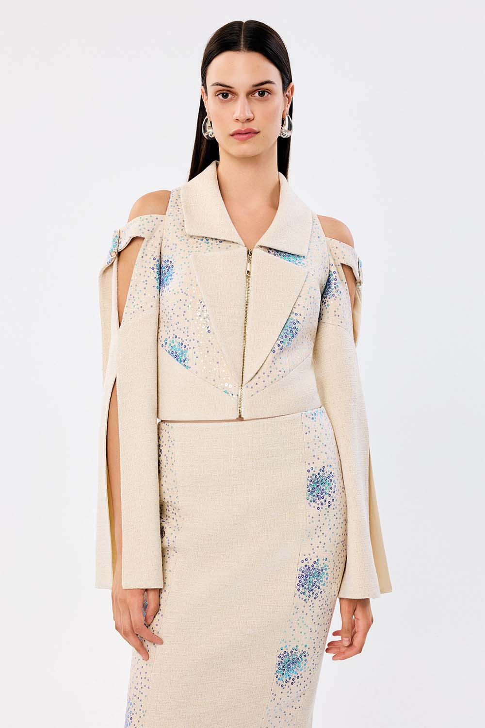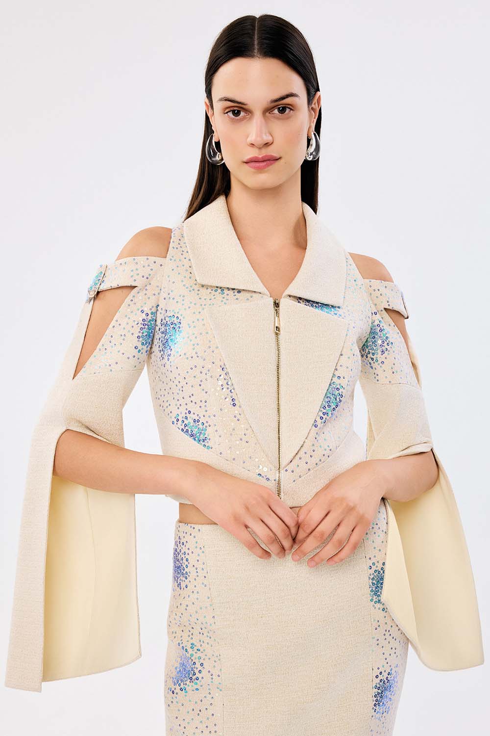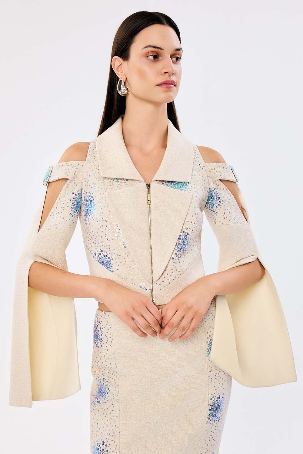 Gliese is a statement jacket where tailored precision meets celestial imagination. With structured shoulders and long layered sleeve extensions, this piece transforms movement into spectacle. Adorned with iridescent sequin bursts that echo star maps, Polaris is built for those who take up space unapologetically and shine without trying.