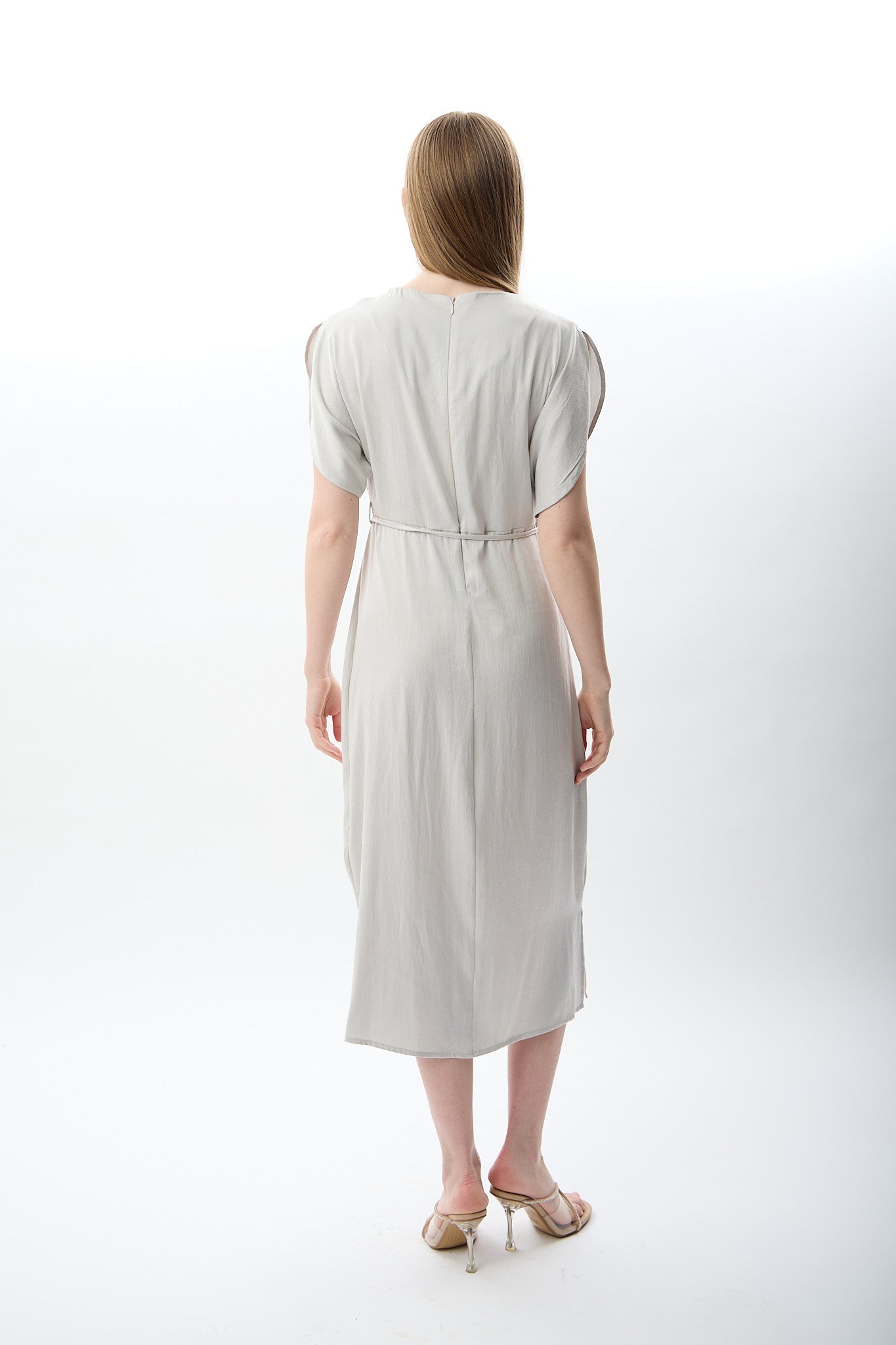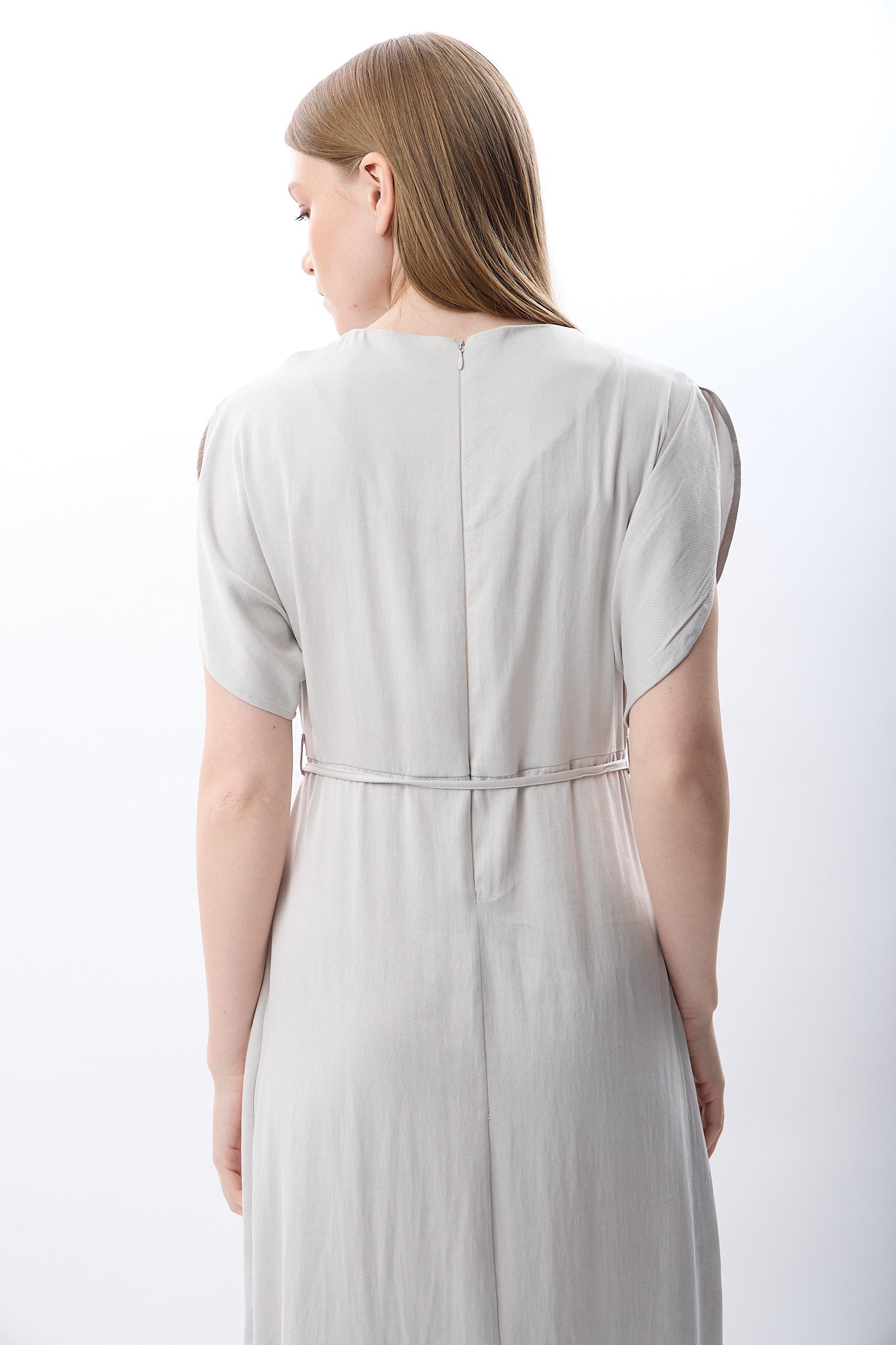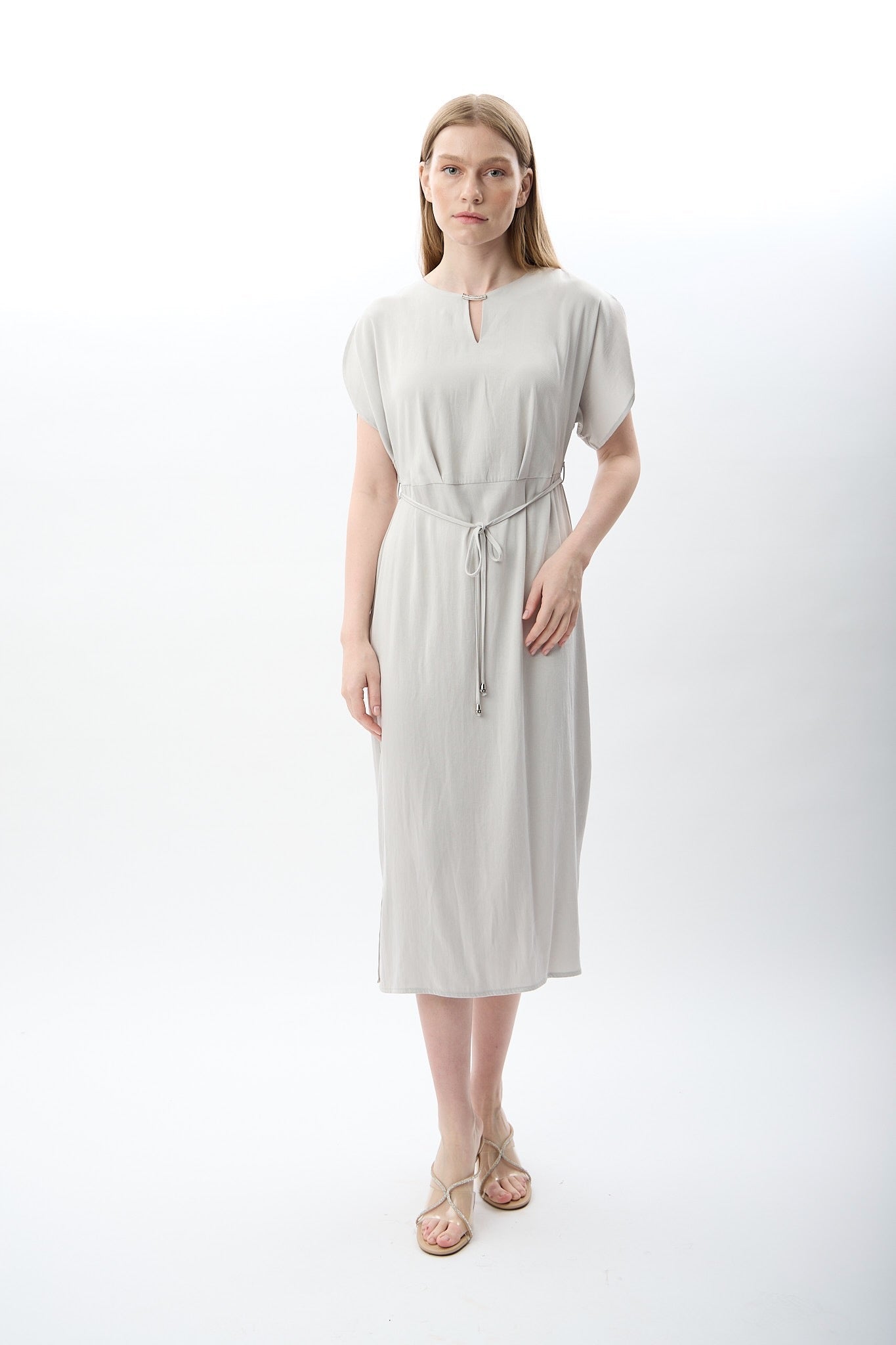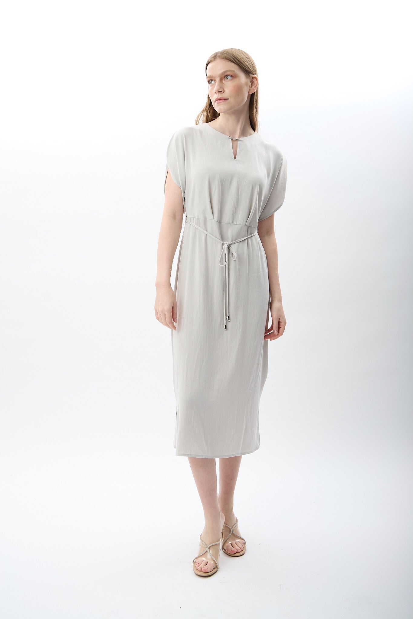 Belden Bağlamalı Yırtmaçlı Elbise (Gri)