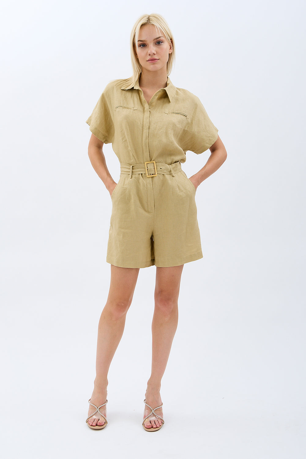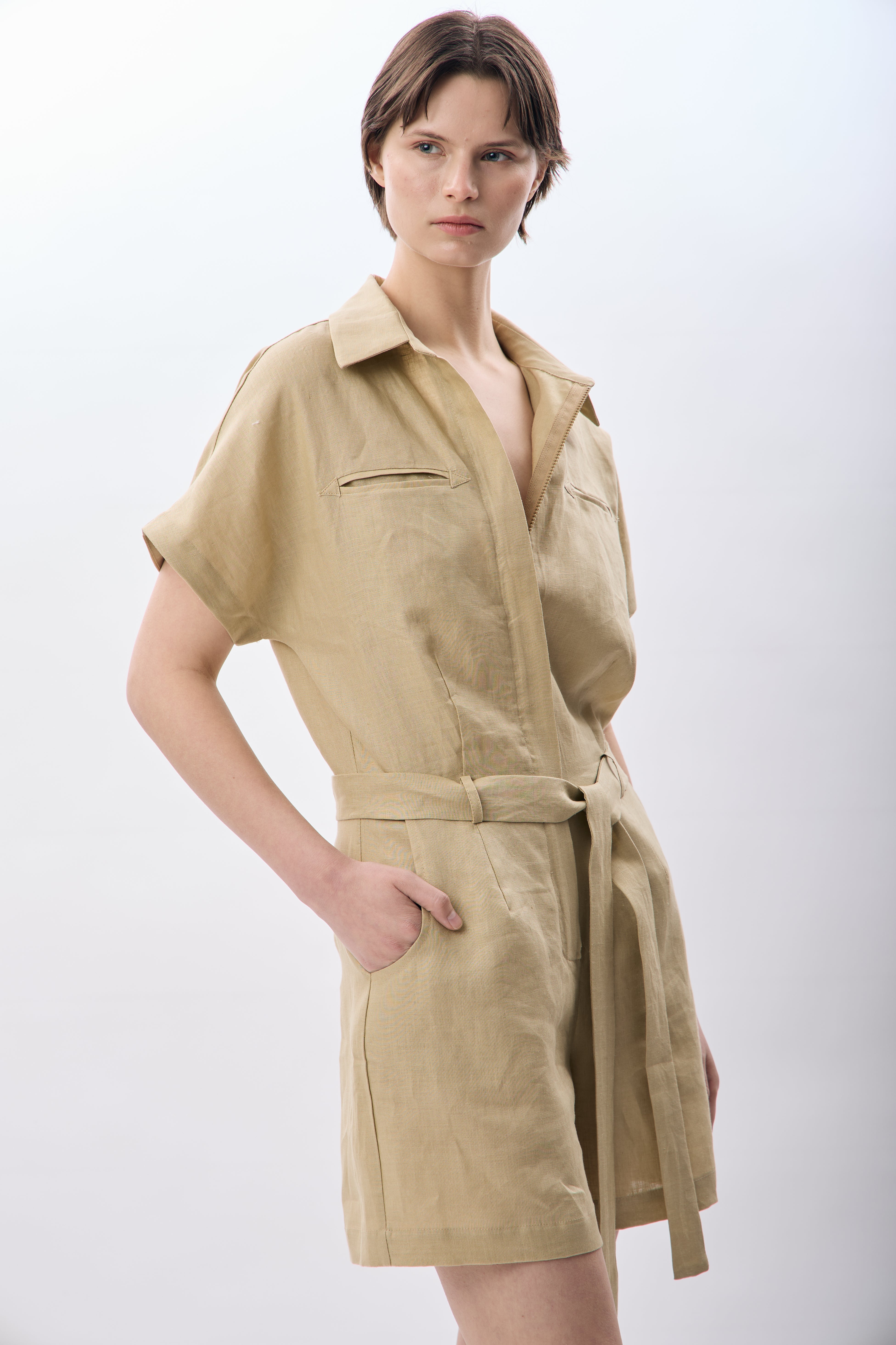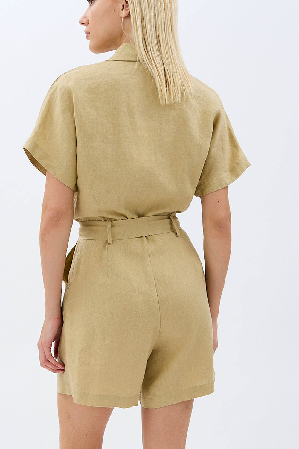 Gömlek Yaka Kemerli Keten Tulum – %100 Keten