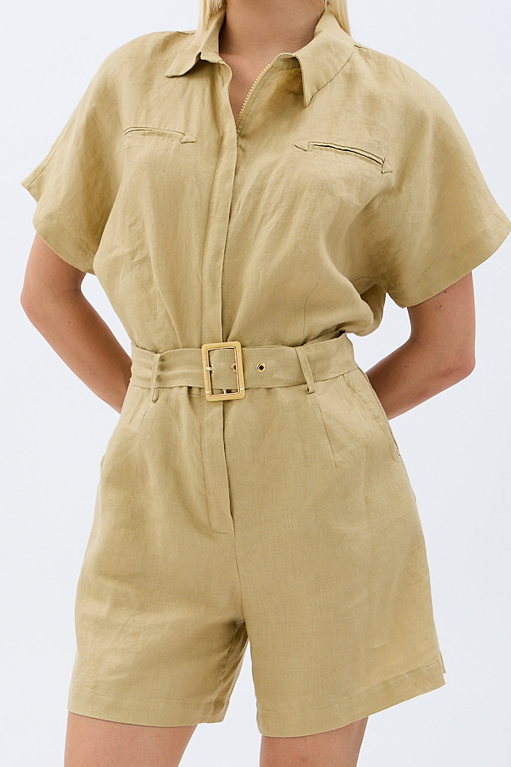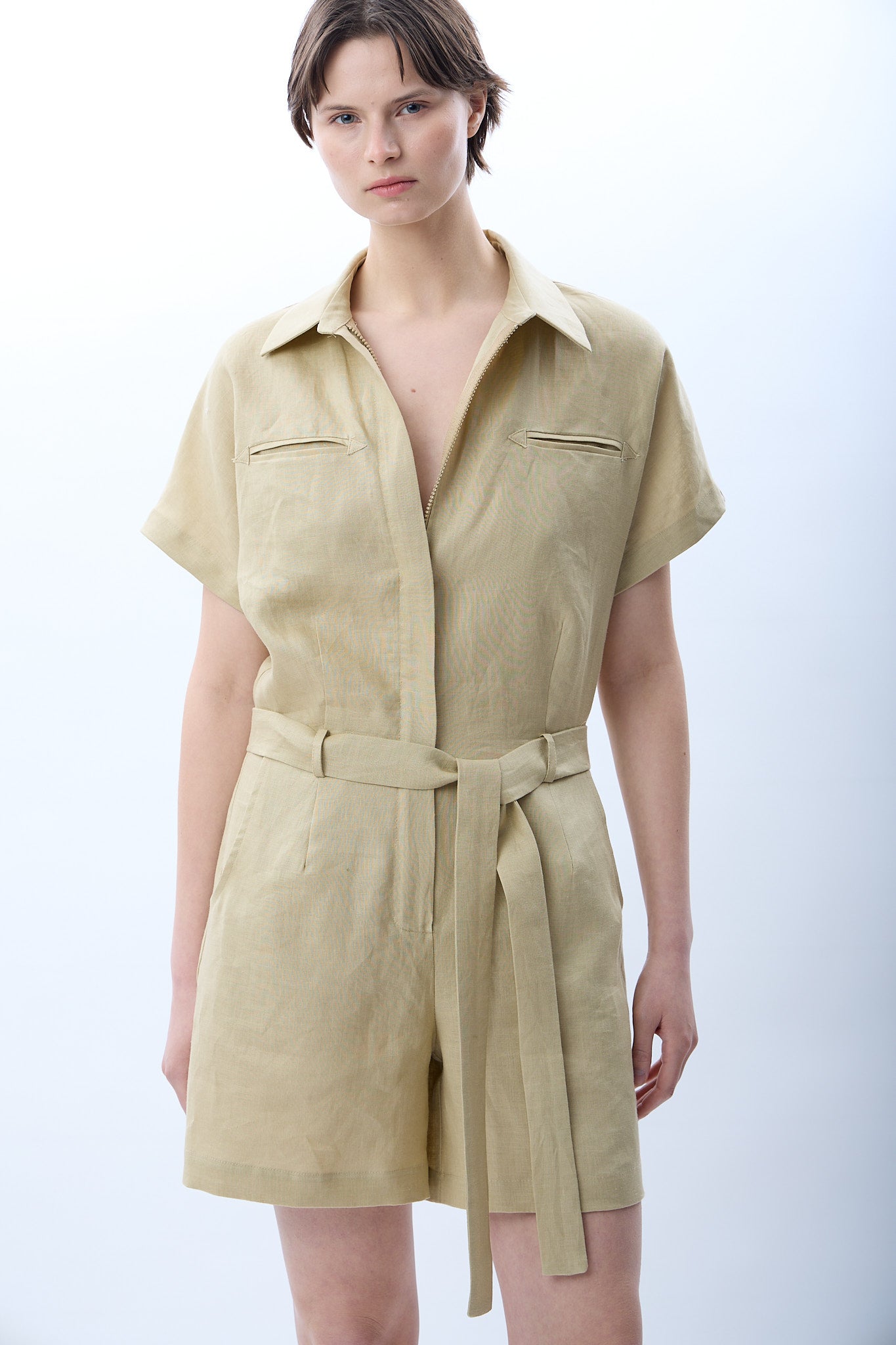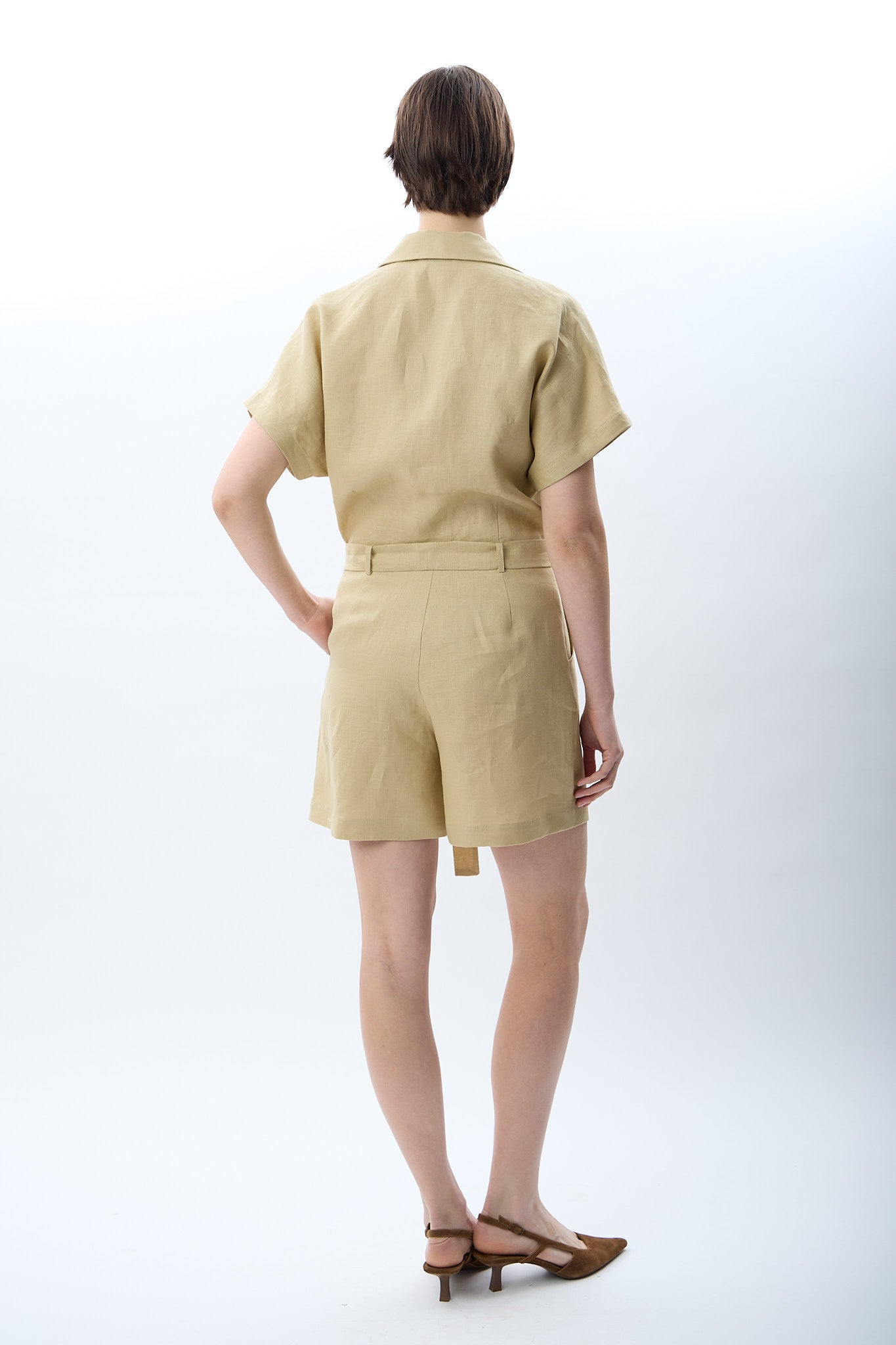 Gömlek Yaka Kemerli Keten Tulum – %100 Keten