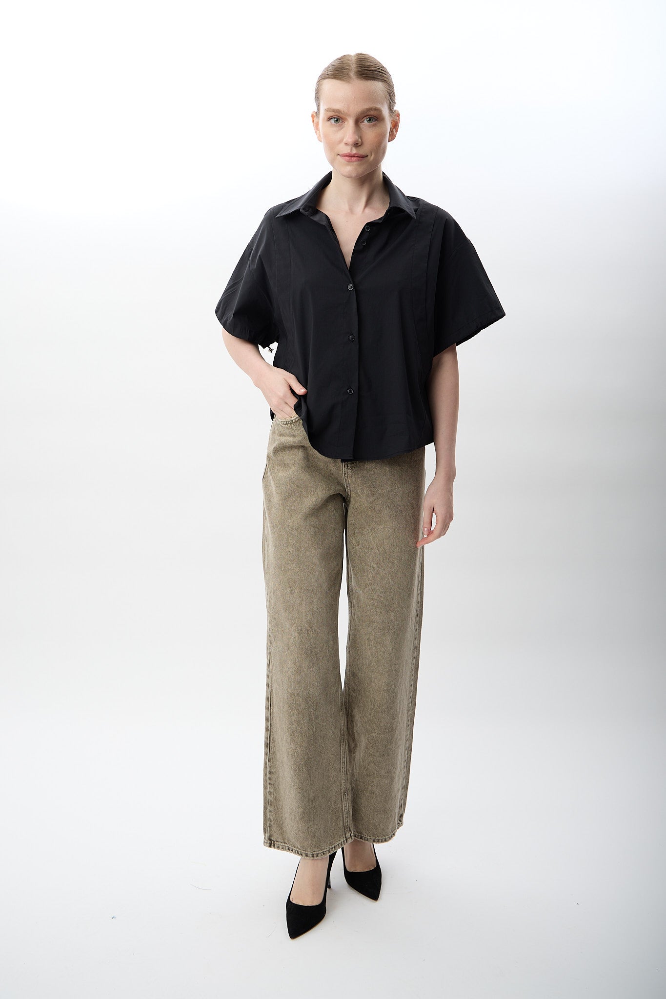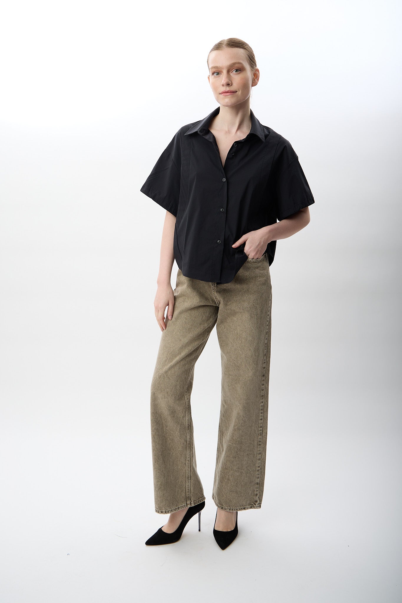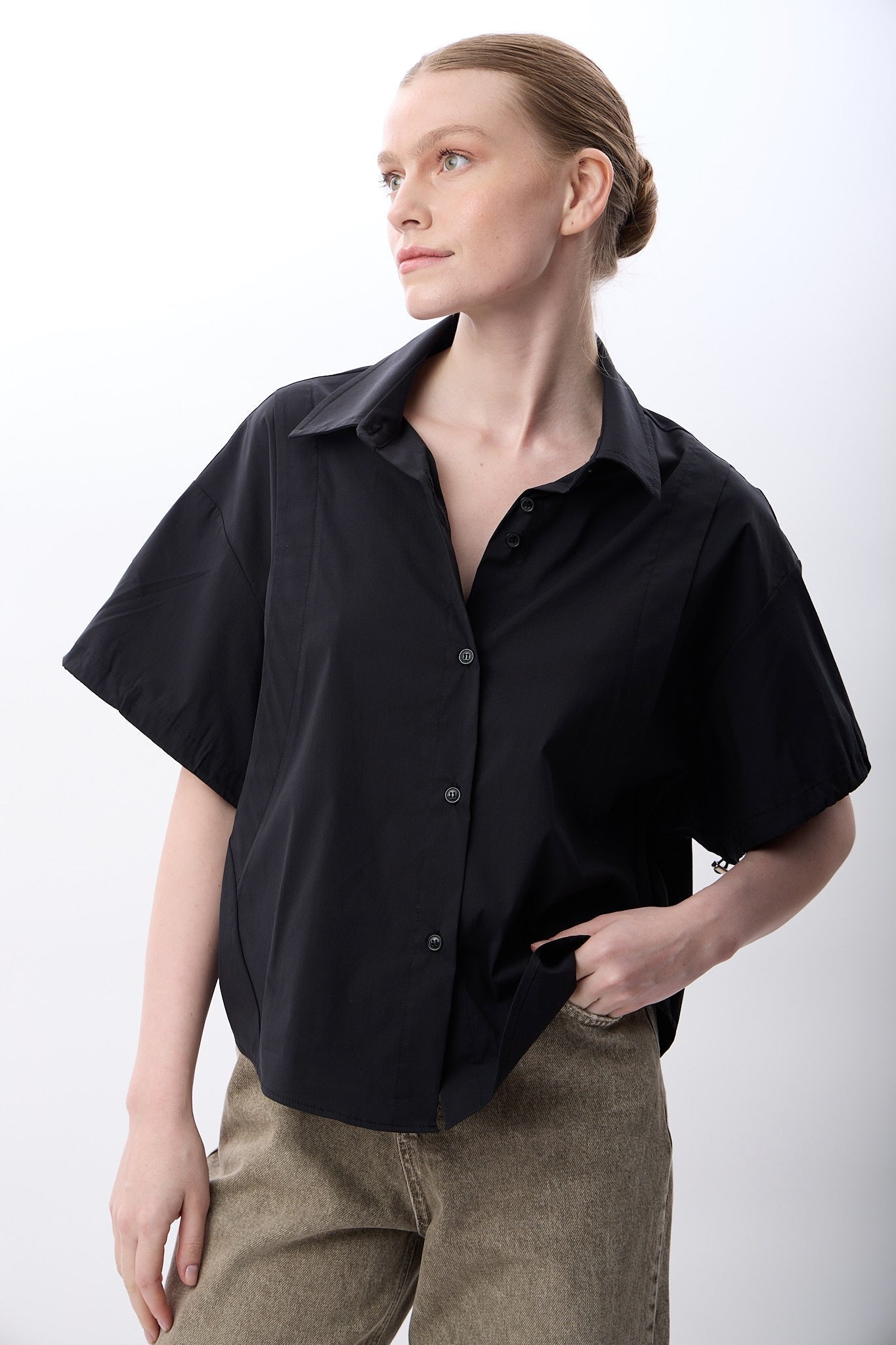 Düğmeli Oversize Crop Gömlek – Lastikli Kol Detaylı Rahat Kalıp