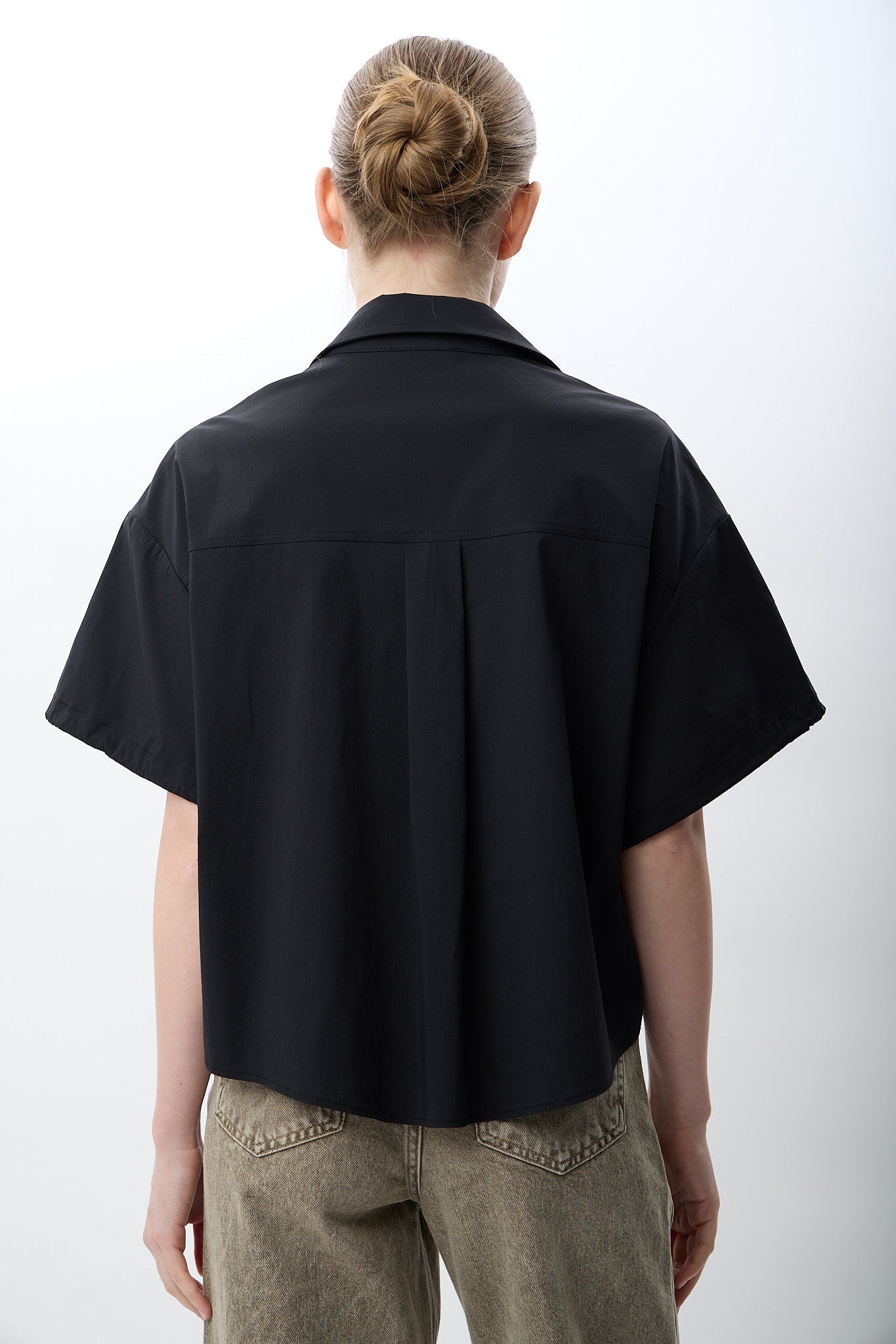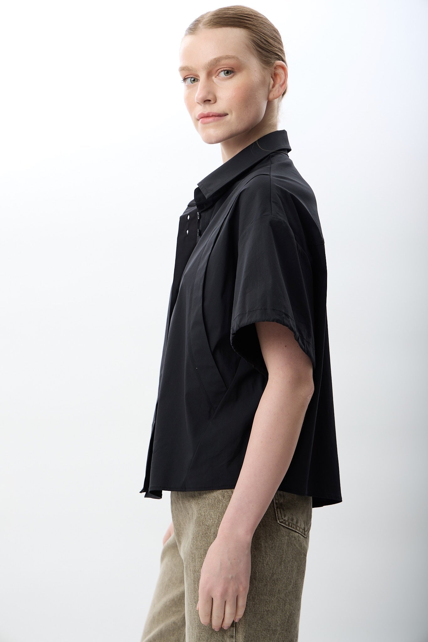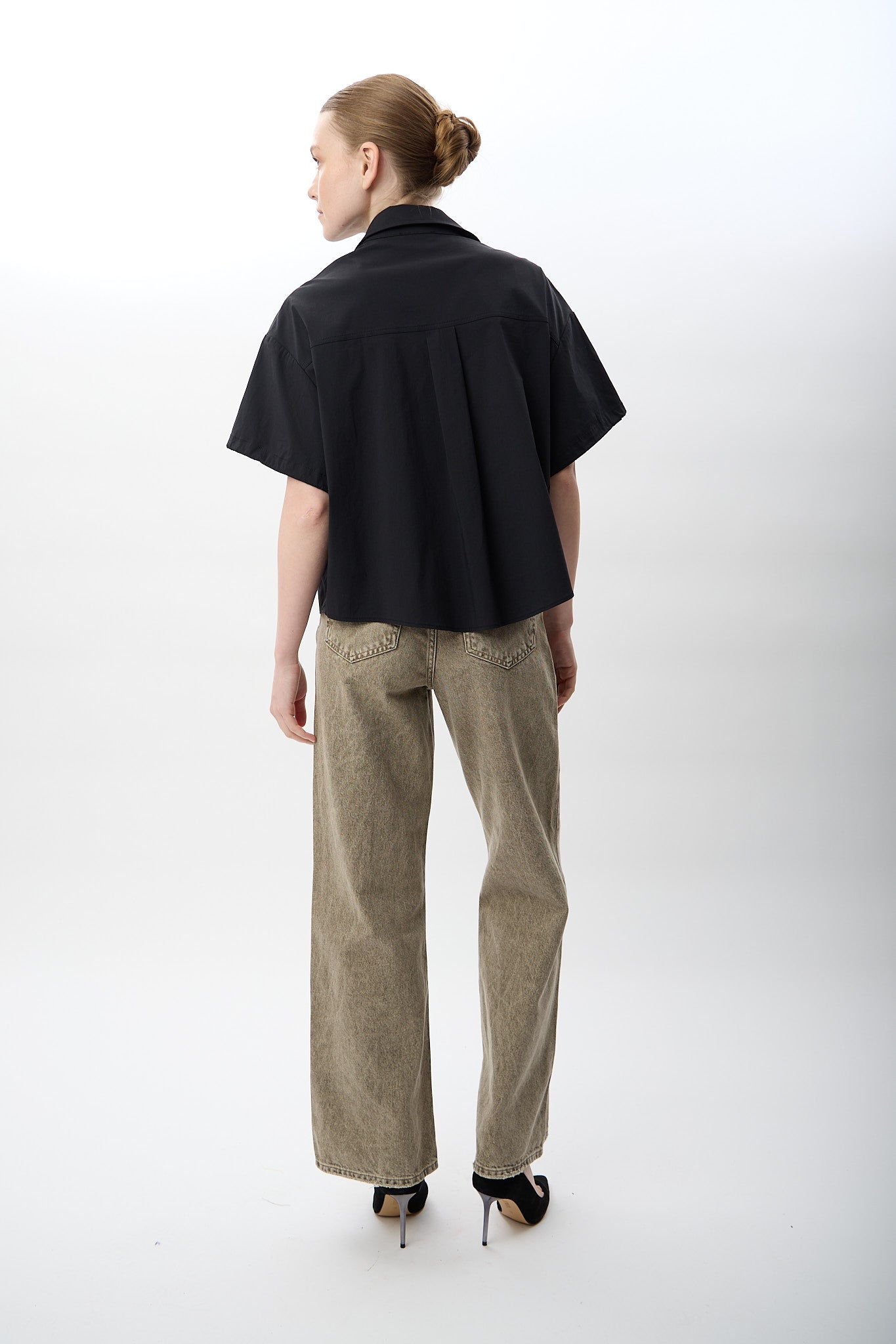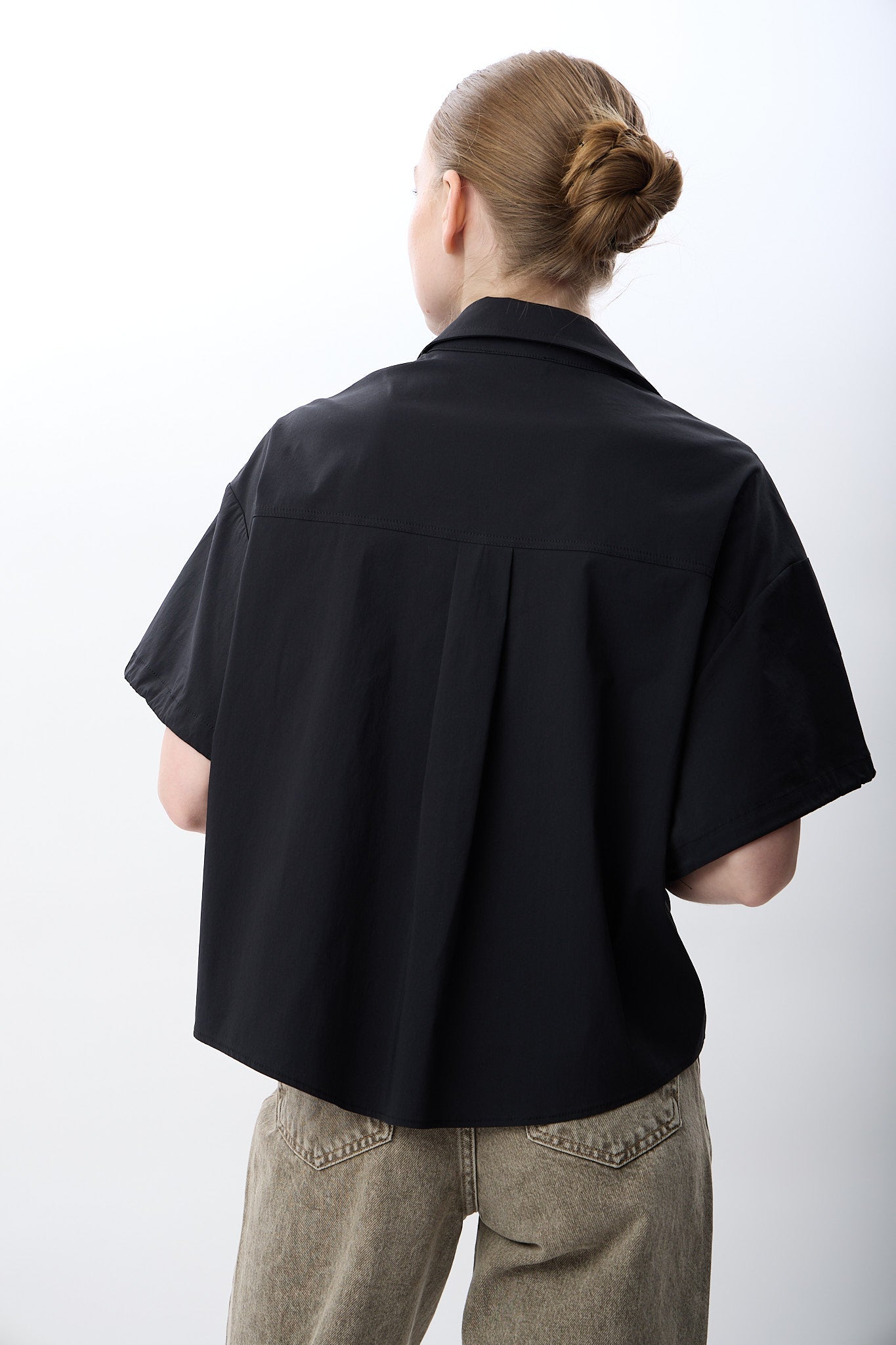 Düğmeli Oversize Crop Gömlek – Lastikli Kol Detaylı Rahat Kalıp