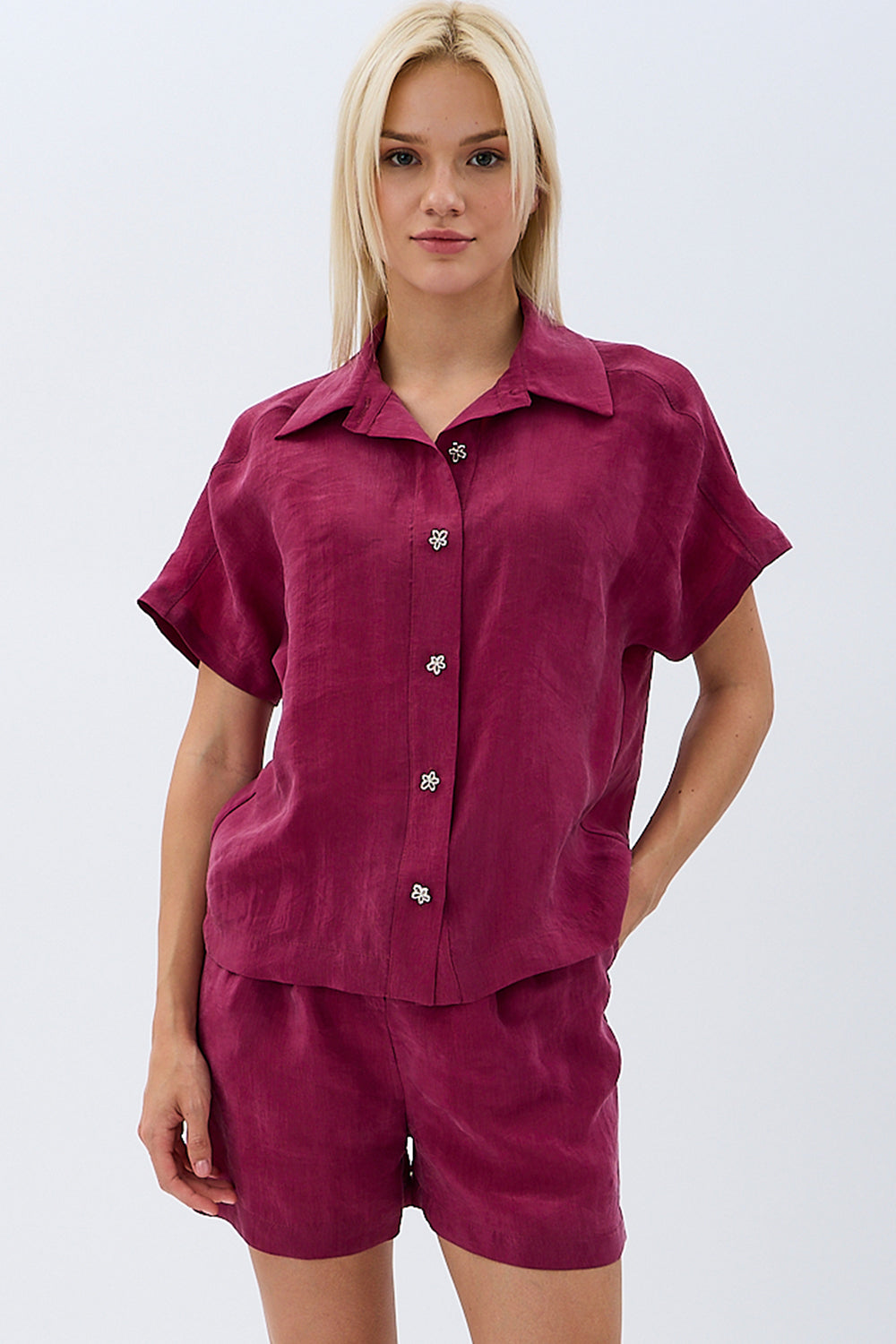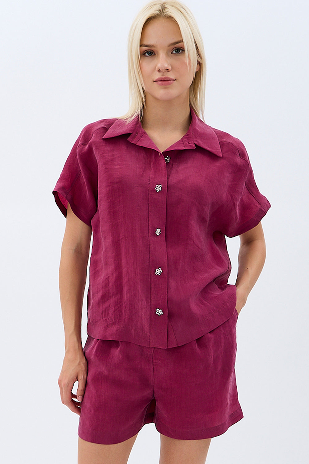 Model: Kısa kollu, düz kesim, klasik yaka, metal düğmeli ön kapama, göğüs cepli