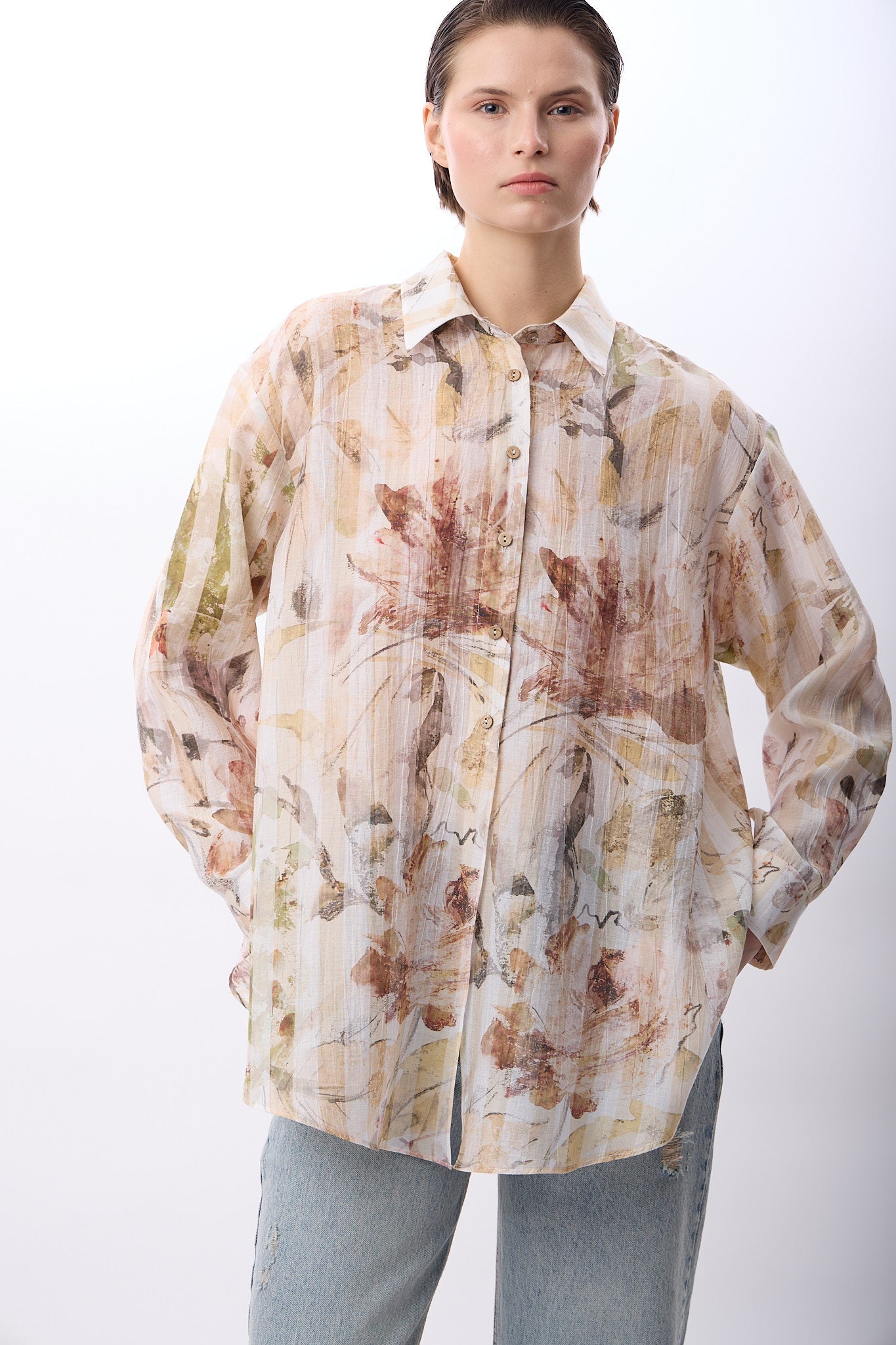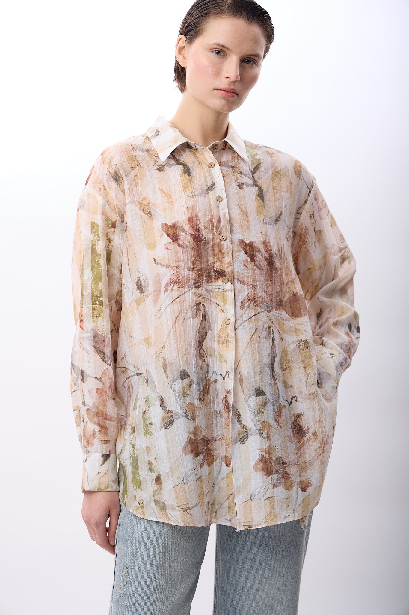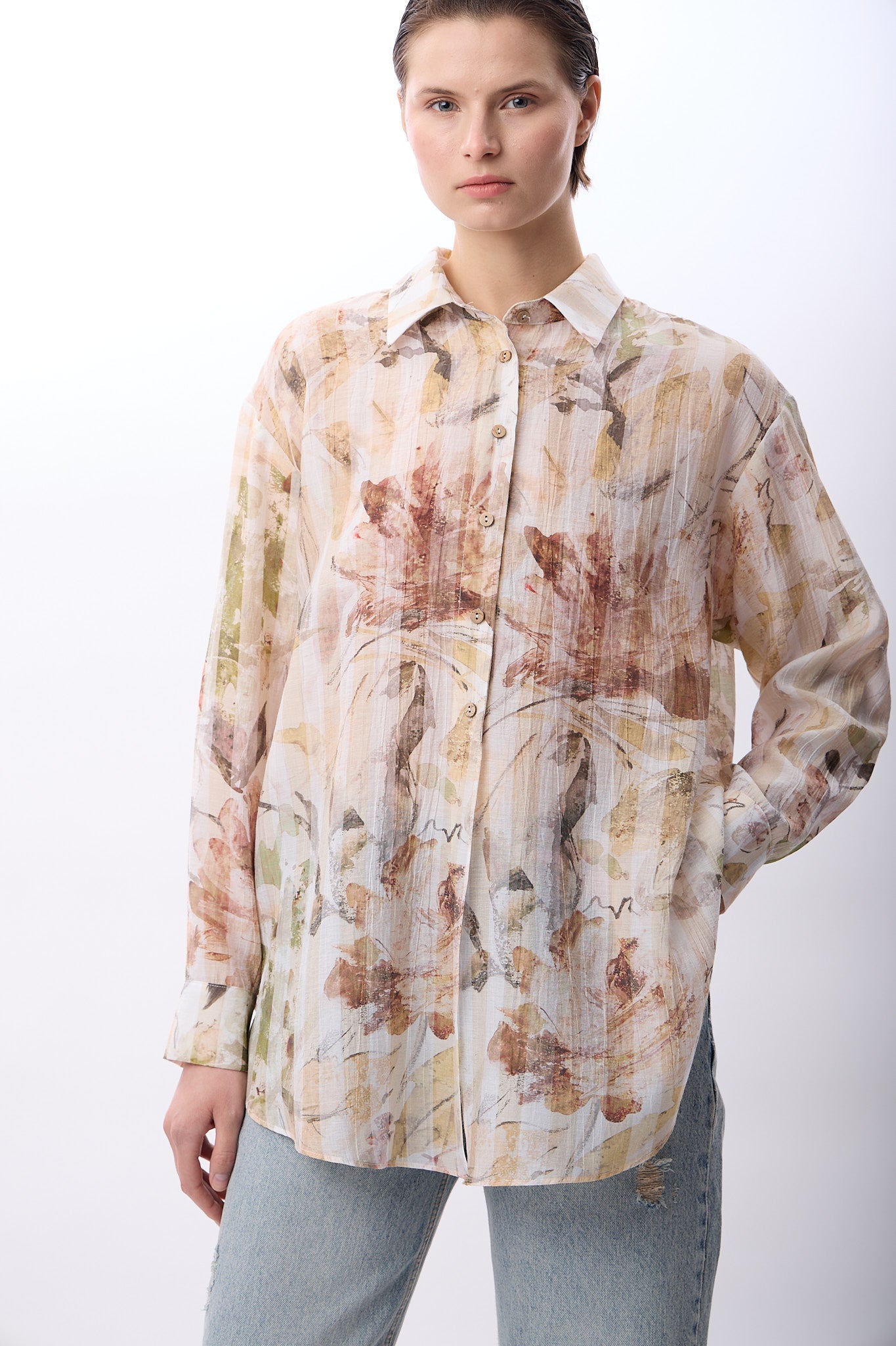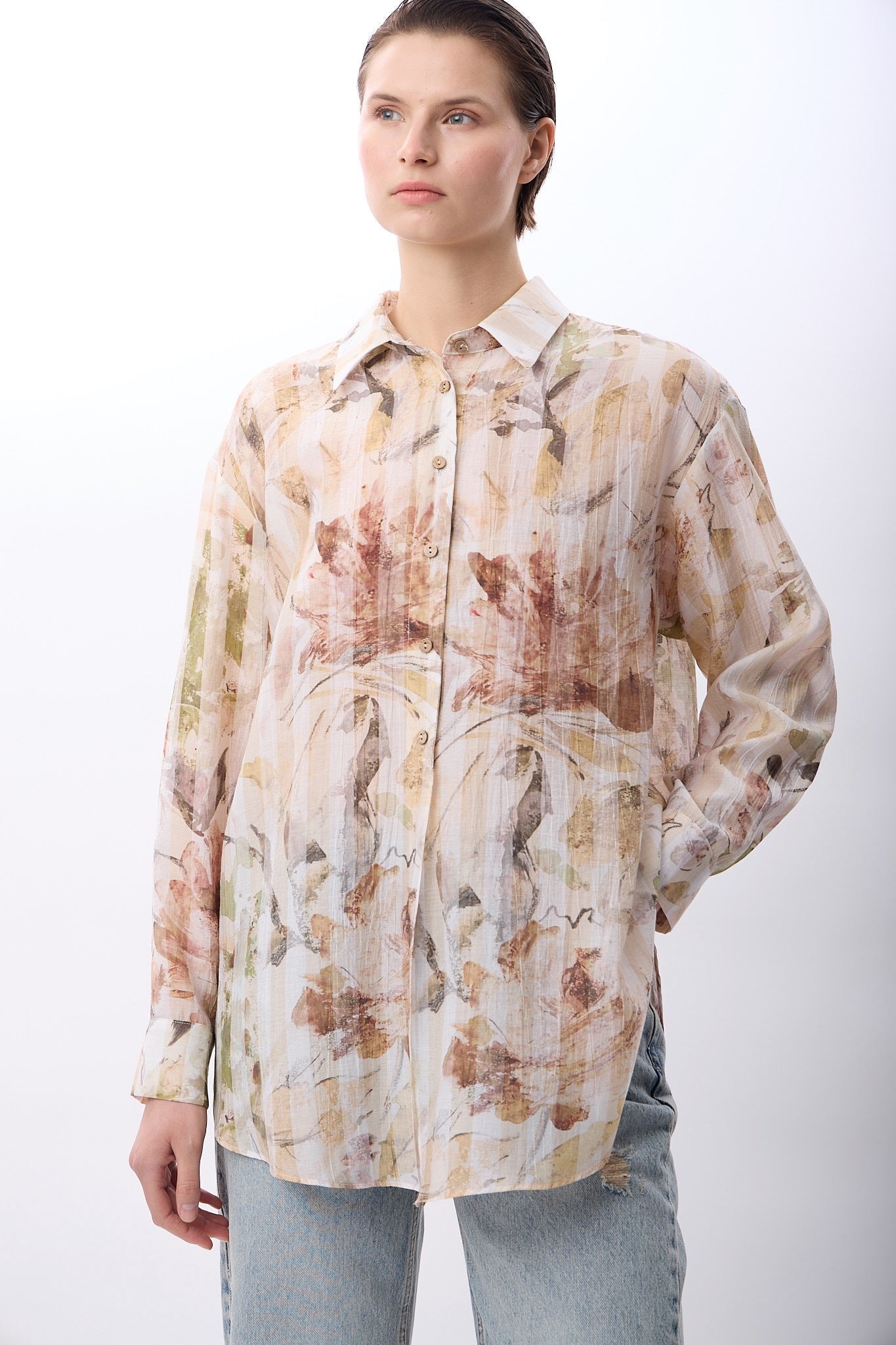 Uzun Kollu Çiçek Desenli Gömlek (Bej)